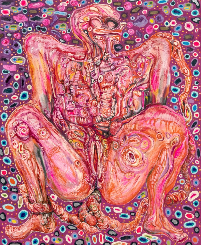 일전에 종로의 한 미술관에서는 자주 볼 수 없는 아주 쇼킹하고 그로테스크(Grotesque)한 그림을 보았다. 장파(본명 장소연) 작가의 그림이다. 필자 금삿갓이 미술에 문외한이지만 이런저런 들은풍월과 얼치기 눈높이에서 보고 느낀 대로 잡글을 쓰는 <금삿갓의 Eros, 애로서(曖露書)>를 연재하면 해외 작가의 기괴한 그림은 많이 보았다. 그런데 국내 작가의 그림은 아직 살펴보지 못하고 있다가 뒤통수가 띵하게 울리는 작품들을 보고 급히 몇 글자 적지 않을 수가 없었다. 모든 작품이 그런 건 아니지만 금삿갓의 눈길을 유독 사로잡은 작품들이 너무 멋지다. 먼저 아래 자품은 <Gore Deco-Emily> 이다. 캔버스 전체에 흘러넘치는 선홍색과 그에 대조되어 간간히 양념 바르듯이 조화를 이룬 다양한 색감이 우선 눈을 현란하게 한다. 고대에서 현대에 이르는 전통적인 여성의 아름다음에서 오는 성적 욕망과 에로티즘을 완벽하게 해체하고, 특별하게 정의할 수는 없지만 뭔가 색다른 시각에서 재해석하는 에로스의 근원을 보는 것 같다. 금삿갓의 눈에는 “눈과 입과 여성 성기”라는 비슷한 모양의 구멍들을 특별히 무시하거나 강조하여 여성성을 해체한 것처럼 보인다. 세상의 모든 억압과 생각, 물질 등 그로부터 발생하는 속박과 부조화를 온몸 가득 끌어안고 세상을 향해 소리 없이 항의하는 듯하다.