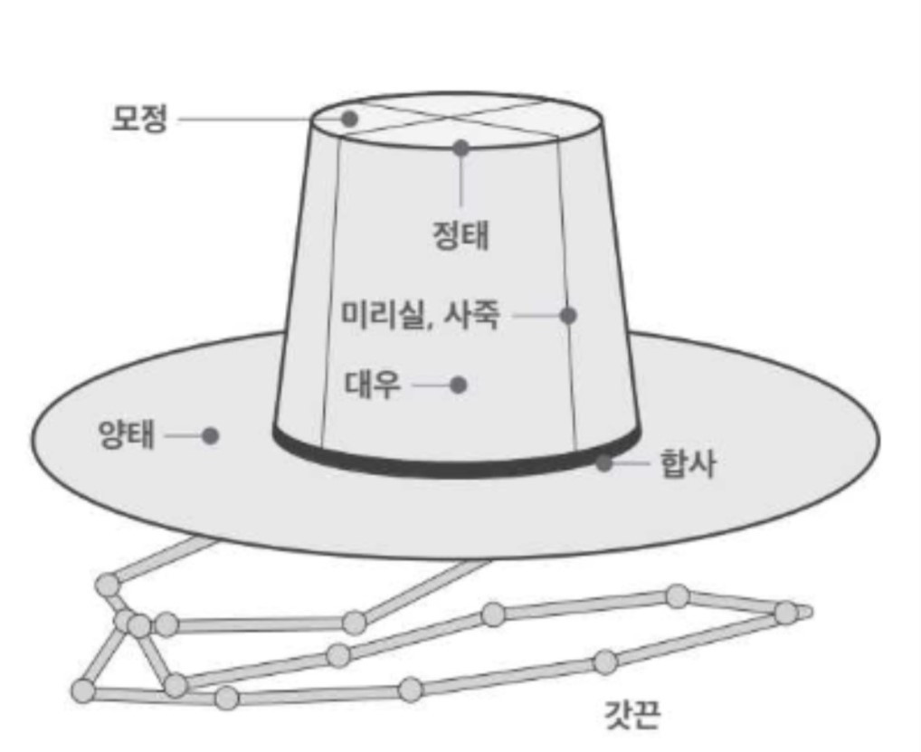 <갓의 구조 : 서울역사박물관>갓은 크게 세 부분으로 나누면 상투와 머리 부분에 쓰는 대우, 햇빛을 가기는 챙인 양태(凉太)와 묶는 줄인 갓끈(립영, 笠纓)으로 구성된다. 이런 멋진 모자인 갓을 쓰는 데도 그에 알맞은 방법이 있다. 이를 지키지 않으면 갓 쓰고 망신당하기 일쑤이다. 그래서 이덕무(李德懋, 1741∼1793)는 <사소절(士小節)>에서 갓을 쓸 때 주의할 점을 몇 가지 기록해 두었다. “첫째, 갓의 끈이 넓어서는 안 된다. 갓이 비록 낡았더라도 단정하게 쓰도록 해야 한다. 둘째, 망건(網巾)은 머리를 거두기만 하면 되므로 바짝 졸라매서 이마에 눌린 자국이 있도록 해서는 안 되고, 느슨하게 매어 살쩍이 흐트러져 있게 해서도 안 된다. 눈썹을 덮어 누르도록 해서도 안 되고 눈초리가 당겨 올라가도록 해서도 안 된다. 셋째, 선비가 비록 바쁘고 피곤하더라도 머리 위에는 잠시라도 갓이 없어서는 안 된다. 다만, 감옥에 갇혀 있는 죄수나 부모의 상(喪)을 당하여 머리를 풀고 있는 자식은 갓이 없어도 좋다. 넷째, 갓을 푹 눌러쓰고 갓 밑에서 곁눈으로 남의 기색을 살피는 것은 바른 기상을 가진 자라면 할 짓이 아니다. 다섯째, 갓을 쓸 때는 갓을 젖혀 써서도 안 되고, 갓끈을 손으로 잡고 있어서도 안 되며 흐트러지게 해서도 안 된다. 또한, 갓끈이 귓등으로 지나가게 해서도 안 된다. 여섯째, 갓에 대로 만든 갓끈을 다는 것은 시골에서는 무방하나 도시에서는 삼가는 것이 좋다. 복건(幅巾)에 갓을 덧쓰는 것은 편리한 점이 있으나 그런 모습으로 문밖으로 나가서는 안 된다.” 정말 조금도 흐트러지지 않는 선비의 자세를 강조하는 듯하다. 옛 선비들의 멋이 21세기에 들어와서 후손들보다 더 세계인들의 눈길을 사로잡고, 열광하는 것을 보니 우리 민족의 멋에 대한 콘텐츠 확장이 무궁무진한 것 같다.(금삿갓 芸史 琴東秀)