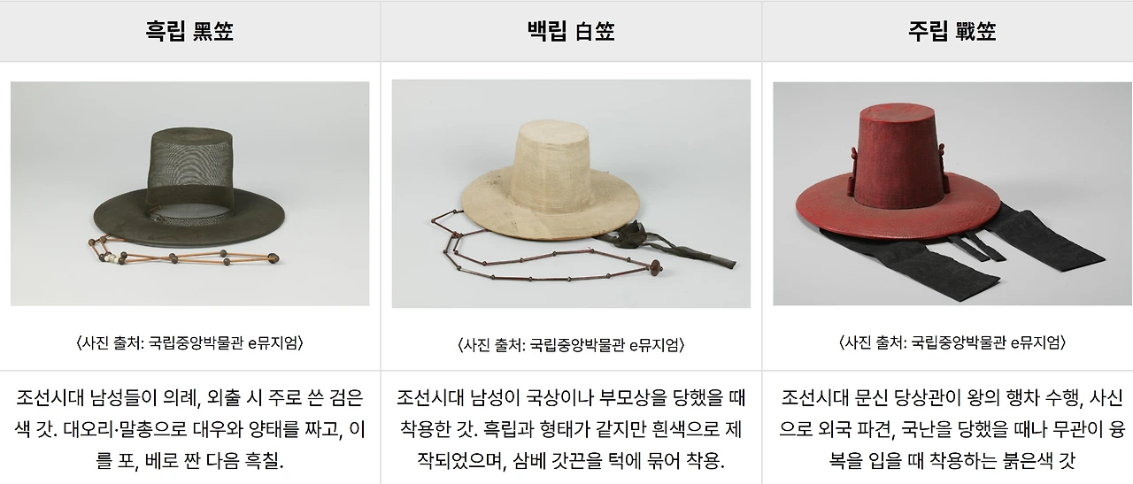 2019년 넷플릭스에 오픈한 한국판 좀비물 <킹덤(Kingdom)> 속 조선의 갓과 모자는 세계인의 마음을 사로잡았다. 그로 인해 2025년 현재까지 한국 드라마로서는 시리즈 4까지 계속 제작되고 있으며, 전 세계인은 한국의 갓과 모자에 빠져들기 시작했다. 2025년 전 세계는 판타지 애니메이션 <케이팝 데몬 헌터스>에 열광하고 있다. 그중 사자보이즈가 쓴 갓이 선풍적인 인기를 끌고 있다. 이 때문에 바티칸에 세워져 있는 김대건 신부상까지 더 주목받고 있다고 한다. 김대건 신부의 갓이 사자보이즈와 유사하기 때문이다. 그런데 이렇게 외국인이 한국의 갓에 열광하는 것은 어제오늘의 일이 아니다. 나폴레옹 이래로, 100여 년 전에 한국을 찾은 외국인은 조선의 모자에 주목했다. 샤를 바라(Charles Varat)는 <조선기행(Deux Voyages en Coree)>에서 "조선은 모자의 천국이라 할 만하다. 이들의 모자 패션은 파리인들이 꼭 알아둘 필요가 있다."라고 했다. 모자는 당시 서양에서도 흔히 볼 수 있는 패션 아이템이었음에도 불구하고 그들의 눈에는 조선의 모자가 매우 독특했을 것이다. 그 당시 조선은 모자의 니라이다. 의관 정제(衣冠整齊)를 중시하였던 조선의 성인 남자들은 잠을 잘 때 이외에는 언제 어디서나 반드시 모자를 썼다. 모자를 쓰지 않은 '맨 상투차림'은 유교적 예(禮)에 어긋나는 일로 여겼고, 모자의 왕국이라 불릴 만큼 때와 장소 및 신분에 따라 다종다양한 모자를 착용하였다. 공식적인 자리에는 공복(公服)에 사모(紗帽)를, 즉위식이나 왕실 제례 등 의례적인 행사에는 조복(朝服)에 금관이나 제관을 썼다. 평상시 밖에 나갈 때는 갓을 비롯하여 패랭이·초립(草笠)·벙거지·방립(方笠)·삿갓 등을 썼다. 물론 실내에서도 예외는 아니어서 탕건(宕巾)·정자관(程子冠)·방관(方冠)·복건(幅巾)·동파관(東坡冠)·충정관(沖正冠) 등 유건(儒巾)을 썼다. 추운 겨울에는 이엄(耳掩)·휘항(揮項)·풍차(風遮) 등 방한용 모자를 썼다. 그래서 모자의 종류별 명칭은 관(冠)·면(冕)·건(巾)·변(弁)·모(帽)로 나뉜다. 이러한 많은 조선의 모자들 중에서 선비들이 가장 애호한 모자는 갓(黑笠)이다. 선비들은 대나무와 말총을 주재료로 삼은 초립(草笠)이나 마미립(馬尾笠)을 사용하였고, 먹칠과 흑칠을 더한 흑립을 착용하였다.