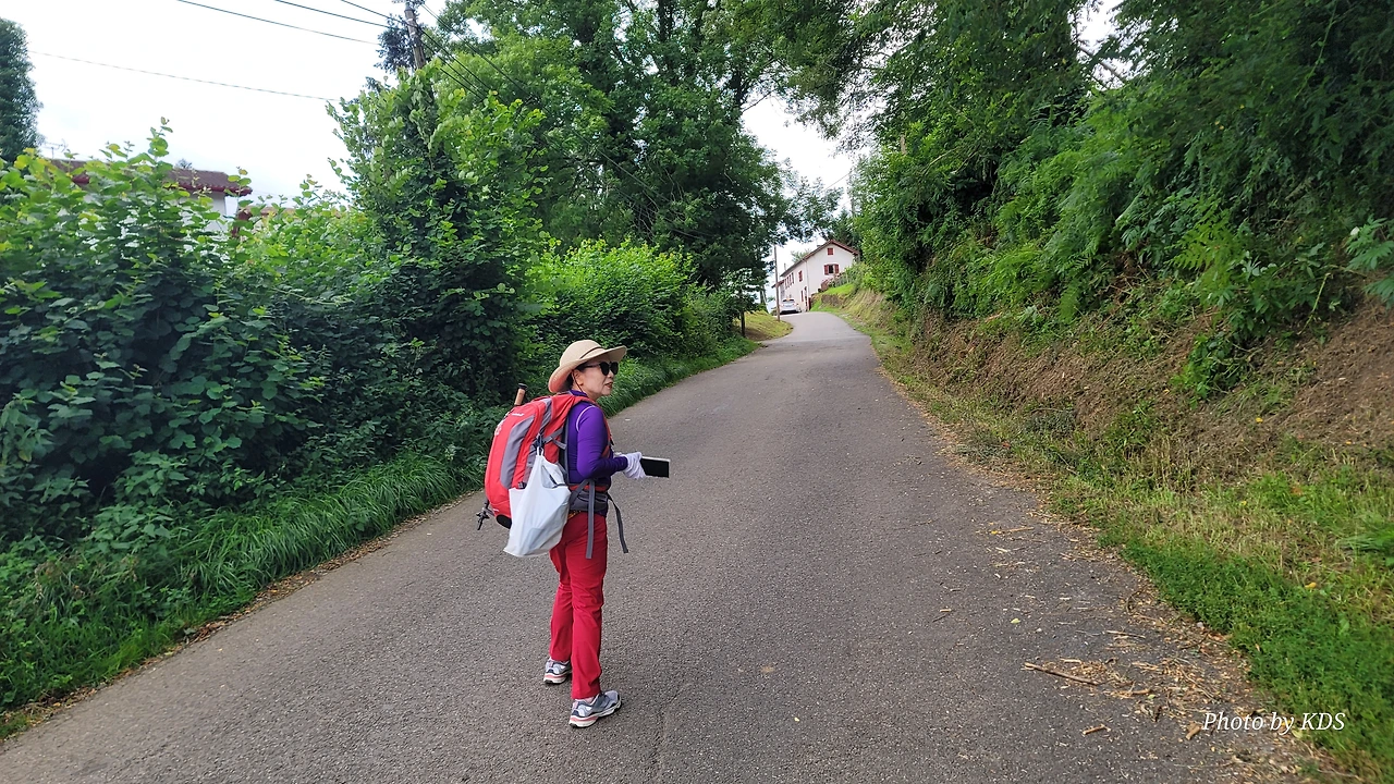 아직까지는 산길이 아니고 아스팔트로 잘 포장되어 있어서 한국에서의 등산과는 비교할 수 없이 편하다. 최고 고도 1,420m를 넘어야 한다고 글로만 읽고 엄청 걱정했는데, 완만한 경사도로 북한산 등산에 비하면 식은 죽 먹기다. 무거운 배낭을 지고 있지만 주변 경치를 즐기기에 충분하다. 길섶에는 싱싱하게 자라는 풀들과 가축들의 목장이 즐비하고, 저 멀리 끝없이 산들이 보인다.