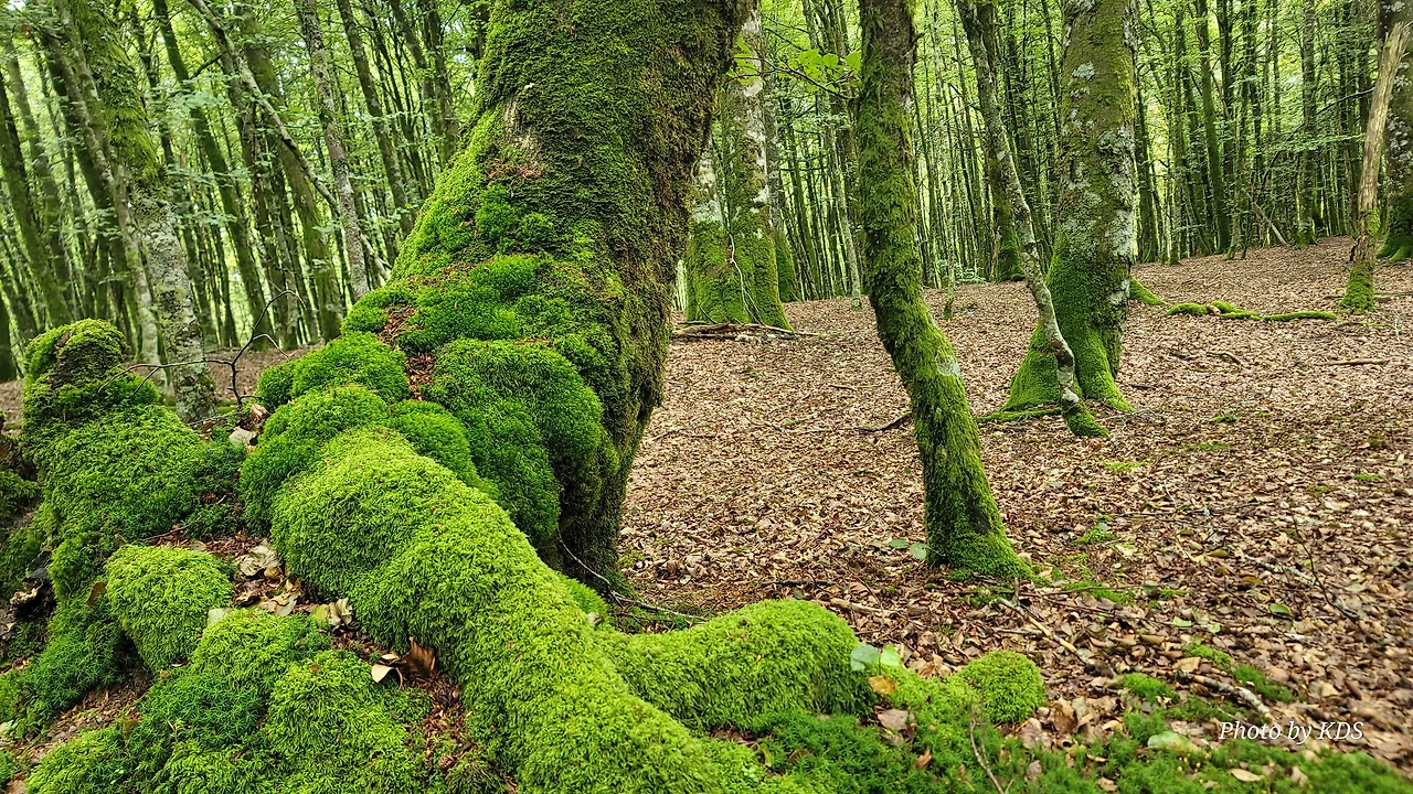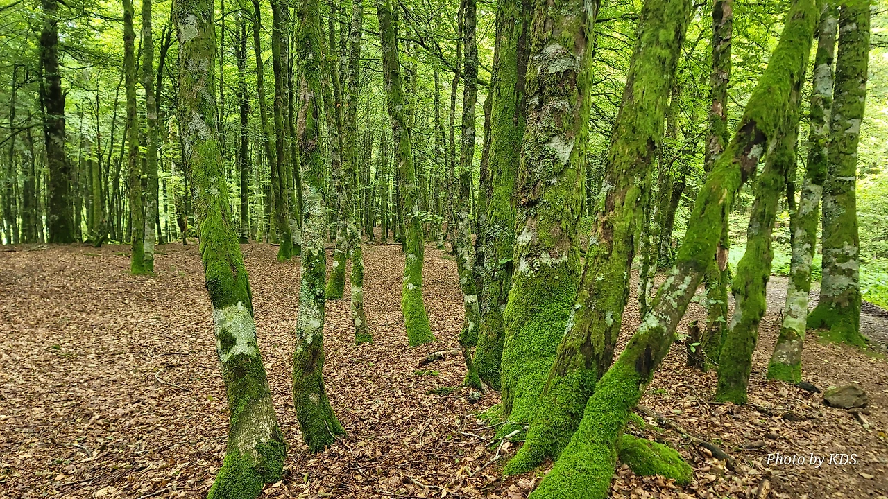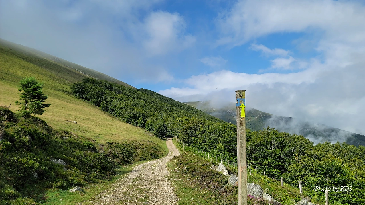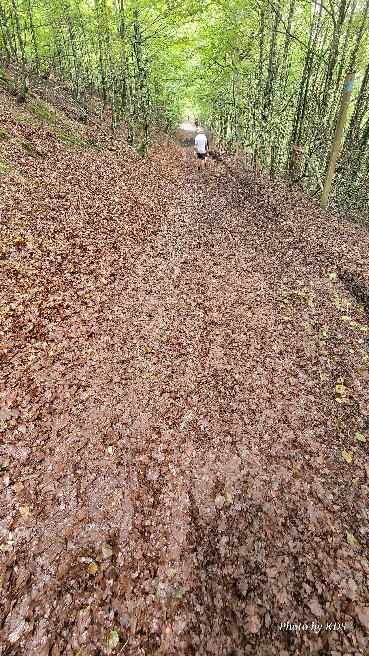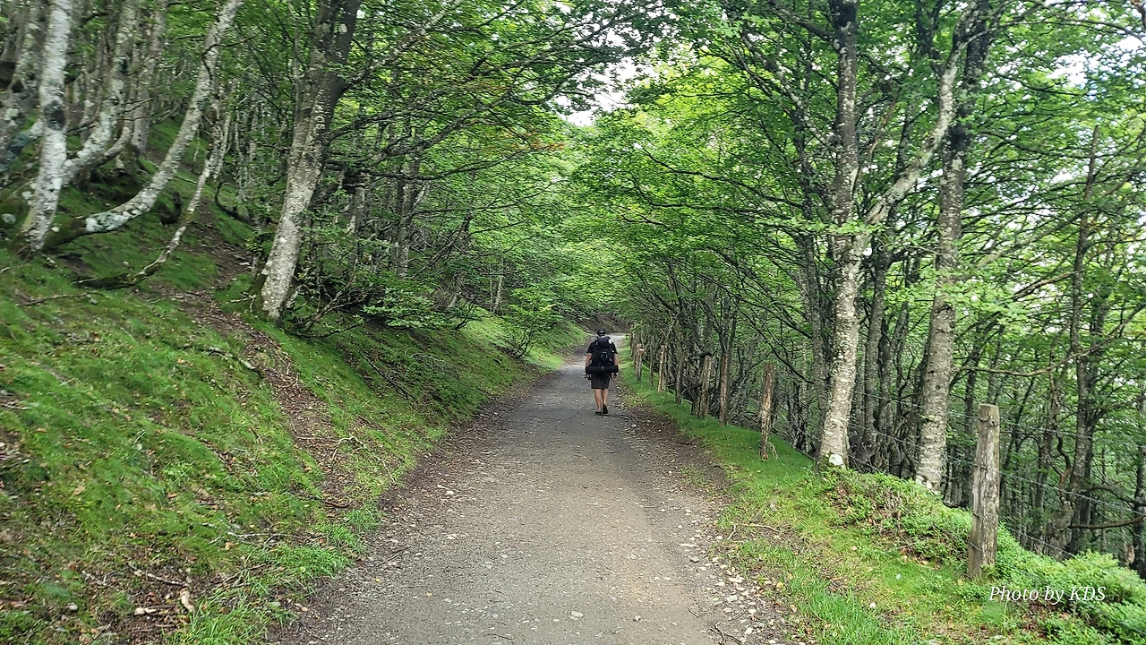 프랑스 쪽은 나무가 거의 없이 저 푸른 초원으로 되어 있는데, 스페인 구간은 울창한 활엽수림으로 덮인 길이 순례객을 반긴다. 태양이 그리 뜨겁지 않은 날씨라서 굳이 그늘이 필요하지는 않지만 그래도 그늘이라 기분이 좋다. 오히려 한국의 가을날처럼 싸늘한다. 숲이 울창하여 하늘이 잘 보이지 않을 정도로 숲이 잘 발달되어 있다.