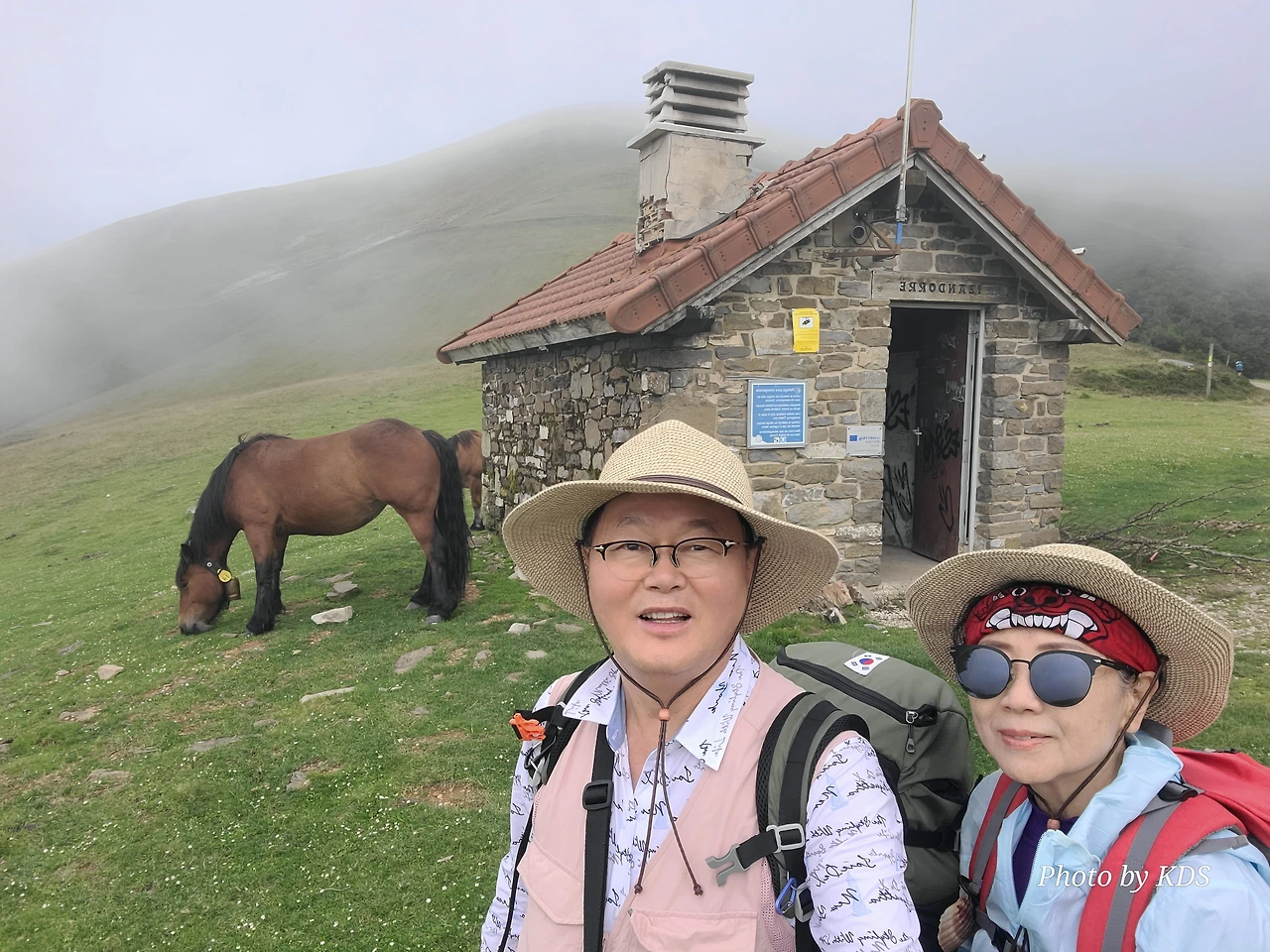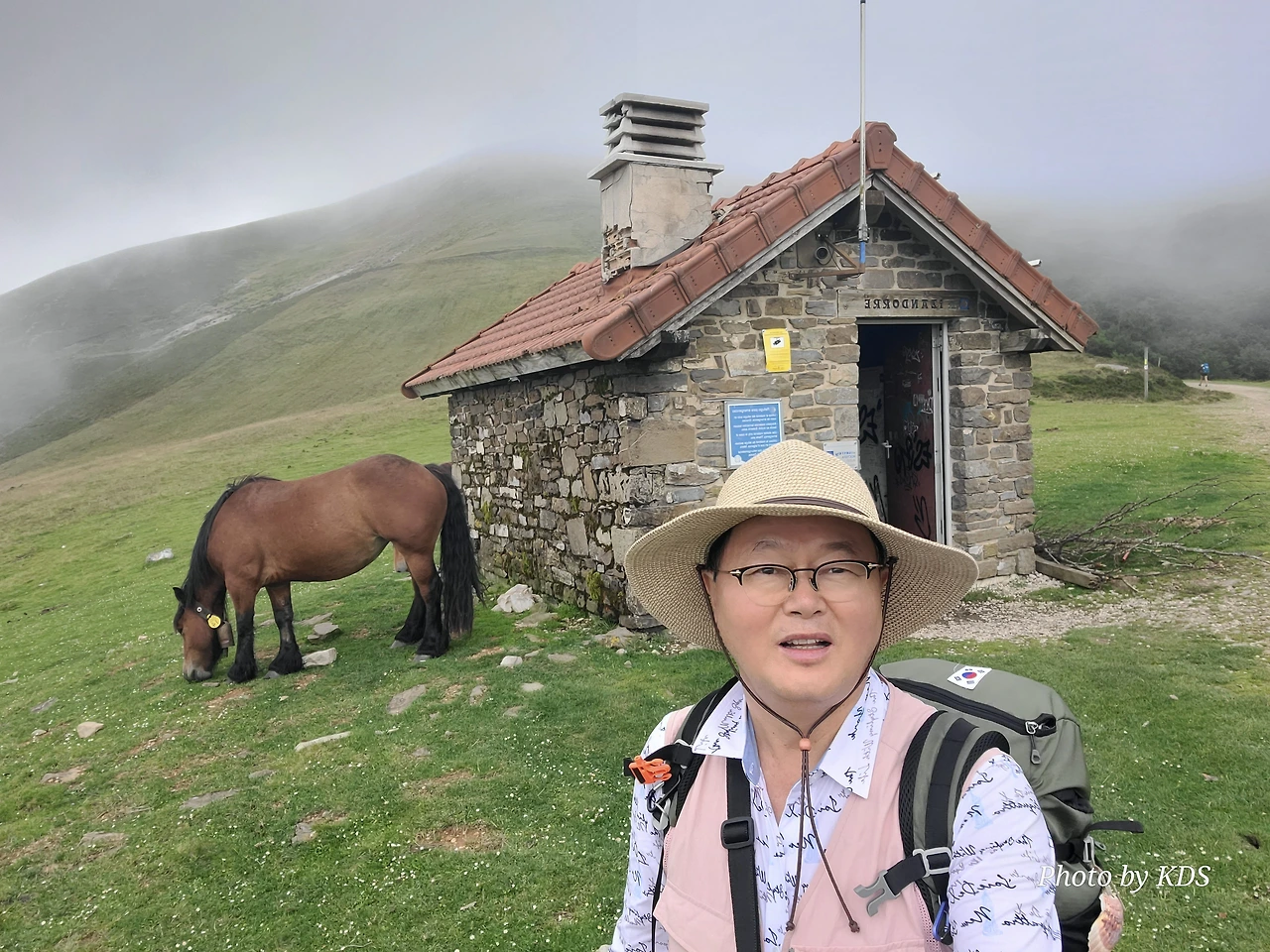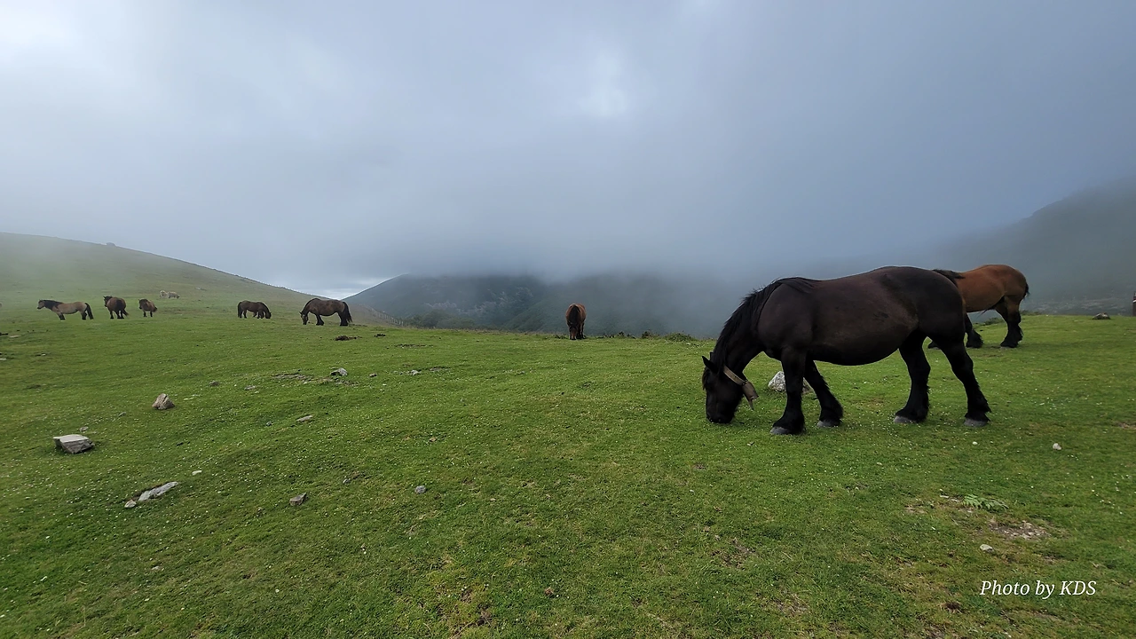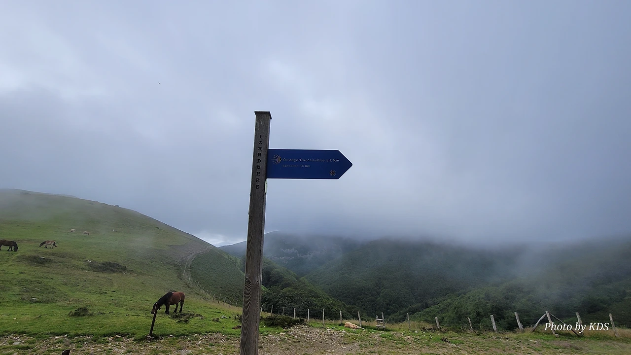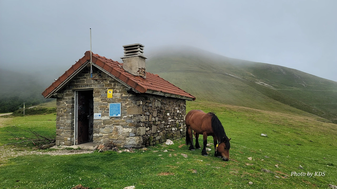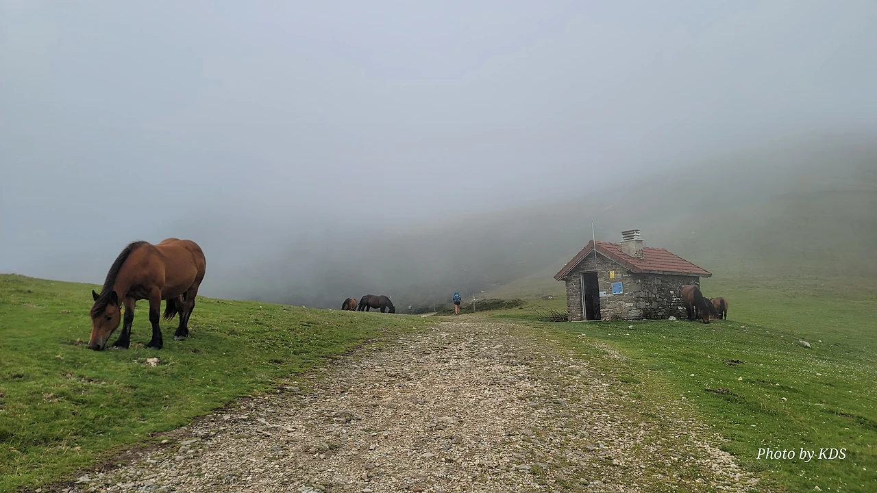 가는 길에 석조로 된 대피소가 있긴 한데 무인이라서 순례객용이 아니라 주변 목장의 소나 말들의 대피소 같다. 대피소 앞에서 한가로이 풀을 뜯는 말 한 마리는 필자가 다가가도 마치 관광객을 보는 동물원의 동물처럼 아무런 반응이 없다. 그냥 무심하게 점심 식사를 열심히 하면서 저쪽에다가 커다란 배변을 한 무더기 실례를 하기도 한다. 옛날 군화와 병장기를 부딪히면 넘던 살벌한 그 길에 평화와 조용한 모습이 아름답다.