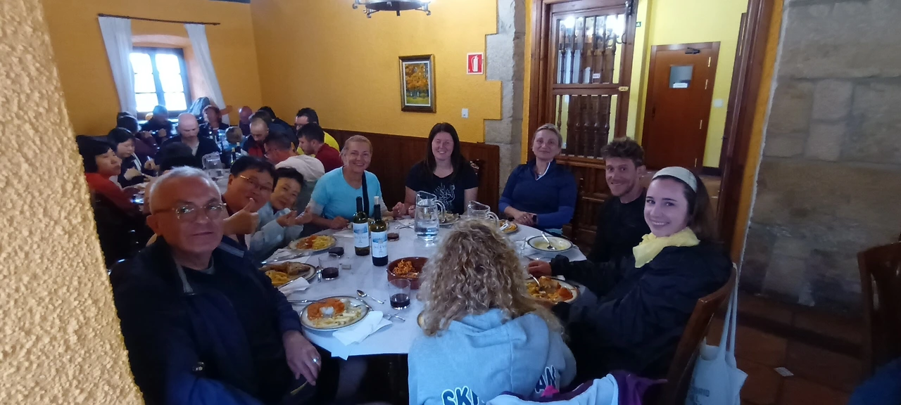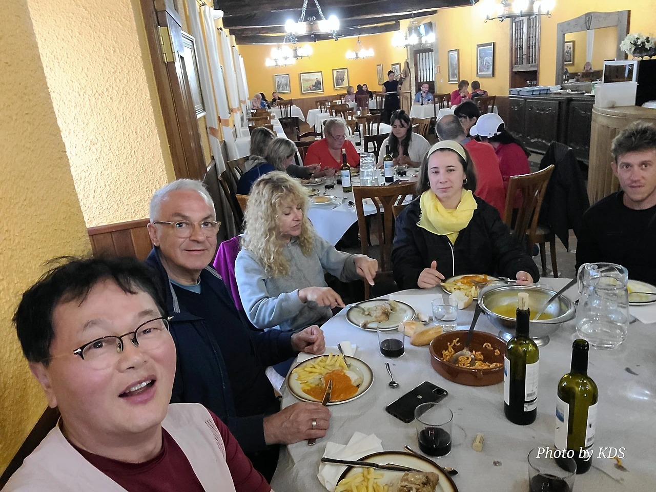 180명을 수용하는 공동숙소에서 1, 2부 식사 타임을 정해서 하는데, 인연인지 낮에 길에서 만나 사진 찍던 사람들과 한 테이블이다. 크로아티아에서 온 씩씩한 여성 3인방과 이탈리아노인 안젤로다. 나머지 세 사람은 그 자리에서 수인사한 사이다. 안젤로에 대해서 언급했지만 이 친구 정말 재밌다. 필자랑 갑장(甲長) 정도로 생각하고 덤볐다가 일곱 살 아래인걸 알고 꼬리를 내렸다. 그런데 이 친구 정말 여자 좋아한다. 필자랑 걸으면서 얘기하다가 혼자 걷는 여성 순례객이 마주치면 즉각 반응해서 그쪽으로 당장 방향을 선회한다.