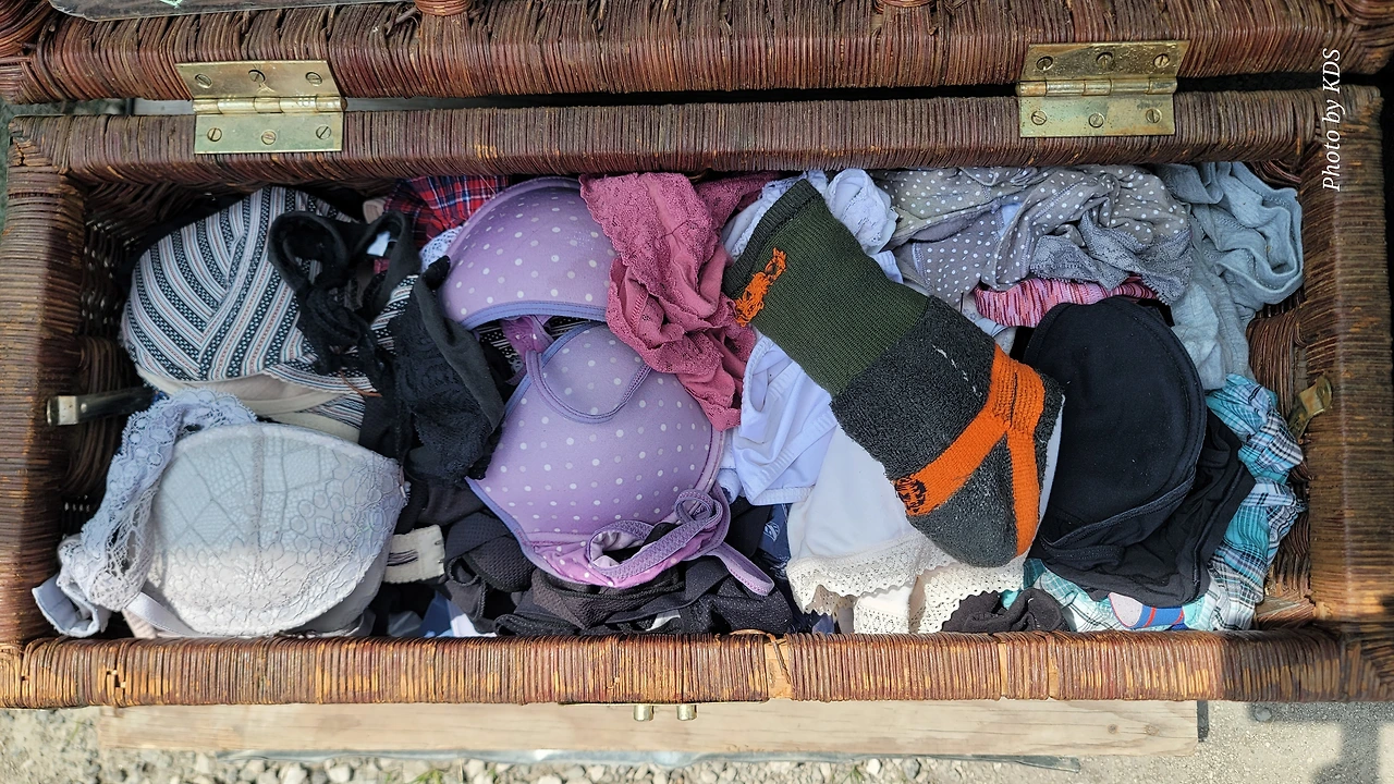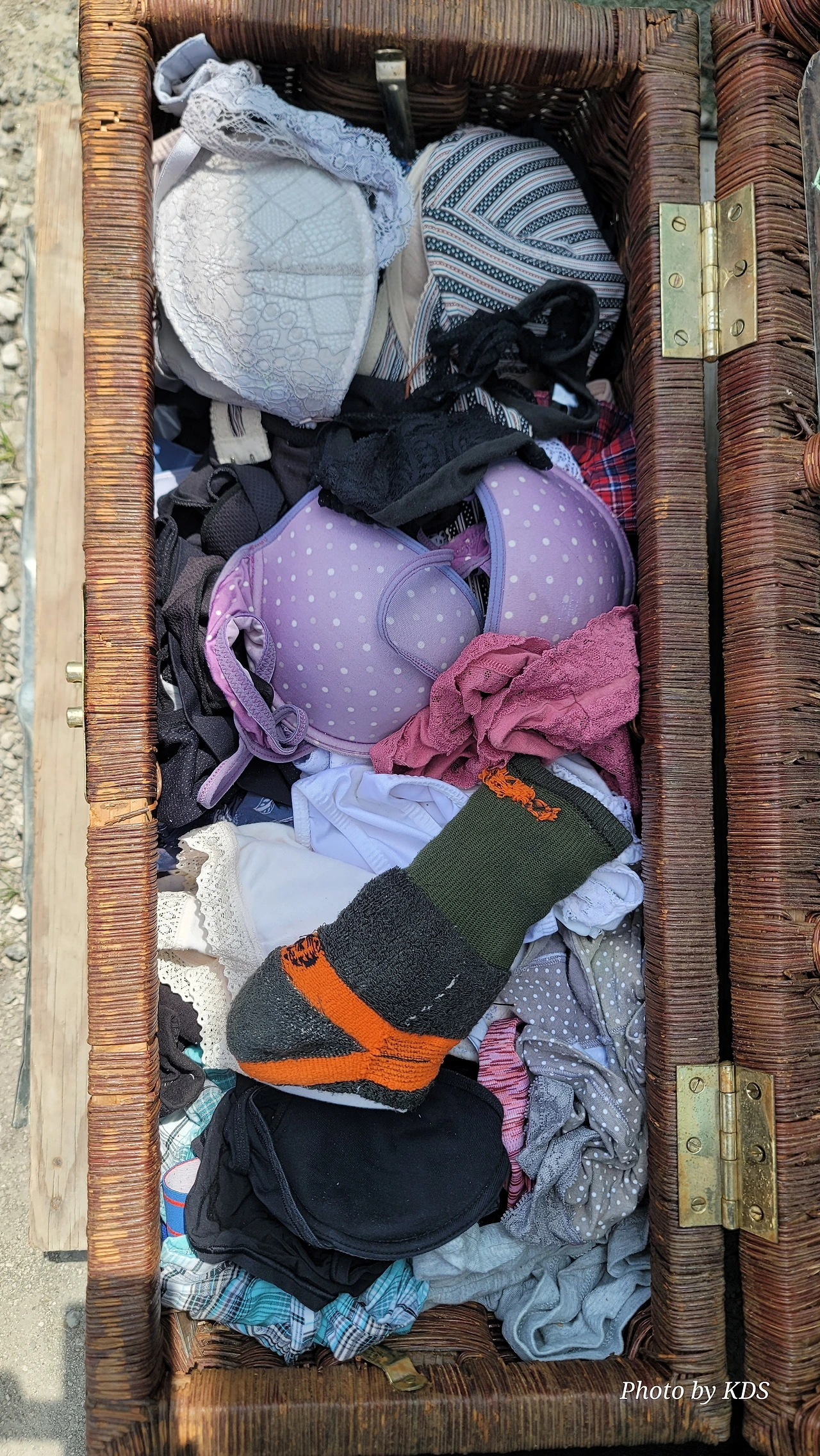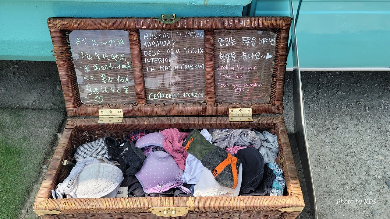 무거운 겉옷도 버린다. 그런데 여성들의 속 옷을 강탈하다니.....바구니 안에 브래지어, 팬티, 양말이 소복하다. 각국의 언어로 속 옷을 놓고 가면 꿈이 이루어진다고 광고하고 있다. 필자는 찾을 사랑도 없어서 벗어 놓을 게 없다. 당연히 속옷 한 벌로 버티는데 벗어 놓고 가면 노팬티라서 조선의 선비 과객으로서 체통이 말이 아니다.
