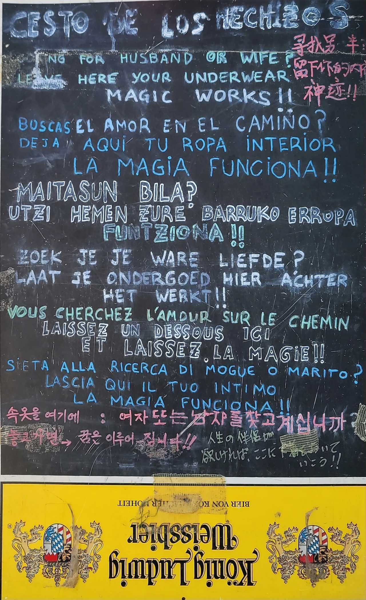 순례객들의 주머니만 털어가는 게 아니다. 실연(失戀)해서 산티아고 길 걷는 사람, 새로운 사랑을 찾아 걷는 사람 등등 가지가지 사연이 많을 것이다. 이들의 사연은 묻지 않고 그냥 본인이 소망하는 바람이 이루어진단다. 단 자기의 속 옷을 벗어서 여기에 넣어두어야 한다. 순례길에 짐이 무거워서 긴요한 물건 이외는 버리거나 필요한 사람에게 주는 경우가 많다. 길가에 벗어던진 등산화가 제일 많다.