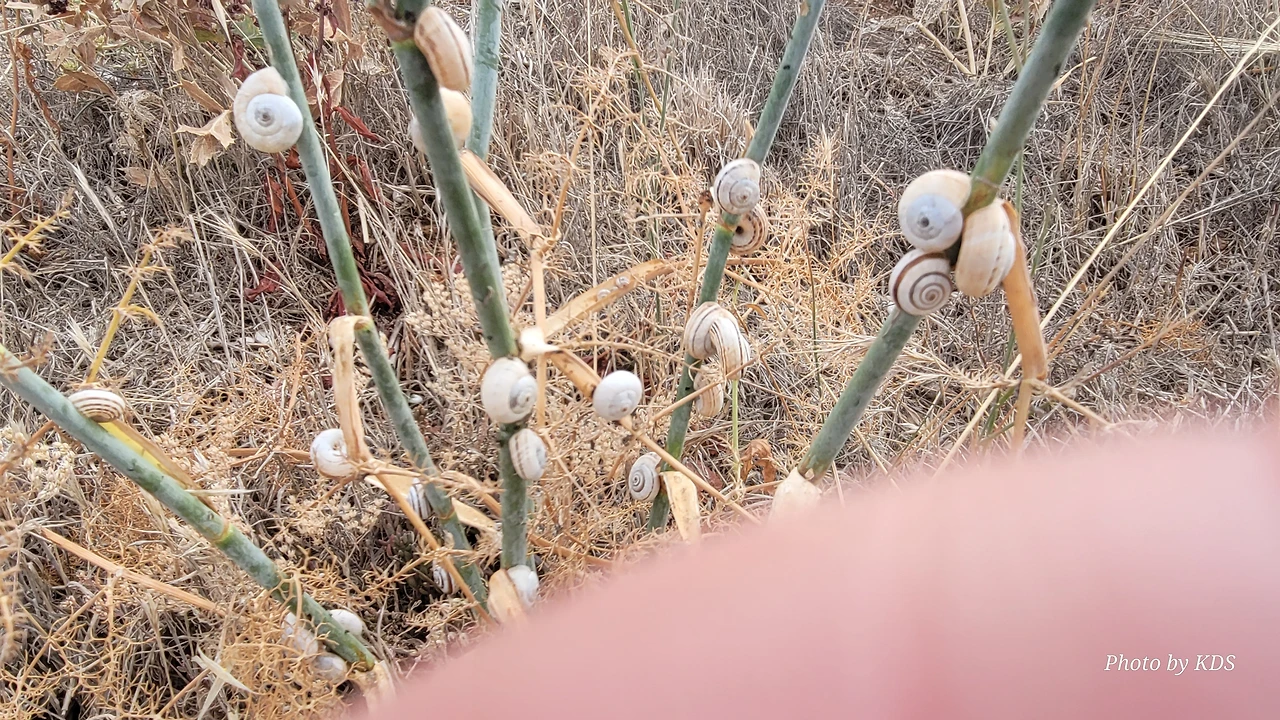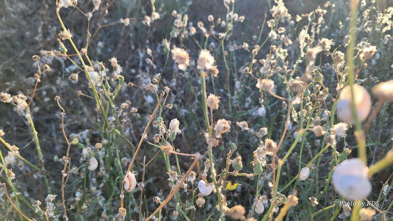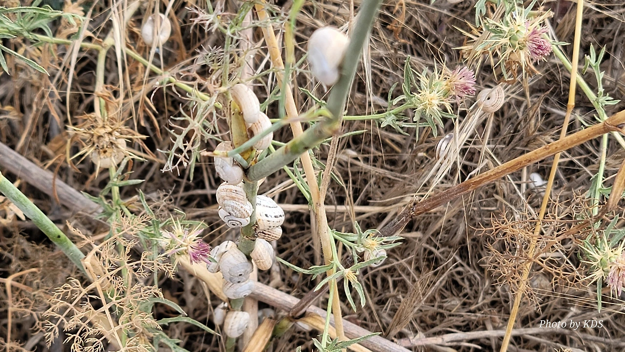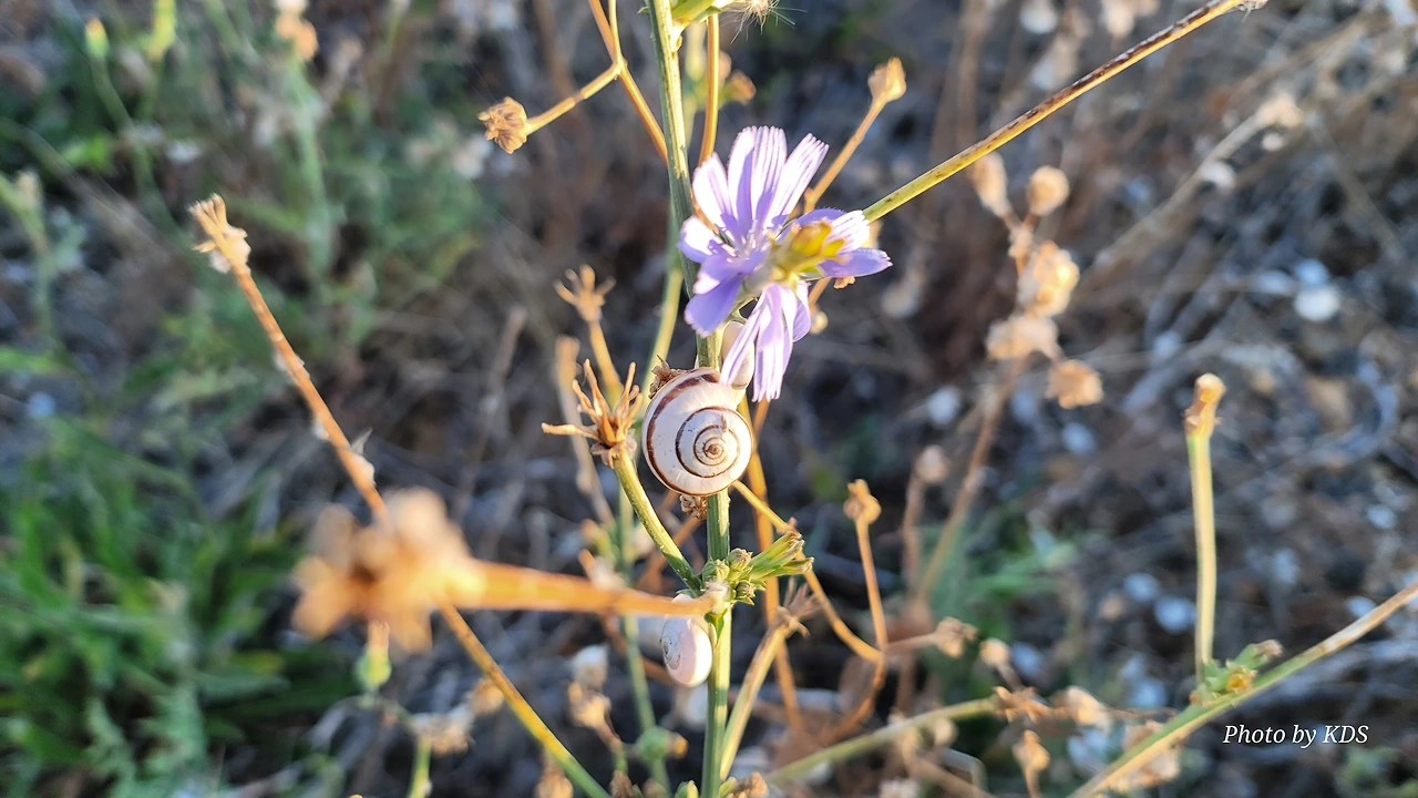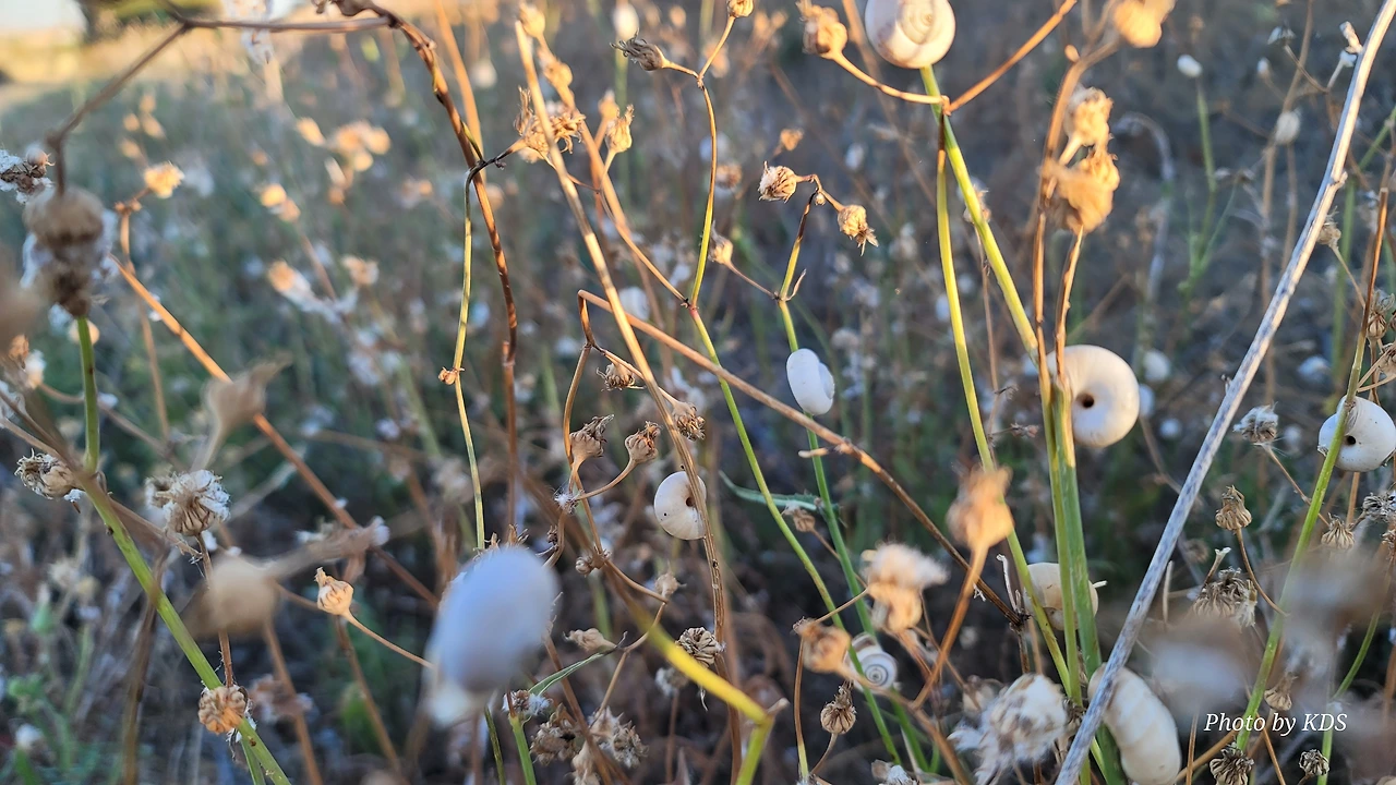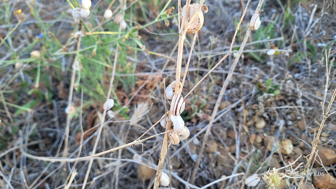 산티아고 순례길을 걸으면서 이런저런 상념에 젖어 걸을 때도 있지만 아무런 생각도 없이 그냥 스쳐 지나가는 사물들을 관찰할 경우도 많다. 이번의 글도 바로 그런 글의 한 종류이다. 달팽이꽃이란 식물은 아마 없을 거다. 조선 과객 금삿갓이 임의로 붙인 이름이다. 순례길을 걸으면서 몇 번인가 마주친 달팽이들에 대한 이야기이다. 한 여름의 뙤약볕을 받은 순례길의 바닥을 힘겹게 천천히 기어가는 달팽이도 있는 반면에 길가의 꽃이 핀 식물들에 옹기종기 올라가서 붙어 있는 달팽이가 더 많았다. 처음에 자세히 보지 않고 그냥 스쳐 지나갔으면 이게 달팽이인지 모르고 그냥 처음 보는 종류의 꽃이 피었다고 생각하기 쉽다. 조금만 관심을 가지고 자세히 보면 꽃이 아니고 바로 달팽이들이다. 달팽이 크기나 꽃의 크기가 비슷하여서 잘 못 알아볼 수 있다. 달팽이들이 일종의 보호색을 발현하여 포식자로부터 자기 몸을 보호하기 위한 방편인지는 알 수가 없다. 하지만 어떤 곳은 식물들이 건조하여 모두 말라죽었는데도 달팽이들은 그 식물에 달라붙어 있는데, 죽었는지 살았는지 꼼짝도 하지 않는다.