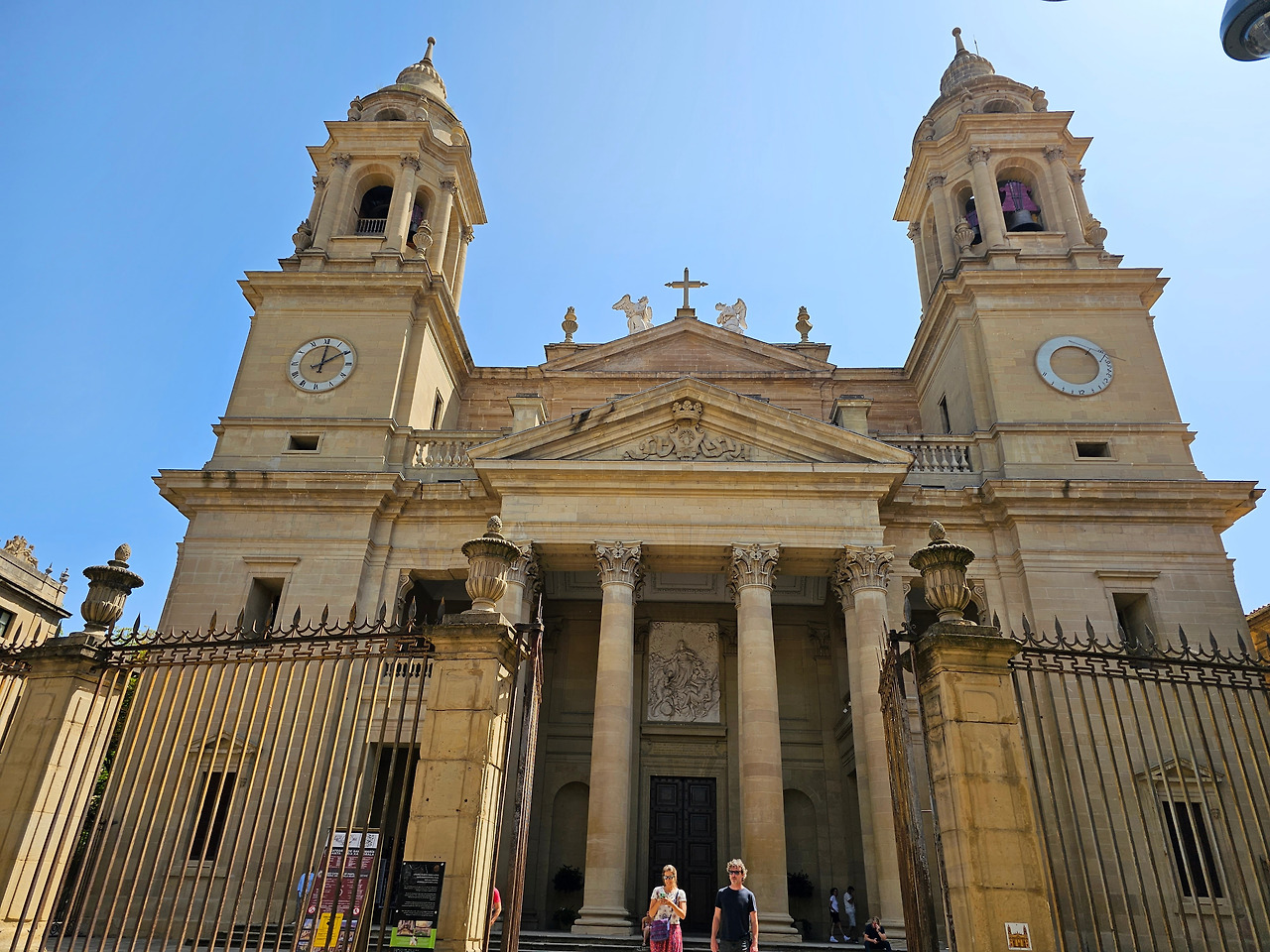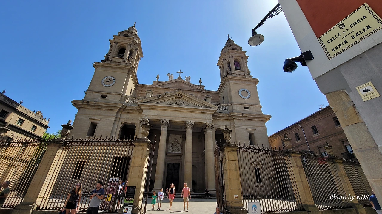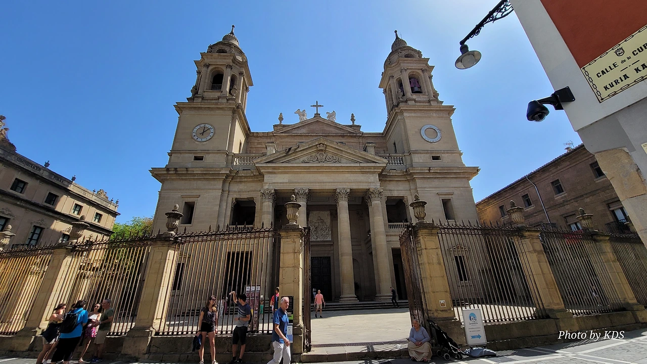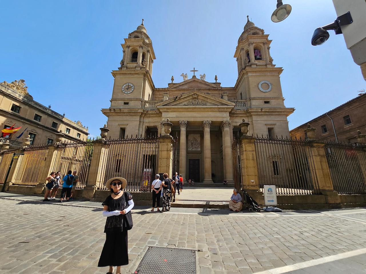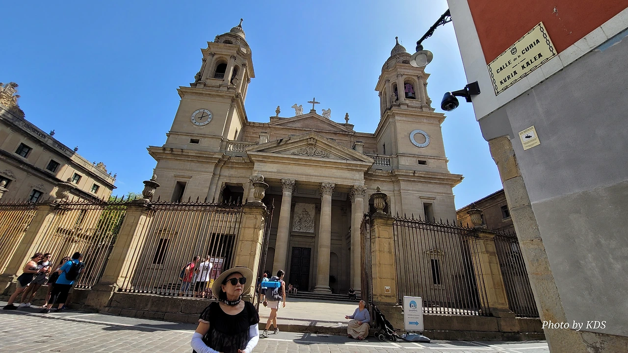 팜플로나 성문 즉 프랑스문 또는 수말라까레기 문 (Portal de Zumalacárregui)을 들어오면 골목길을 올라가서, 왼편으로 꺾어서 조금 위 언덕 쪽으로 더 가면 팜플로나 대성당이 나온다. 마치 우리나라 명동 성당이 명동의 언덕배기에 있듯이. 산따 마리아 대성당(La catedral de Santa María)이라고도 불리는 팜플로나 대성당은 정확히 말해서 팜플로나의 구시가지인 까스꼬 비에호(Casco Viejo)에 있다. 1397년에 건축이 시작되어 1530년에 세워진 고딕 양식의 성당인 이 건축물은 오래된 로마네스크식 성당 위에 추가로 지어졌는데, 정면은 신고전주의 양식이고 프랑스의 영향을 받은 회랑이 정말 아름답다.