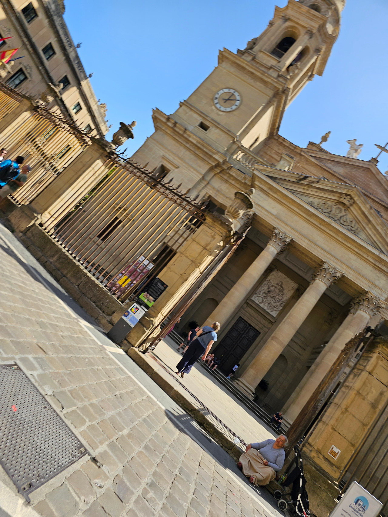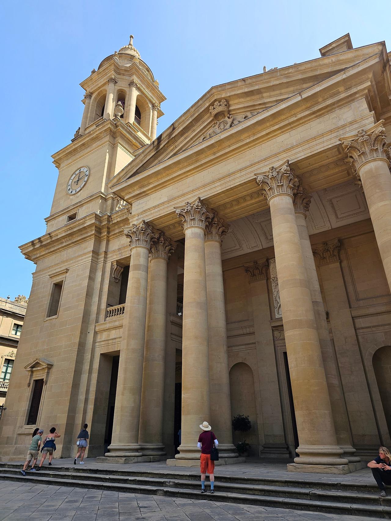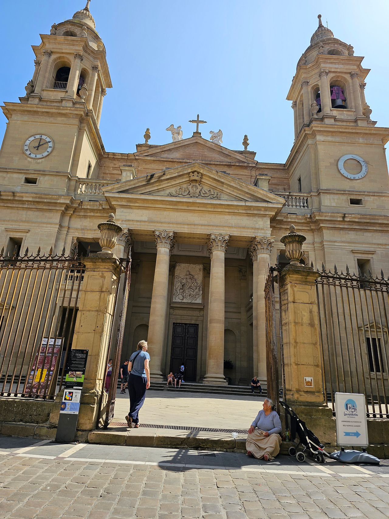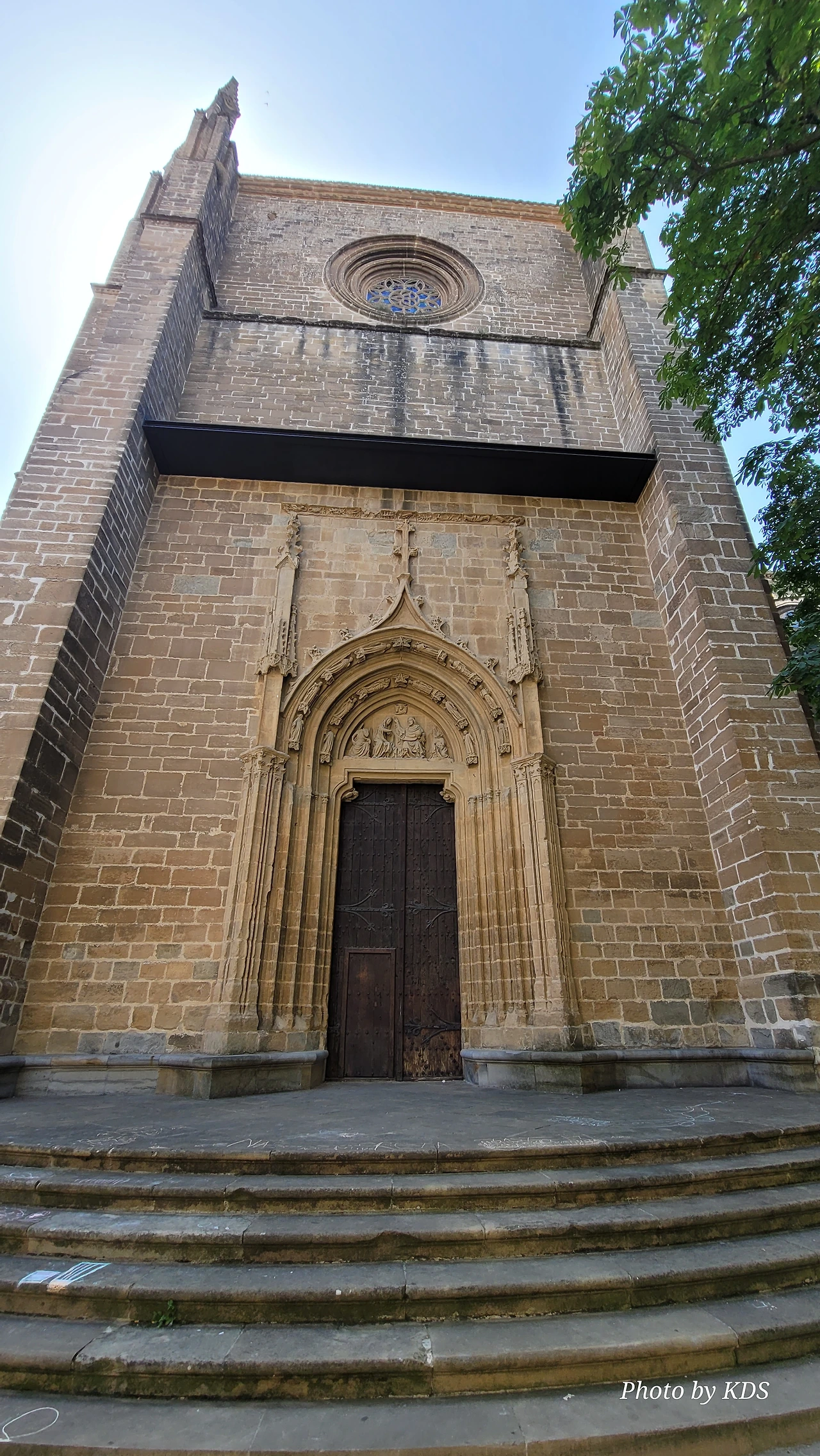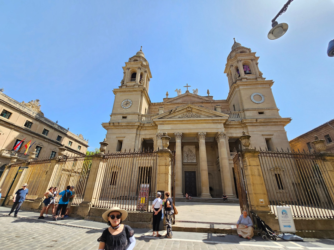 팜플로나 성문 즉 프랑스문 또는 수말라까레기 문 (Portal de Zumalacárregui)을 들어오면 골목길을 올라가서, 왼편으로 꺾어서 조금 위 언덕 쪽으로 더 가면 팜플로나 대성당이 나온다. 마치 우리나라 명동 성당이 명동의 언덕배기에 있듯이. 산따 마리아 대성당(La catedral de Santa María)이라고도 불리는 팜플로나 대성당은 정확히 말해서 팜플로나의 구시가지인 까스꼬 비에호(Casco Viejo)에 있다. 1397년에 건축이 시작되어 1530년에 세워진 고딕 양식의 성당인 이 건축물은 오래된 로마네스크식 성당 위에 추가로 지어졌는데, 정면은 신고전주의 양식이고 프랑스의 영향을 받은 회랑이 정말 아름답다.