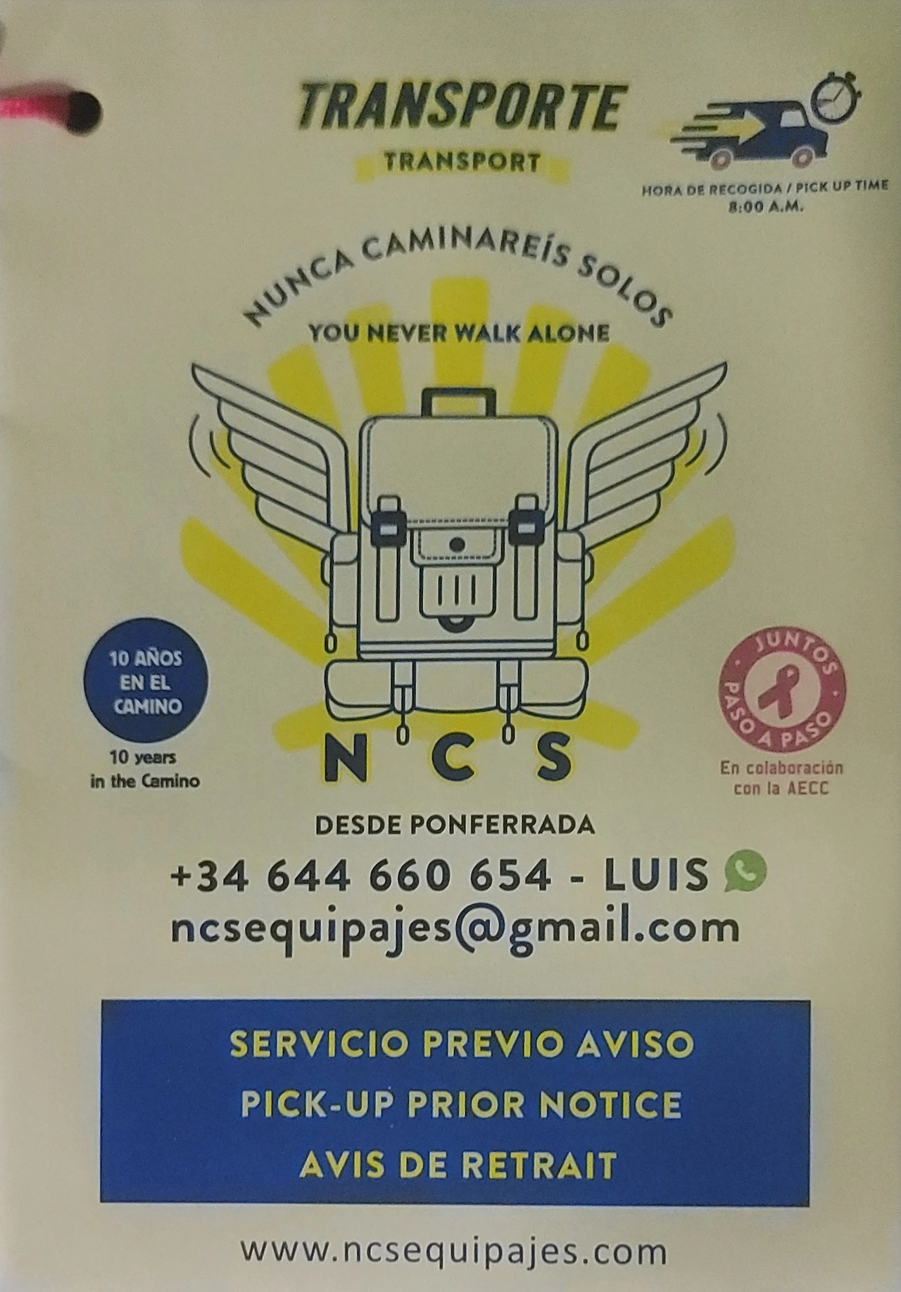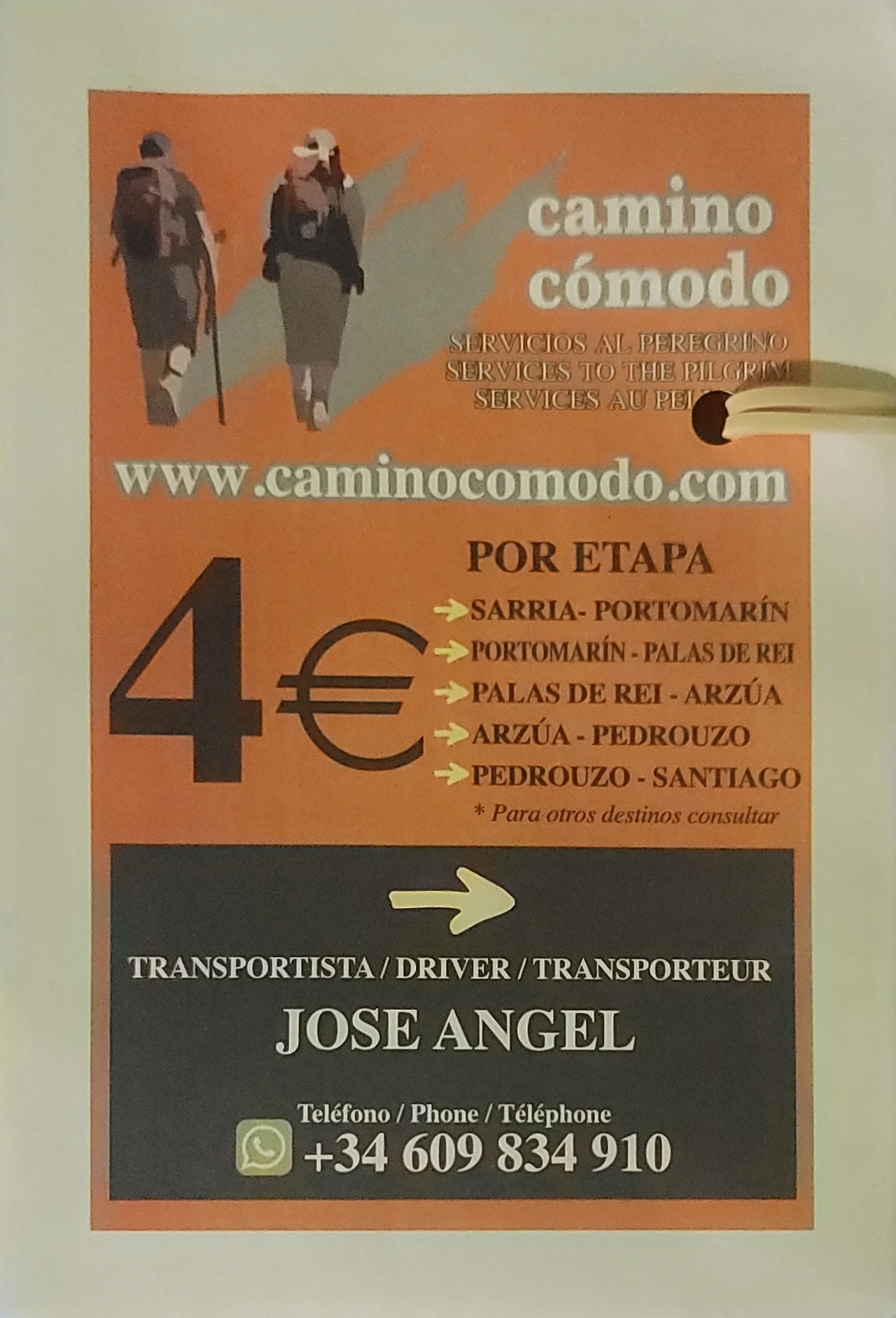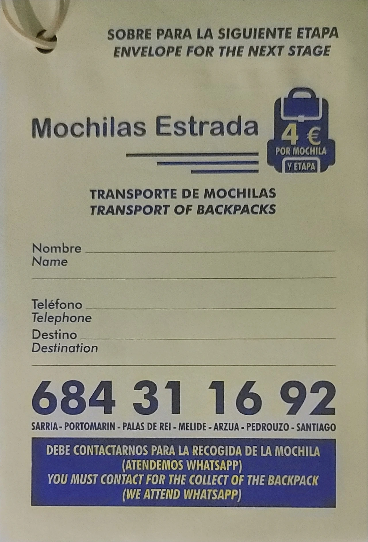 알베르게 접수 프런트 주변에 이 택배 서비스의 신청서가 회사별로 준비되어 있다. 예약도 필요 없고, 대화도 필요 없다. 신청서 양식이 봉투로 되어 있다. 자기가 보내야 할 다음 숙박지의 지정한 알베르게 이름을 쓰고, 이름과 전화번호를 기재한 후에 그 봉투에 해당 요금을 넣어서 배낭에 매달아 두면 된다. 회사에서 오전에 알베르게를 돌면서 수거하여 지정된 곳에 가져다 두게 된다. 선불택배인 것이다. 최소 4유로이고 무게와 거리에 따라 그 이상이다. 매일 배낭을 택배하고 조그만 색(Sack)에 마실 물과 간식만 메고 걷는 사람도 많다. 어떤 사람들은 커다란 여행용 트렁크를 매일 택배 하는 사람도 있다.