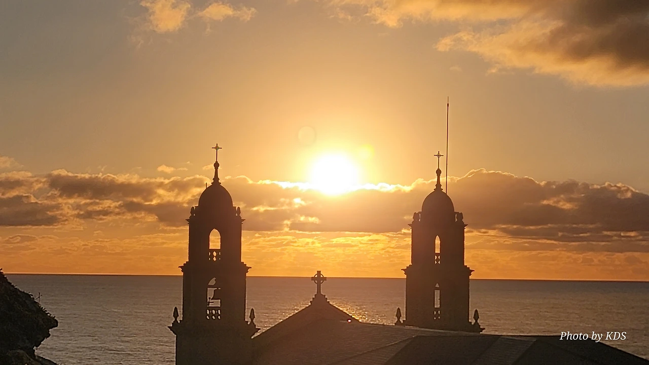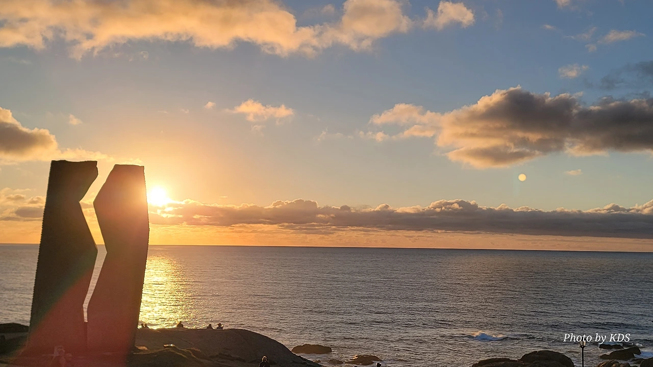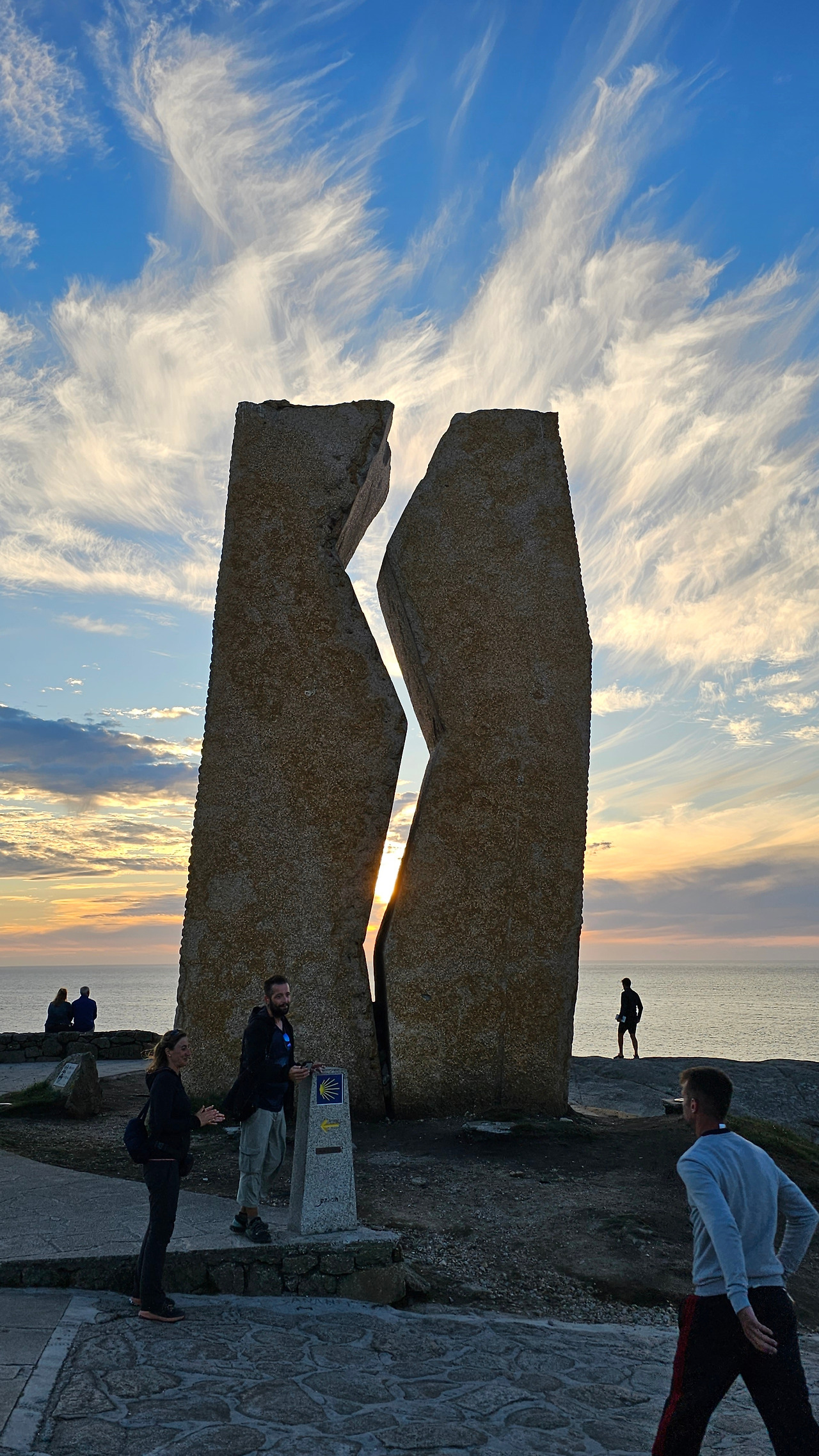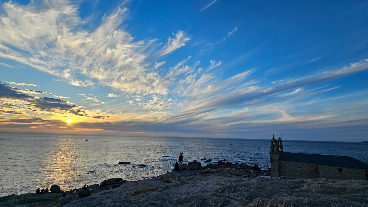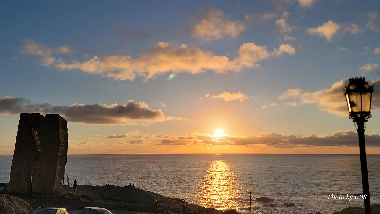 아, 조선과객 금삿갓의 산티아고 순례길 800Km 도보 여행과 산티아고-묵시아 간 90Km 버스여행이 오늘로써 대단원의 막을 내리는 순간이다. 마침 땅끝 마을 해안선 바위 위에서 대서양으로 떨어지는 태양의 모습을 바라보면서 마무리하는 마음속 감회는 도리어 섭섭한 기분이다. 한 달간의 고행이라면 고행인 여정을 끝내고 이곳을 떠나야 하는 것이 어쩌면 아쉬운 마음이다. 교회의 첨탑 사이로 바라보면 저 멀리 바다 위에 구름띠를 두른 하늘 끝에 붉은 태양이 잘 가라고 손짓을 하면서 얼굴을 가리기 시작한다. 저녁을 맞아서 고기잡이를 마친 어선들이 다시 포구를 찾아 조용히 밀려오고, 갈매기는 둥지를 찾아 날아들 것이다. 방랑객 금삿갓도 오늘 밤을 지내면 묵시아를 출발하여 다시 포르투갈과 스페인 중부, 동부, 남부 지방 그리고 프랑스 지중해 연안과 피레네 산속의 안도라 등을 떠돌 예정이다. 그런데 왠지 바위에서 붙은 발걸음이 쉬이 떨어지지 않는다. 이제 떠나면 언제 걸어서 이곳을 다시 올진 기약도 없고 기회도 없을지 모른다. 스스로를 찾아 떠난 순례길에서 조선 과객 금삿갓은 정녕 스스로를 찾았을까? 마음 한 구석이 아직 미진하다면 스스로를 찾지 못한 것일 게다. 더 방랑하며 더 찾아보아야 할지도 모르겠다. 그런다고 찾아질지도 모르지만. 두 다리와 두 발이 성한 그 시간까지는 끊임없이 움직이고 찾는 게 방랑객의 숙명이니까.