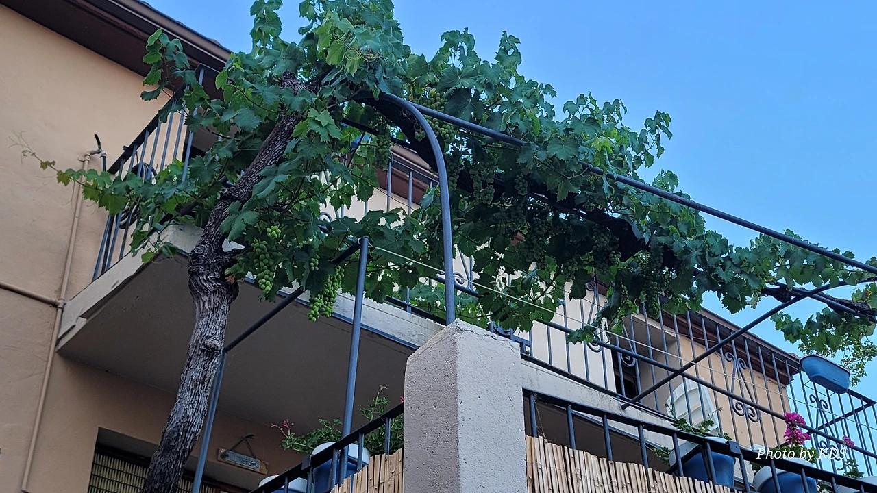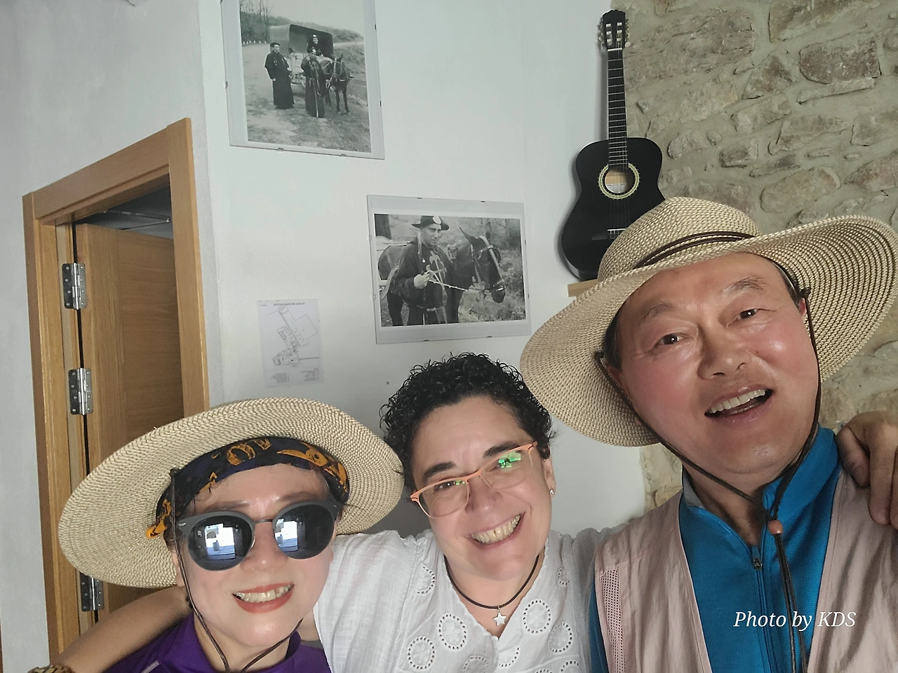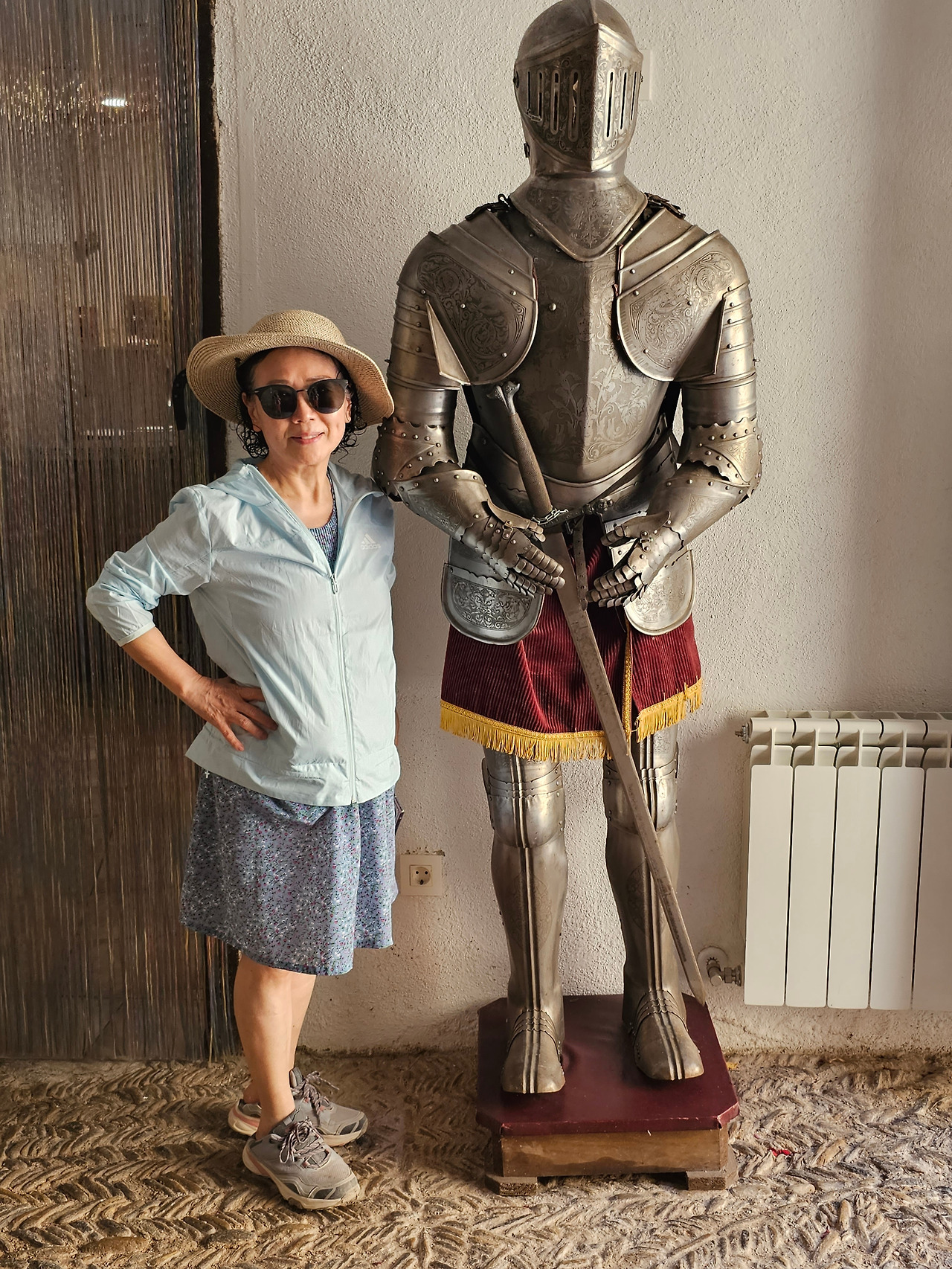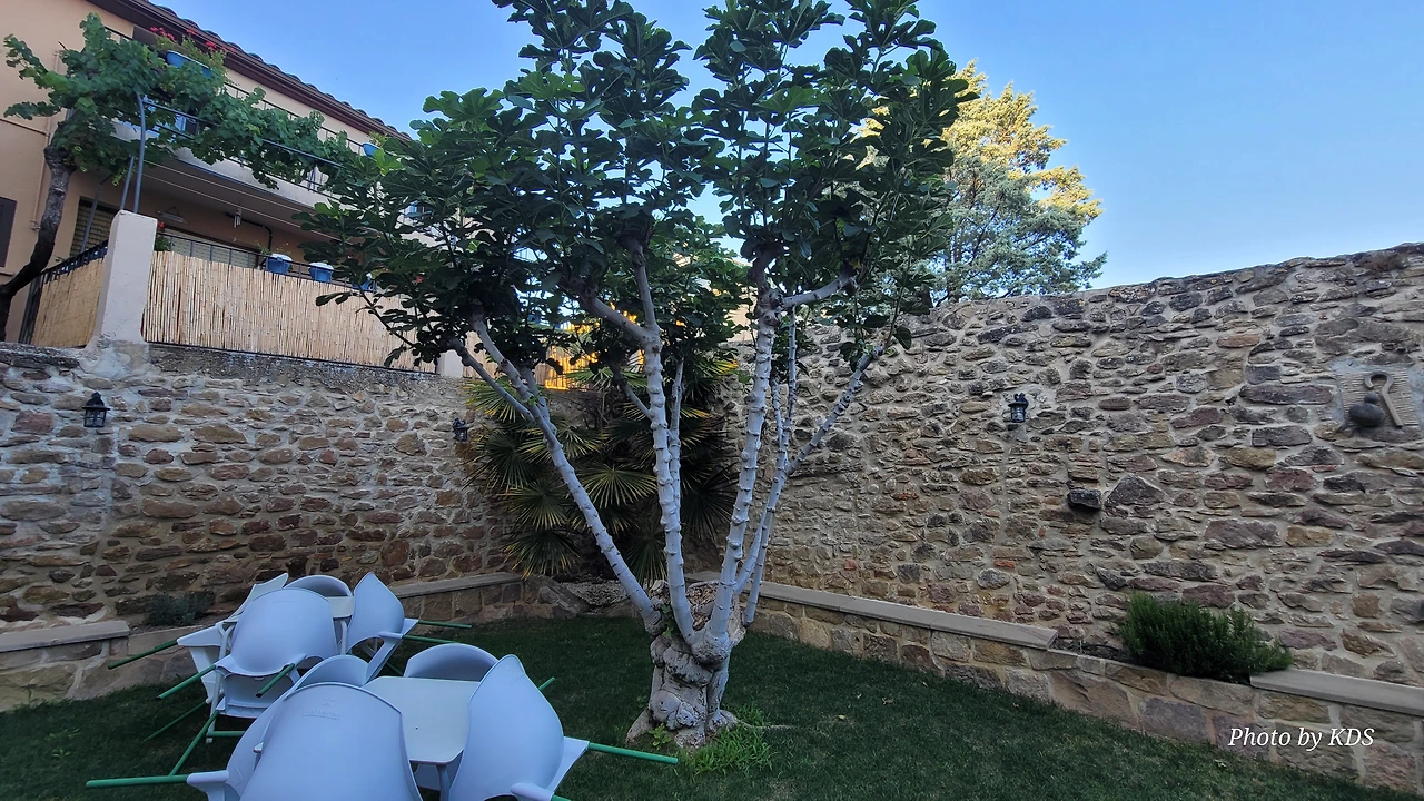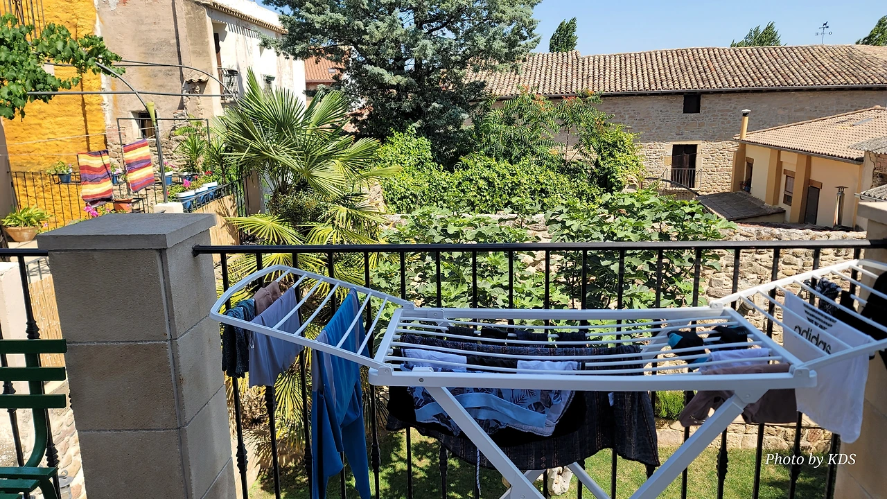 그러나 우연히 찾아든 주막인 알베르게 주인아주머니의 넉넉한 표정과 집안 곳곳에 설치된 조형물들이 제법 유서가 깊어 보인다. 현관 옆에 선 철갑 기사상이 반기고, 포도주를 짜는 오래된 압착기와 술통들이 조선 과객 술꾼의 DNA를 자극했다. 뭔가 술맛이 좋을 것 같았다. 포도 산지답게 정원에서 자라는 포도도 알들이 잘 영글고 있었다. 우선 순례객들이 많지 않아서 좋고, 특히 젊은 순례객이 별로 없고 약간 나이 든 부부 순례객이 같이 있어서 마음에 들었다. 맛있는 와인과 저녁을 포함하여 1인당 26유로에 피곤한 몸이 호사를 누렸다.
