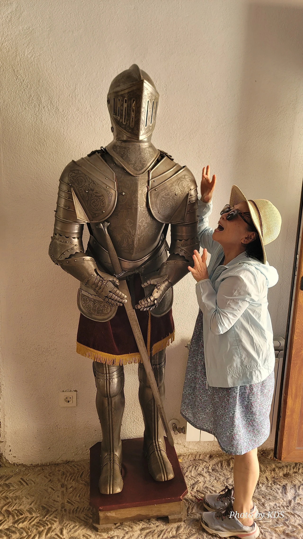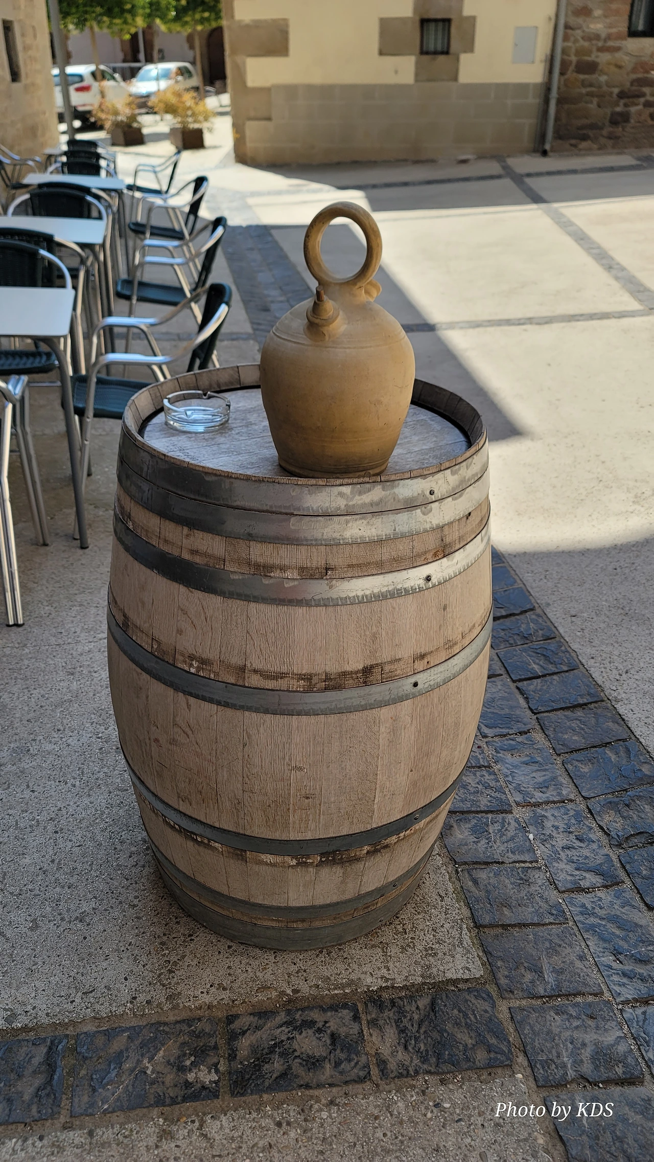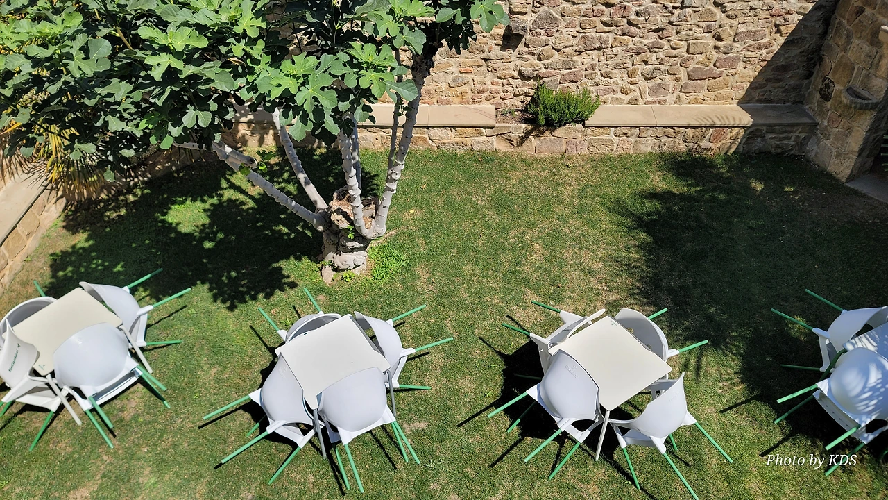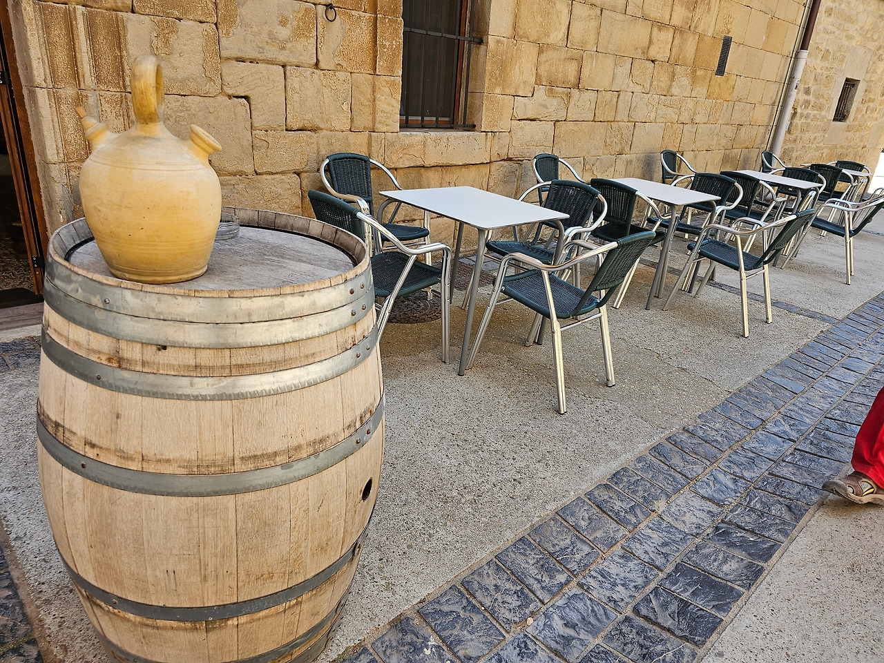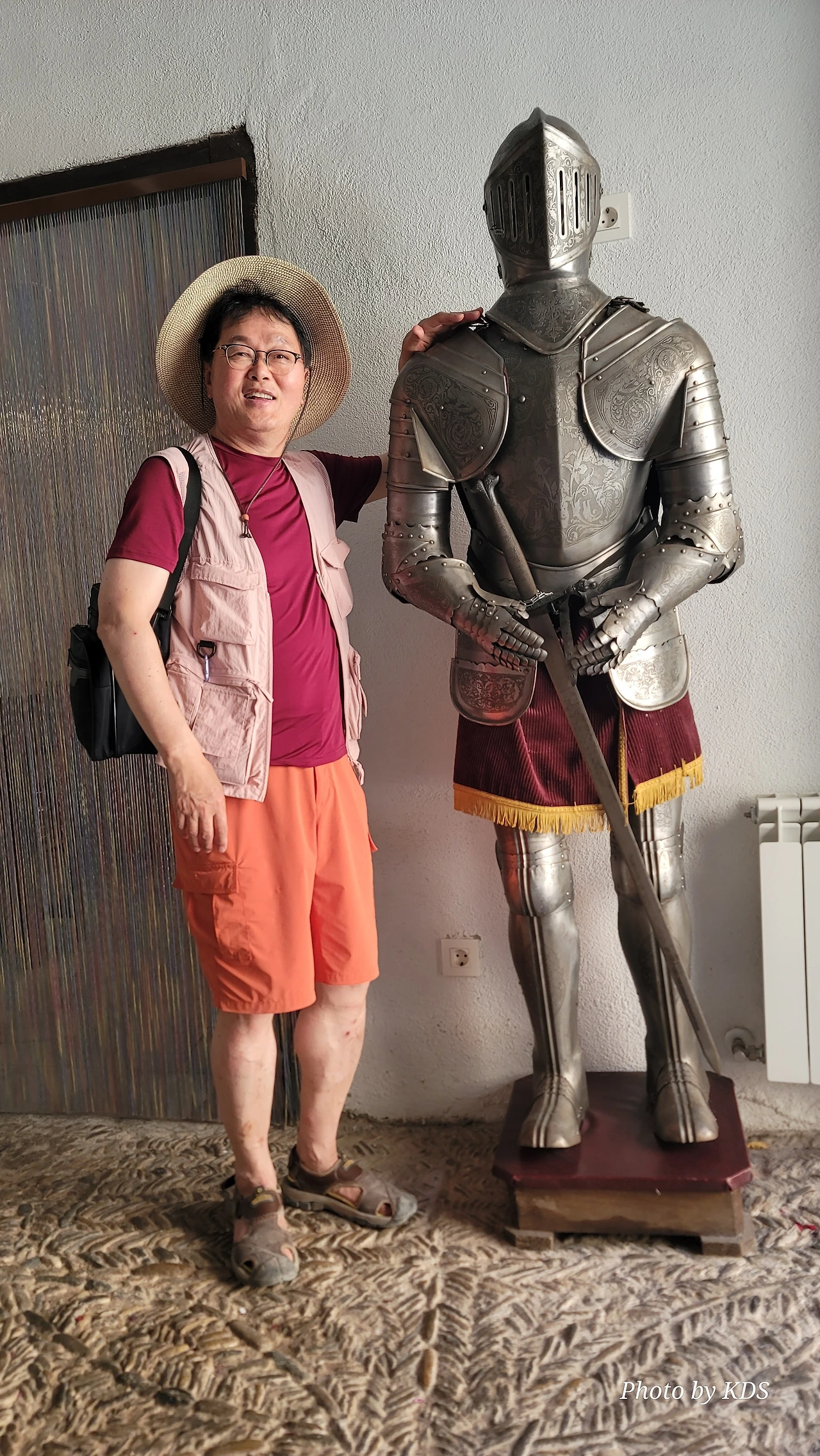 그러나 우연히 찾아든 주막인 알베르게 주인아주머니의 넉넉한 표정과 집안 곳곳에 설치된 조형물들이 제법 유서가 깊어 보인다. 현관 옆에 선 철갑 기사상이 반기고, 포도주를 짜는 오래된 압착기와 술통들이 조선 과객 술꾼의 DNA를 자극했다. 뭔가 술맛이 좋을 것 같았다. 포도 산지답게 정원에서 자라는 포도도 알들이 잘 영글고 있었다. 우선 순례객들이 많지 않아서 좋고, 특히 젊은 순례객이 별로 없고 약간 나이 든 부부 순례객이 같이 있어서 마음에 들었다. 맛있는 와인과 저녁을 포함하여 1인당 26유로에 피곤한 몸이 호사를 누렸다.