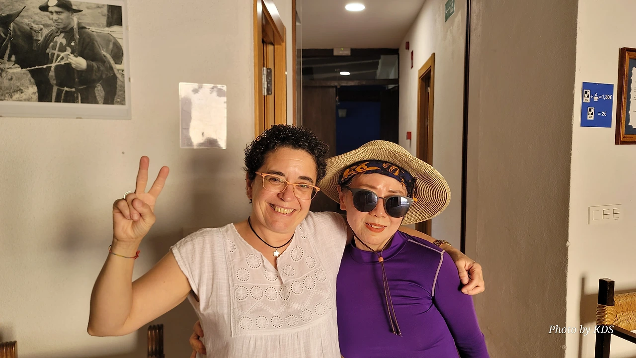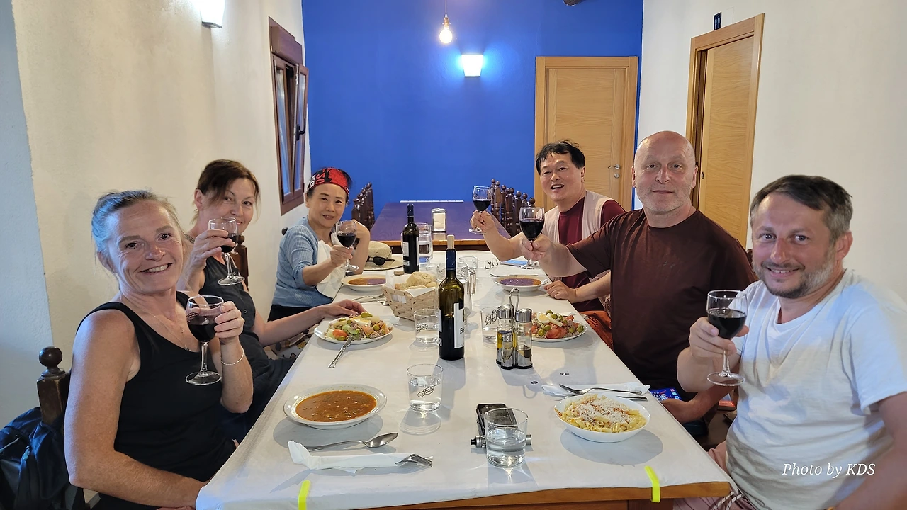 선비가 춥다고 곁불 쪼이거나 배 주린다고 바가지에 밥 담아 먹지는 못하지 않는가. 아무렇지 않은 척 내색 않고 앉아서 통성명을 하는 것이 조선의 법도이다. 일단 탐색전이 끝나니 대충 사이즈가 나온다. 한 부부는 아일랜드, 한 부부는 헝가리. 부부인지 길에서 눈 맞은 사이인지 아리송하다. 이 무튼 이들이 무알콜 스타일이어서 너무 행복했다. 주로 알베르게에서 무료 와인의 제공량은 2~3인에 한 병이다. 그런데 2명이 무알콜이니 정말 술 고픈 금삿갓에게는 희소식이다. 그래도 건배는 물로 하면 3년 재수 없다고 조선의 음주 법도를 설명하고, '위하여'를 가르쳐서 힘껏 외치게 했다. 덕분에 오래간만에 공짜술이 목구멍을 약간 즐겁게 해 줬다. 길은 힘들어도 끝은 언제나 좋다.