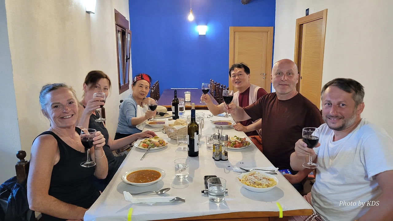 저녁 만찬은 조촐하게 세 커플이 즐기게 되었다. 은근히 로즈와인의 상큼한 맛을 기대하며 허기진 배에서 쪼르륵하는 소리가 나도록 참고 있었다. 드디어 식사 시간이다. 군대생활할 때도 식사시간에는 모두가 용감한 병사다. 일착(一着)으로 레스토랑에 도착하려고 갔는데 조선 과객 선비의 발걸음이 한발 늦었다. 서양의 기사(騎士) 양반들이 선점해 버렸다. 역시 조선 선비는 거드름을 피우면서 어슬렁어슬렁 걸어야 제맛 아니겠나. 서양 기사들처럼 파랑개비 돌듯 촐싹 되어서는 지체 있는 과객으로서 체통이 안 선다.