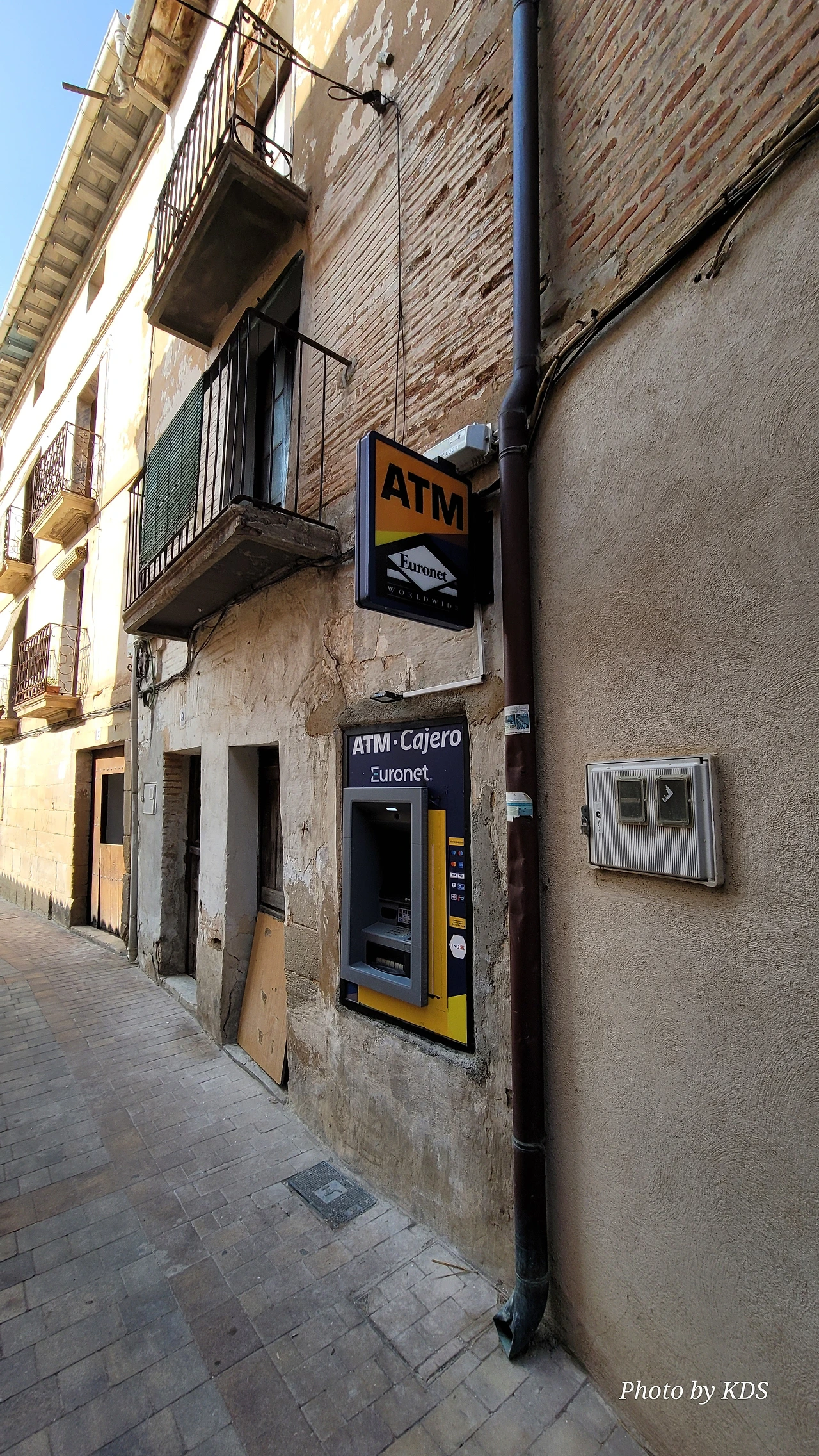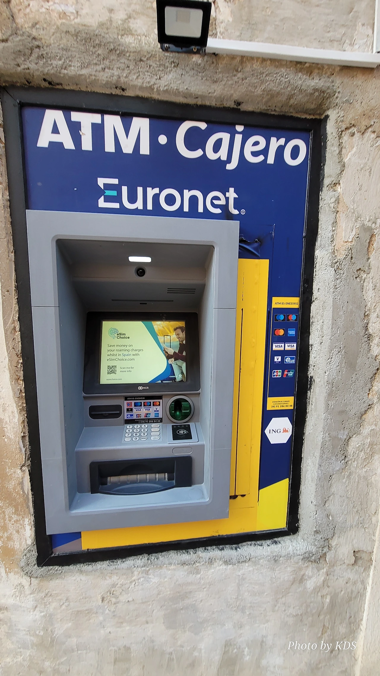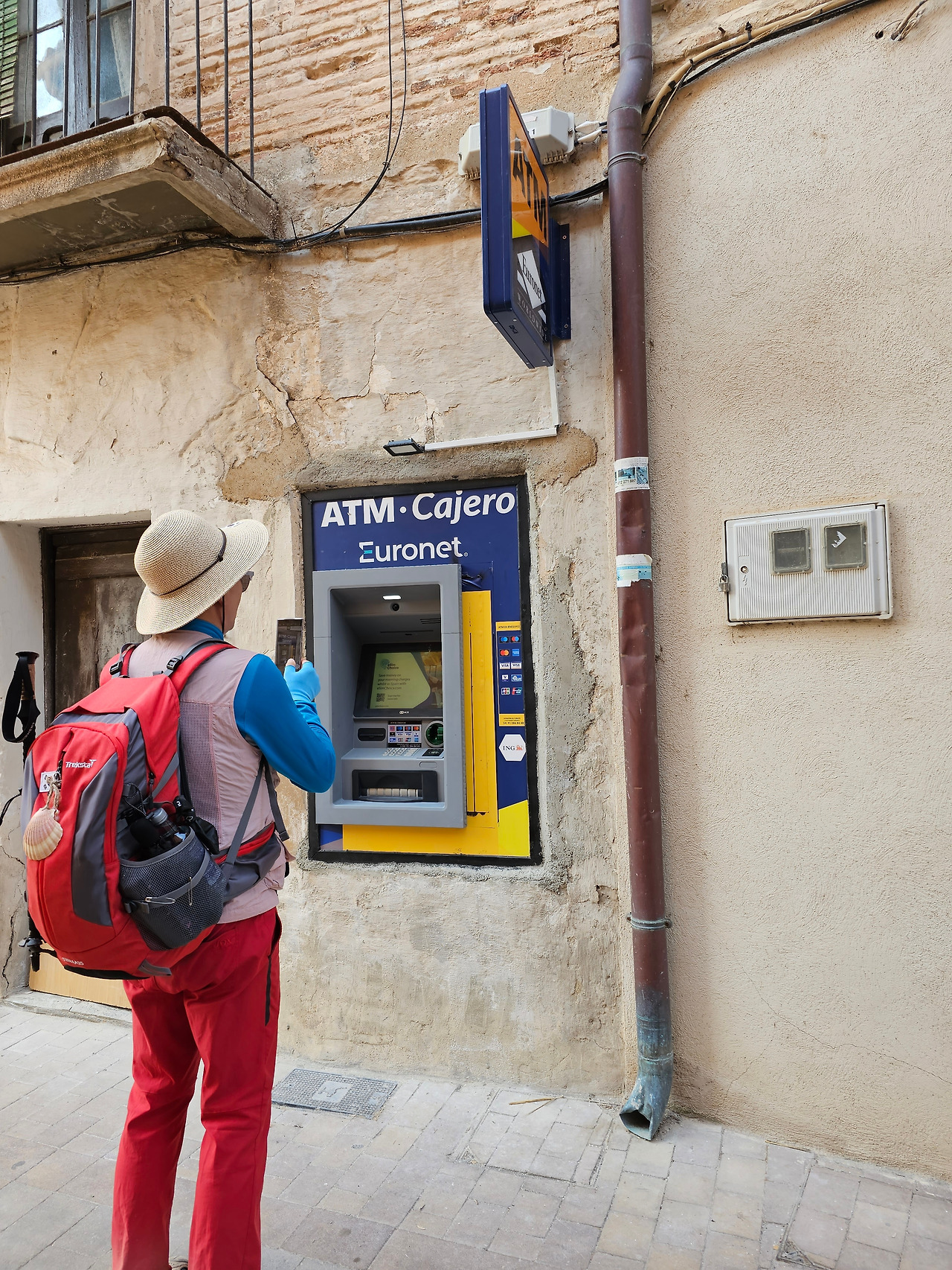 현찰이 바닥나면 이렇게 생긴 ATM기기에서 신용카드 즉 트래블 월랫 카드로 유로화를 꺼내서 이용할 수 있다. 참고로 경험상 해외여행 시에 한국의 일반적인 은행카드나 신용카드는 카드 사용 수수료가 비싸고, 환율에 의한 환차손실의 발생 위험도 매우 높다. 그러나 트래블 월랫 카드는 카드 사용수수료가 없다. 환전이나 현금 인출도 수수료가 없고 기준환율을 사용하기 때문에 환차손실의 발생 위험이 적다. 그리고 수시로 충전하고 수시로 사용하며, 유럽의 비접촉식 카드 단말기에 제일 적응이 잘 된다. 유럽에서 대부분의 가게에서 2유로 이상이면 카드를 다 사용할 수 있다. 그리고 또 편리한 것이 스페인에서는 시내버스 탈 때 이 카드하나로 모든 게 OK이다. 교통카드가 필요 없고 이 카드로 찍고 타면 자동이다. 카드 한 장으로 여러 사람이 탈 수도 있다. 대신 지하철은 불가능하므로 지하철 패스나 티켓을 따로 구매해야 한다. 트래블 월랫 카드 판촉 요원이 아니고 필자가 여러 카드를 사용해 본 후에 느끼는 경험이다.