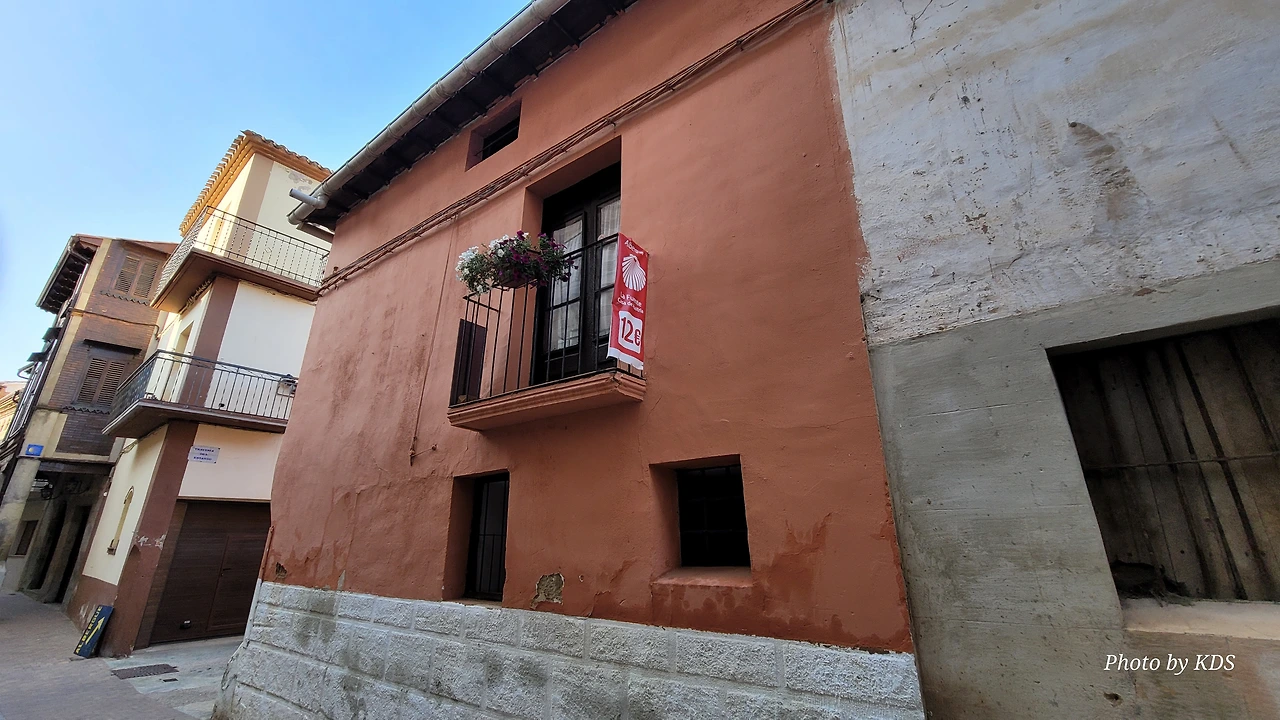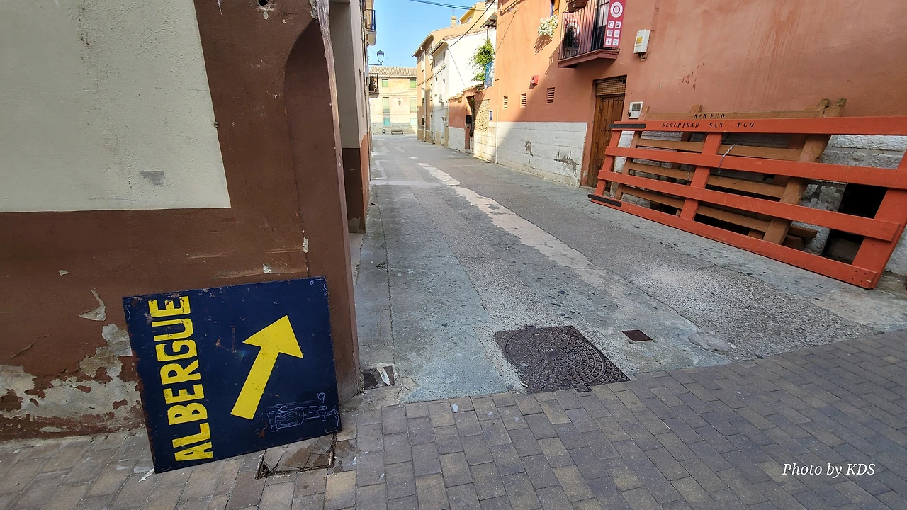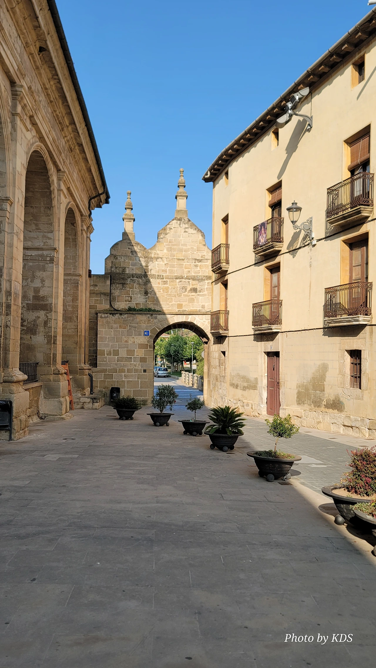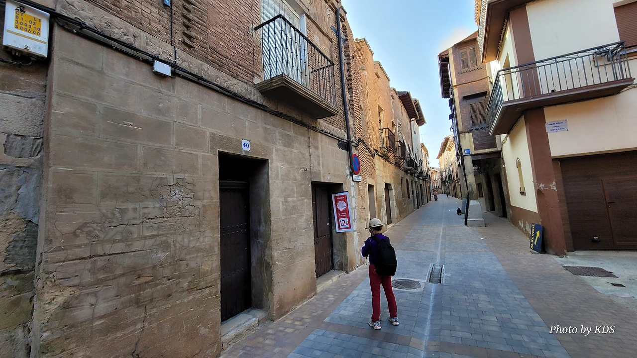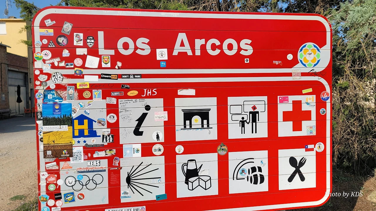 비야마요르 데 몬하르딘(Villamayor de Monjardin)을 떠난 우리는 끝없이 펼쳐져 있는 까미노를 따라 아득한 포도밭 사이로 내려간다. 우르비욜라(Urboola) 마을 옆을 지나 N-111 도로를 따라 검정 버드나무 숲을 왼쪽으로 끼고 걷기를 계속한다. 이 길에는 까미노 싸인이 잘 표시되어 있고, 쭉 뻗은 넓은 농지를 지나기 때문에 로스 아르꼬스까지 약간 지루하고 감흥이 없는 코스이다. 뙤약볕에서 3시간이 넘게 광활한 공간을 침묵과 함께 걷다 보면 자신도 모르게 내가 무슨 짓을 하고 있는 건가라고 생각할 수도 있다. 지난 시간의 어려움과 그간의 추억들도 되새김 한다. 이 길을 가기 전에 물통을 채울 수 있는 기회는 우르비욜라(Urbiola)에서 올레후아(Olejua)로 이어지는 아스팔트 도로와 만나는 교차점에 있는 음수대를 이용하면 된다. 로스 아르꼬스((Los Arcos)에 도착하기 약 2킬로미터 전에 라스 끄루세스(Las Cruces) 언덕에 있는 소나무 숲 이외에는 따가운 스페인의 햇살을 피할 그늘조차도 없으니, 따가운 햇살을 즐기면서 걷는 것이 더 마음에 이롭다. 로스 아르꼬스로 가는 길은 전반적으로 내리막길이다. 몬하르딘 마을이 해발 675m이고 로스 아르코스가 475m이다. 로스 아르코스는 15세기와 16세기를 거치면서 까스띠야 왕국과 나바라 왕국의 경계에 위치한 도시로서 두 왕국 어느 곳에도 세금을 내지 않으며, 두 왕국의 상업적 특성을 잘 이용해 부를 축척했던 마을이다. 발코니가 있는 아름다운 집들 사이의 조그만 골목길을 지나다 보면 길은 어느새 조그만 광장 왼쪽으로 아름다운 산따 마리아 성당을 지나 까스띠야 문을 통과하게 된다.