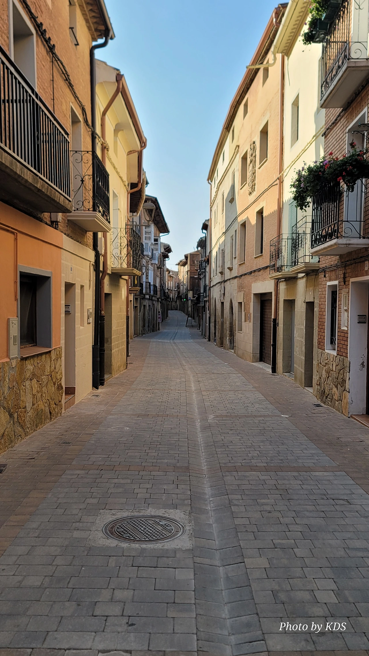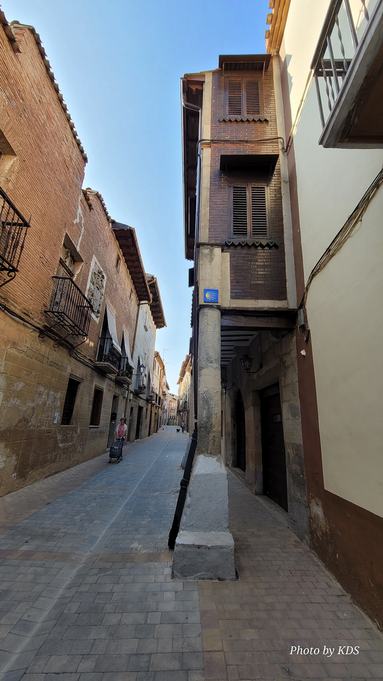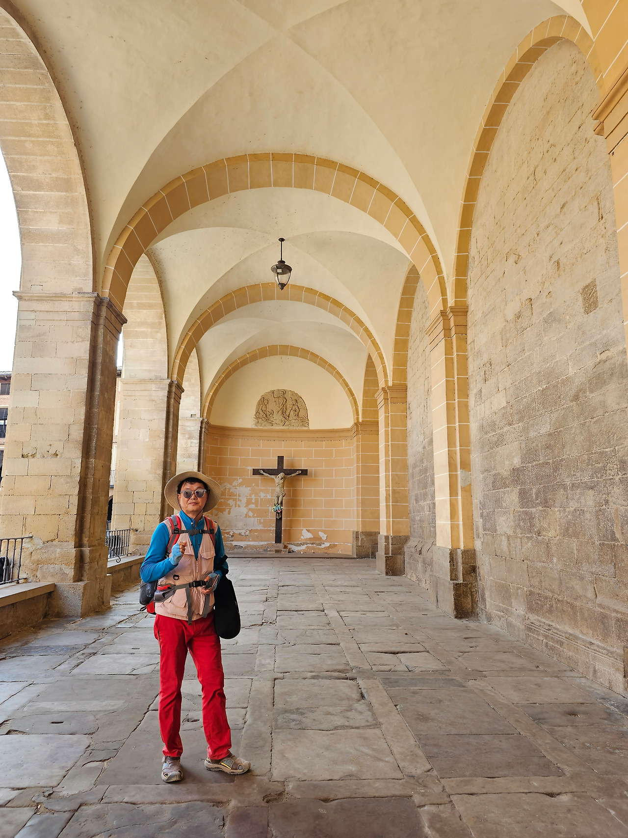 비야마요르 데 몬하르딘(Villamayor de Monjardin)을 떠난 우리는 끝없이 펼쳐져 있는 까미노를 따라 아득한 포도밭 사이로 내려간다. 우르비욜라(Urboola) 마을 옆을 지나 N-111 도로를 따라 검정 버드나무 숲을 왼쪽으로 끼고 걷기를 계속한다. 이 길에는 까미노 싸인이 잘 표시되어 있고, 쭉 뻗은 넓은 농지를 지나기 때문에 로스 아르꼬스까지 약간 지루하고 감흥이 없는 코스이다. 뙤약볕에서 3시간이 넘게 광활한 공간을 침묵과 함께 걷다 보면 자신도 모르게 내가 무슨 짓을 하고 있는 건가라고 생각할 수도 있다. 지난 시간의 어려움과 그간의 추억들도 되새김 한다. 이 길을 가기 전에 물통을 채울 수 있는 기회는 우르비욜라(Urbiola)에서 올레후아(Olejua)로 이어지는 아스팔트 도로와 만나는 교차점에 있는 음수대를 이용하면 된다. 로스 아르꼬스((Los Arcos)에 도착하기 약 2킬로미터 전에 라스 끄루세스(Las Cruces) 언덕에 있는 소나무 숲 이외에는 따가운 스페인의 햇살을 피할 그늘조차도 없으니, 따가운 햇살을 즐기면서 걷는 것이 더 마음에 이롭다. 로스 아르꼬스로 가는 길은 전반적으로 내리막길이다. 몬하르딘 마을이 해발 675m이고 로스 아르코스가 475m이다. 로스 아르코스는 15세기와 16세기를 거치면서 까스띠야 왕국과 나바라 왕국의 경계에 위치한 도시로서 두 왕국 어느 곳에도 세금을 내지 않으며, 두 왕국의 상업적 특성을 잘 이용해 부를 축척했던 마을이다. 발코니가 있는 아름다운 집들 사이의 조그만 골목길을 지나다 보면 길은 어느새 조그만 광장 왼쪽으로 아름다운 산따 마리아 성당을 지나 까스띠야 문을 통과하게 된다.