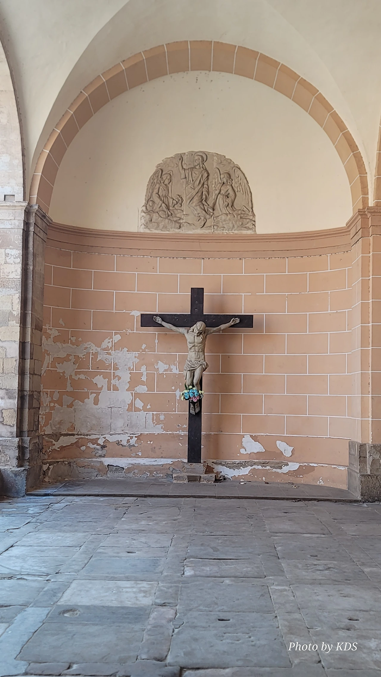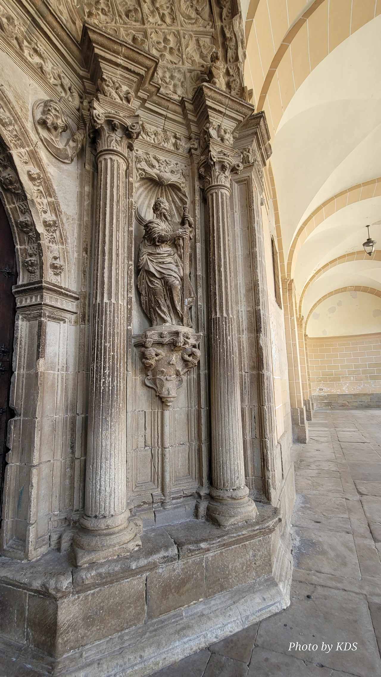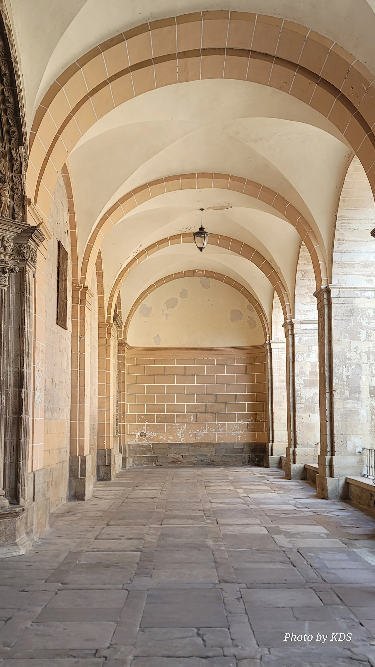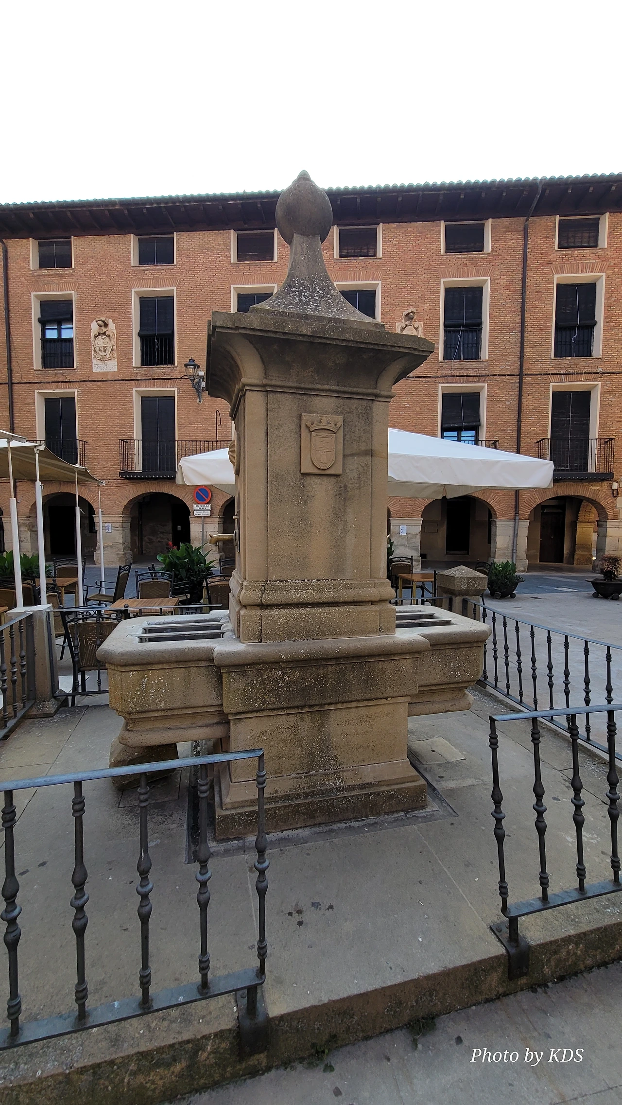 비야마요르 데 몬하르딘(Villamayor de Monjardin)을 떠난 우리는 끝없이 펼쳐져 있는 까미노를 따라 아득한 포도밭 사이로 내려간다. 우르비욜라(Urboola) 마을 옆을 지나 N-111 도로를 따라 검정 버드나무 숲을 왼쪽으로 끼고 걷기를 계속한다. 이 길에는 까미노 싸인이 잘 표시되어 있고, 쭉 뻗은 넓은 농지를 지나기 때문에 로스 아르꼬스까지 약간 지루하고 감흥이 없는 코스이다. 뙤약볕에서 3시간이 넘게 광활한 공간을 침묵과 함께 걷다 보면 자신도 모르게 내가 무슨 짓을 하고 있는 건가라고 생각할 수도 있다. 지난 시간의 어려움과 그간의 추억들도 되새김 한다. 이 길을 가기 전에 물통을 채울 수 있는 기회는 우르비욜라(Urbiola)에서 올레후아(Olejua)로 이어지는 아스팔트 도로와 만나는 교차점에 있는 음수대를 이용하면 된다. 로스 아르꼬스((Los Arcos)에 도착하기 약 2킬로미터 전에 라스 끄루세스(Las Cruces) 언덕에 있는 소나무 숲 이외에는 따가운 스페인의 햇살을 피할 그늘조차도 없으니, 따가운 햇살을 즐기면서 걷는 것이 더 마음에 이롭다. 로스 아르꼬스로 가는 길은 전반적으로 내리막길이다. 몬하르딘 마을이 해발 675m이고 로스 아르코스가 475m이다. 로스 아르코스는 15세기와 16세기를 거치면서 까스띠야 왕국과 나바라 왕국의 경계에 위치한 도시로서 두 왕국 어느 곳에도 세금을 내지 않으며, 두 왕국의 상업적 특성을 잘 이용해 부를 축척했던 마을이다. 발코니가 있는 아름다운 집들 사이의 조그만 골목길을 지나다 보면 길은 어느새 조그만 광장 왼쪽으로 아름다운 산따 마리아 성당을 지나 까스띠야 문을 통과하게 된다.