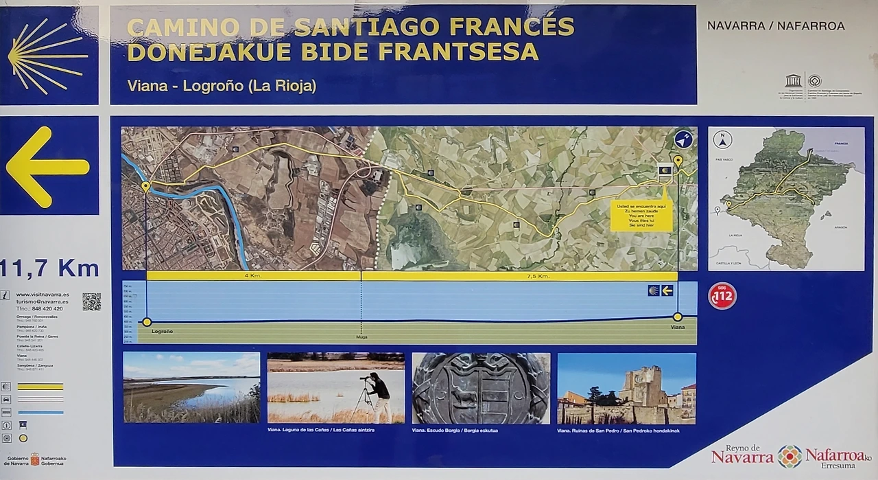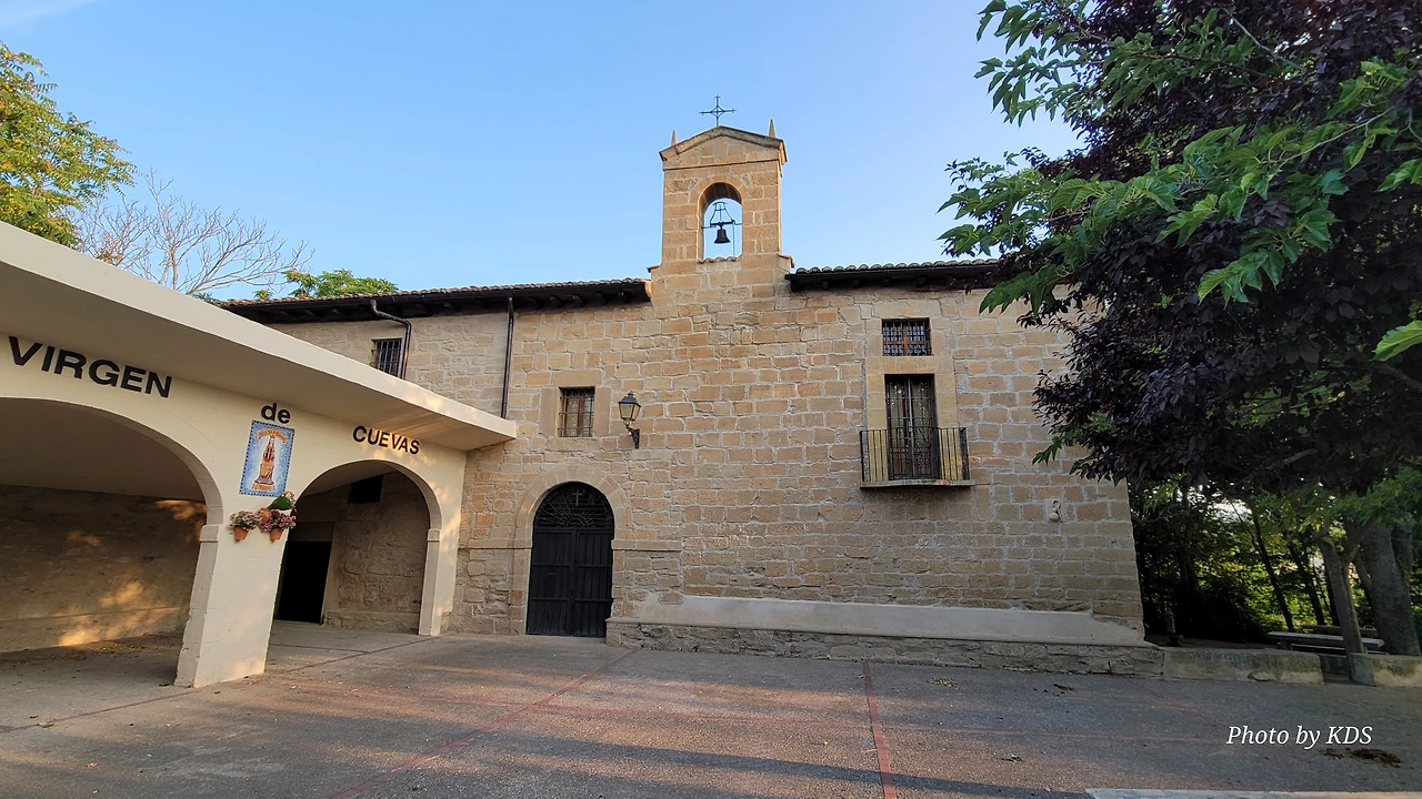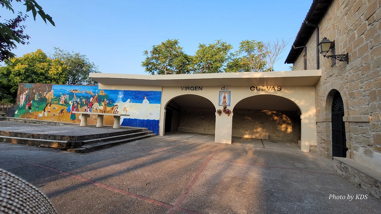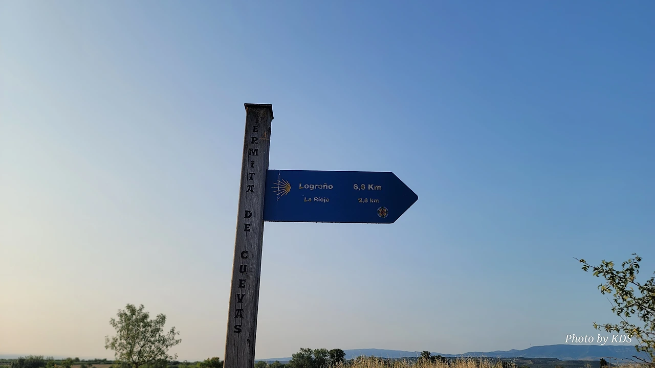 비아나에서 로그로뇨까지는 약 12Km 남짓하다. 약간의 내리막 길이고 특별한 어려움이 없는 평이한 길이다. 비아나의 오래된 성채에서 까미노 길 표시를 따라서 마을로 처음 들어왔던 입구와 반대편으로 여기를 빠져나가면 된다. 자동차 전용도로를 등지고 걸으면 로그로뇨로 향하는 붉은 아스팔트로 포장된 길로 접어들게 된다. 주변에 비아나를 에워싸고 있는 포도 과수원이 많이 있다. 학교와 성벽 사이의 N-111 고속도로를 건너면 아스팔트로 포장된 길이 약 2킬로미터 정도 이어진다. 그곳에 '성모의 동굴'이라는 뜻의 비르헨 데 라스 꾸에바스(Virgen de las Cuevas)라는 수도원이 기다린다. 담벼락에 아름다운 벽화가 그려져 있어서 피곤한 순례객의 눈길을 즐겁게 한다. 옛날부터 많은 순례자들은 이곳에서 몸과 마음을 추슬렀다고 한다. 좀 더 내려가다가 보면 왼쪽으로 까냐스 연못(Laguna de las Cañas)를 지나쳐 울창한 소나무 숲을 통과하면 또 고속도로를 건너야 한다.