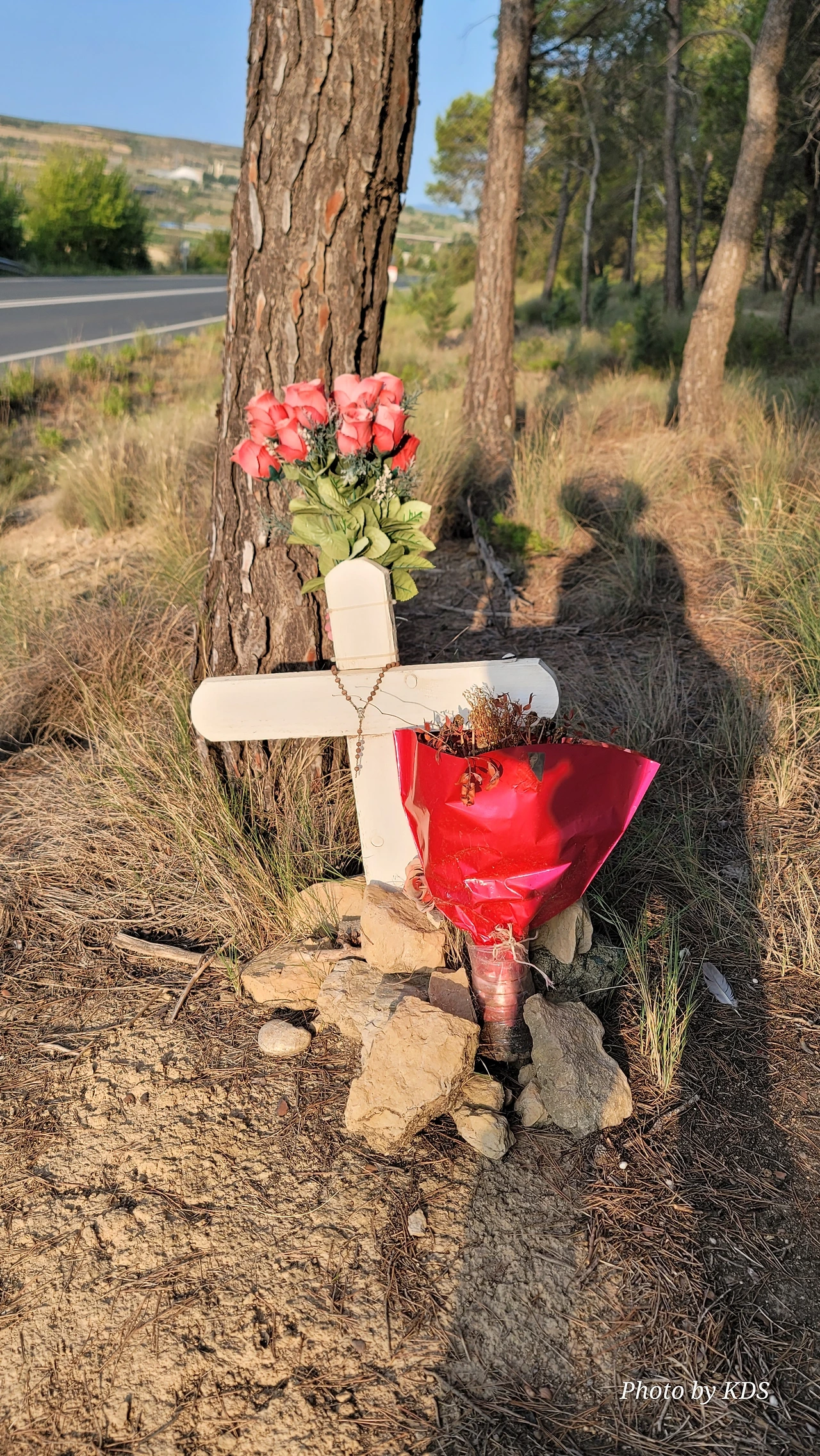 고속도로를 넘어서 로그로뇨로 가는 길옆에 소나무 숲이 우거진 곳이 있다. 이곳에 먼저 간 순례객이 묻혀있다. 순례길을 걷다가 하늘의 부름은 받은 사람들의 무덤이나 이들을 기리는 십자가가 길섭에 가끔 보인다. 병든 몸을 이끌고 순례길에 들었던 사람도 있겠지만 멀쩡한 육신으로 왔다가 병이 얻거나 다른 연유로 천국으로 먼저 간 사람들을 기리는 것이다. 순례길을 가가다 이런 무덤이나 기념물을 보면 그냥 지나치기가 거시기해서 늘 잠깐이라도 묵념을 하고 사진 한 컷이라도 남기고 싶었다. 이곳에는 누군가가 아주 예쁜 꽃다발을 가져다 장식을 해주었다. 오래된 꽃다발은 벌써 변색이 되었고, 십자가에 묵주도 걸려있다. 보는 사람의 마음이 숙연해진다. 제대로 된 십자가를 못 세우면 돌무더기로라도 십자가를 만들어서 기념하고 있다.