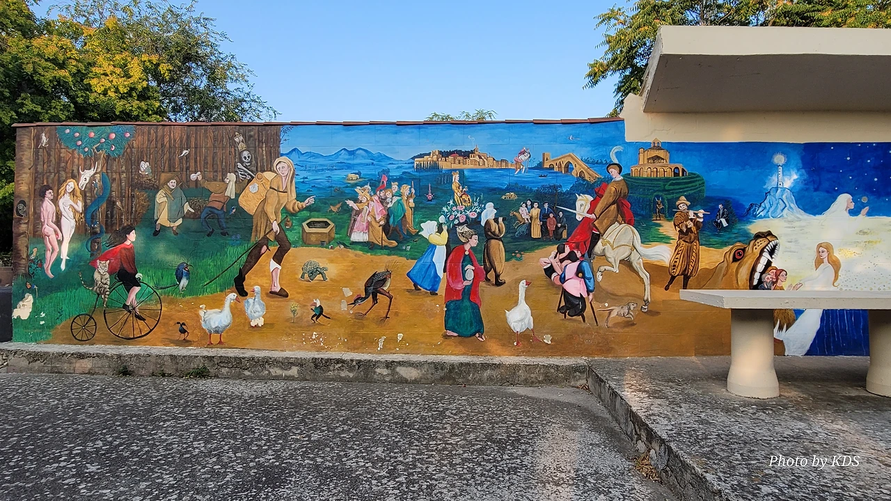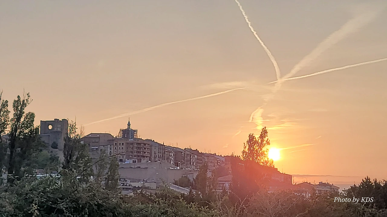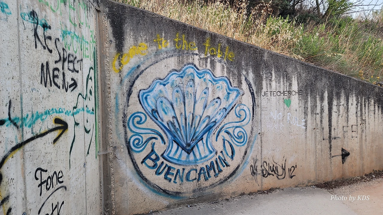 떠나온 비아나 마을 위로 아침해가 불게 떠오르고 있다. 어젯밤의 광란의 축제는 태양빛에 바래서 또 다른 야사와 전설을 만들면서 각자 역사의 뒷장을 장식하고 멀어져 가는 것이다. 도로변의 벽에 부엔 카미노라고 조개껍질 싸인을 멋지게 그려 놓은 게 보였다. 이런 것들을 보면서 걸으면 덜 피곤하다.