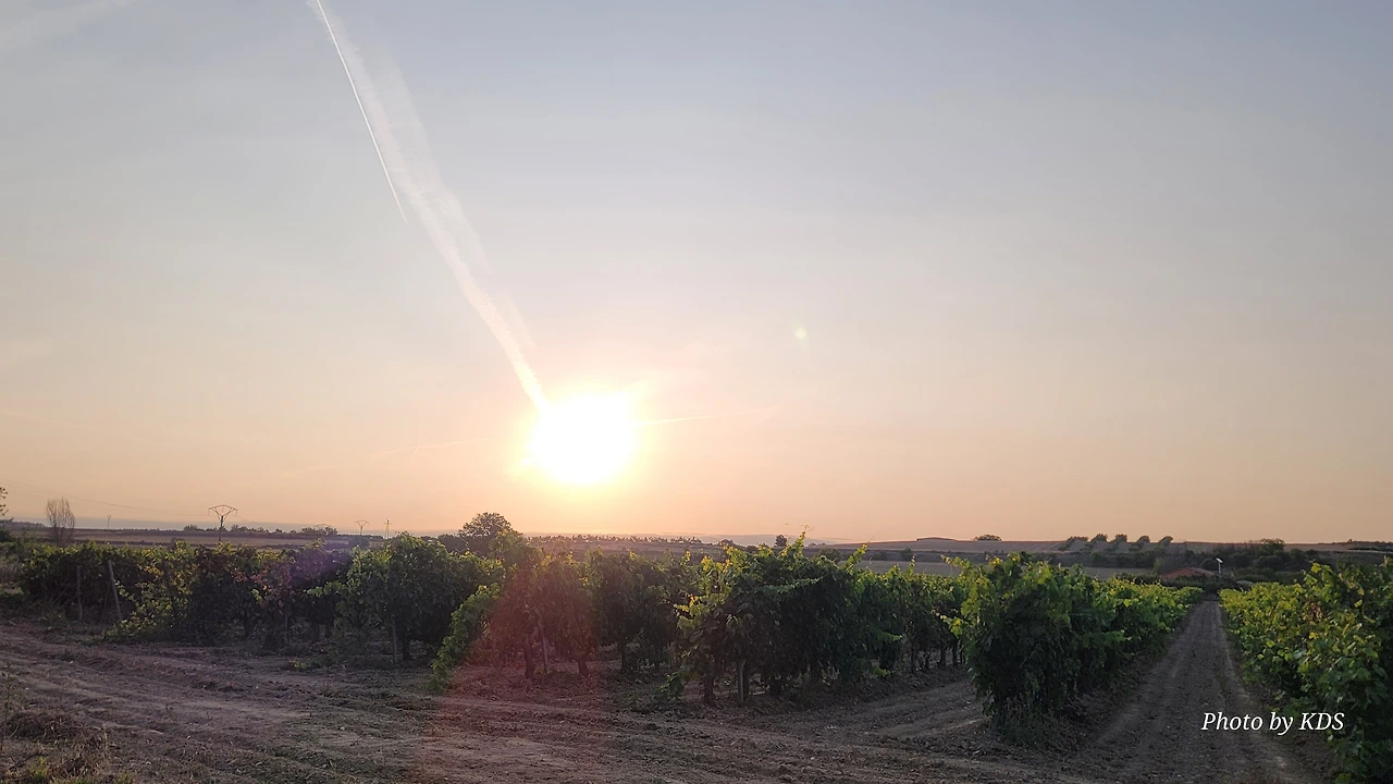 스페인의 뜨거운 태양아래서 포도알은 알알이 영글어가고, 이들은 다시 몸을 녹여서 누군가의 입을 즐겁게 해주는 천사의 물방울 즉 비노(Vino : Wine)가 되는 것이다. 와인을 만드는 포도는 우리나라에서 과일로 먹는 포도와 품종이 다르기 때문에 잘 익은 포도를 따서 맛을 보아도 우리 토양에서 자나고 익은 그 포도의 맛이 아니다. 거봉포도아 샤인 머스캣(비록 일본종자이지만) 같은 포도의 감칠맛은 전혀 기대할 수 없다. 순례길 옆으로 그렇게 많은 포도밭이 있고 포도가 까맣게 익어가도 어느 누구 한 명의 순례객도 포도송이에 손을 대지 않는다.