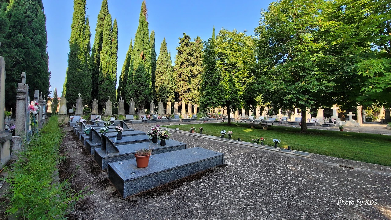옛날 김산갓 선배도 마을에 잔치집이 있으면 가서 축하시 한수 읊어 주고 거하게 대접을 받고, 초상집에도 들어가서 문상을 하고 막걸리와 요기를 해결했던 것이 아닐까. 조선 과객 금삿갓도 바로 길 옆에서 장례식이 열리는데 조문을 하지 않고 서야 발길이 떨어지지 않지. 막걸리나 와인 한 잔을 얻어 마시려는 의도는 전혀 없음을 만천하에 밝힌다. 하긴 영화에서 보면 서양 장례식은 그저 형식적인 의례만 하고 손미에게 밥이나 술 같은 음식 대접은 하지 않더구먼. 그런 줄 알고 간 것이니 전혀 술 욕심이 아닌 걸 독자님들은 아실 거다. 거물급 유지의 장례식인지 문상객도 많고 제법 엄숙하게 거행되고 있었다. 조선 과객의 예의범절 상으로 남의 장례식 행사를 사진으로 남길 수는 없어서 공원묘지를 한바뀌 둘러보고 나왔다. 이제까지 순례길에서 거쳐온 마을마다 많은 묘지를 보았지만, 이 로그로뇨시의 묘지가 최고로 크고 무덤과 비석들이 가장 화려하고 비까 번쩍했다. 역시 부자 동네의 묘지는 뭔가 돈을 들여서 뽐낸 티가 완연하다. 마치 후세에 가문이 번성해서 조상들의 무덤을 으리으리하게 새 단장하는 조선의 권세가나 재벌가 행태를 닮았다. 대학자 퇴계선생도 당신의 무덤은 작게 하고 비석은 더욱 소박하게 만들되 당신께서 쓴 자명(自銘)을 넣으라고 했는데.