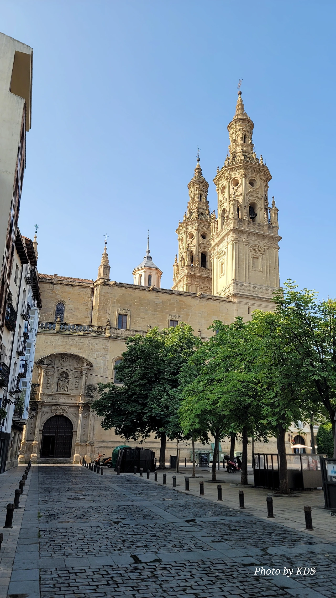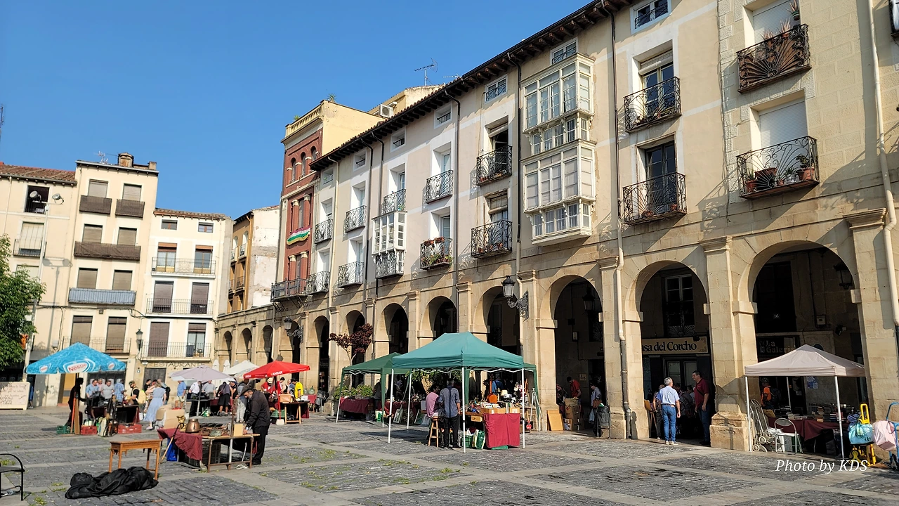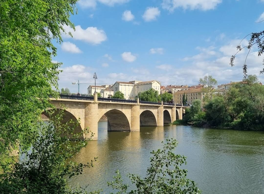로그로뇨 시내로 들어가기 위해서 에브로 강 위에 놓인 비에드라 다리(Puente de Piedra)를 건너야 된다. 다리를 건너기 전에 도로의 로터리에 조형물이 서있다. 반원의 철근 조형물을 받치고 있는 3개의 기둥에는 여러 사람의 조각들이 부착되어 있다. 전하는 이야기에 따르면 산또 도밍고 데 라 깔사다의 제자인 산 후안 데 오르떼가가 12개의 아치와 세 개의 방어용 탑이 있는 석조 다리를 지었다고 한다. 이 다리는 이후 일곱 개의 아치와 원통형 기둥이 있는 다리로 개축되었다. 1917년 늘어나는 교통량 때문에 콘크리트를 사용하여 다리를 현대화했단다. 다리 건너편에는 산 후안 데 오르떼가에게 봉헌된 성당이 있다.