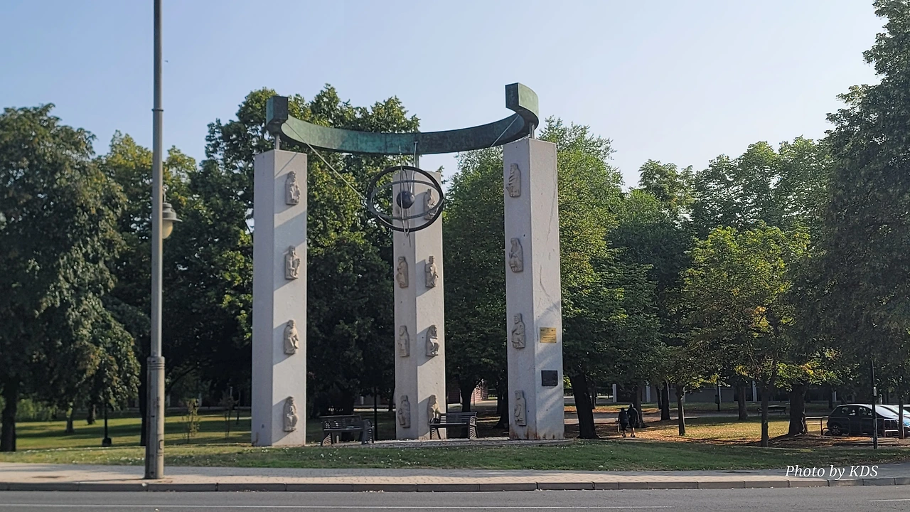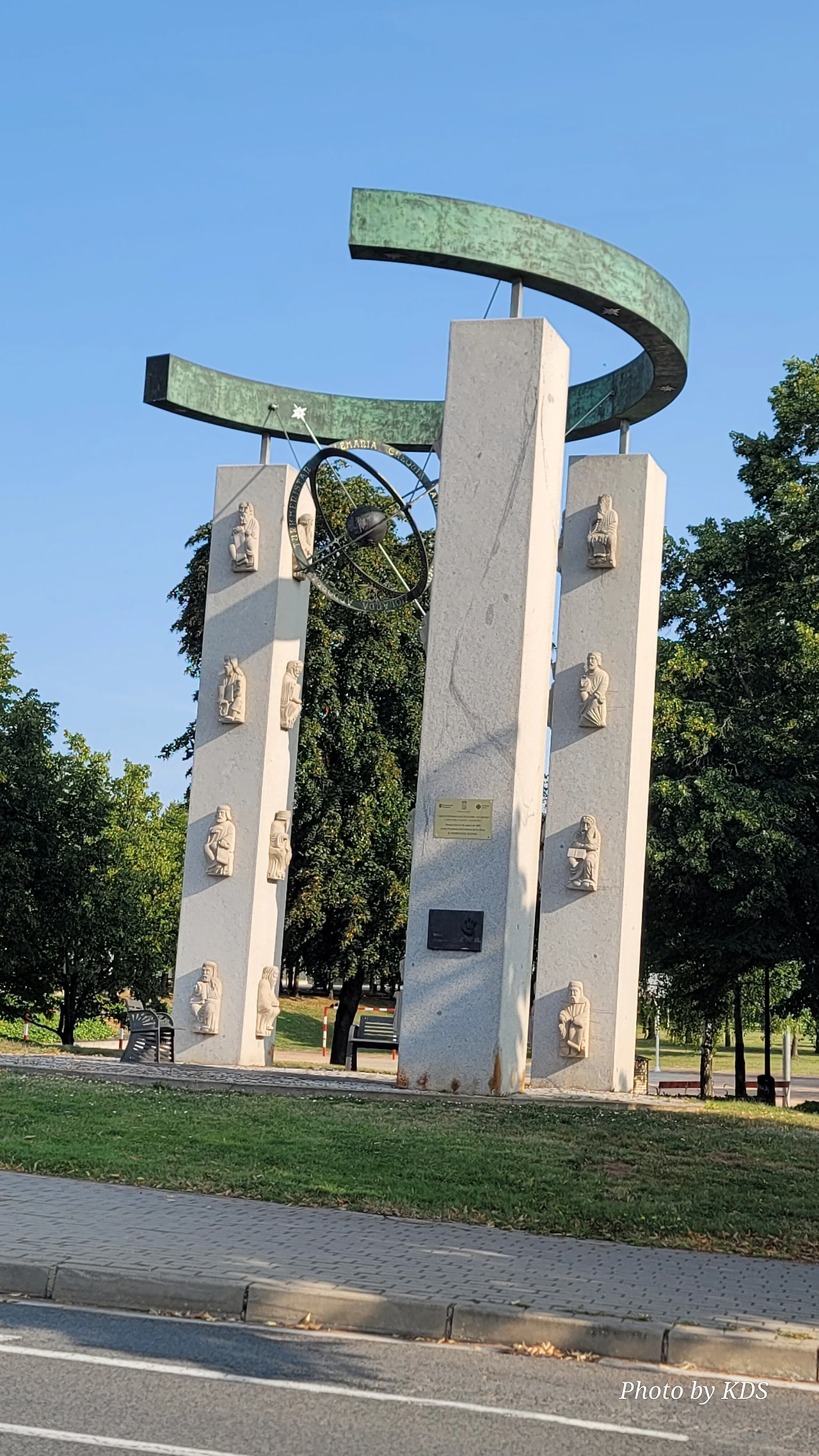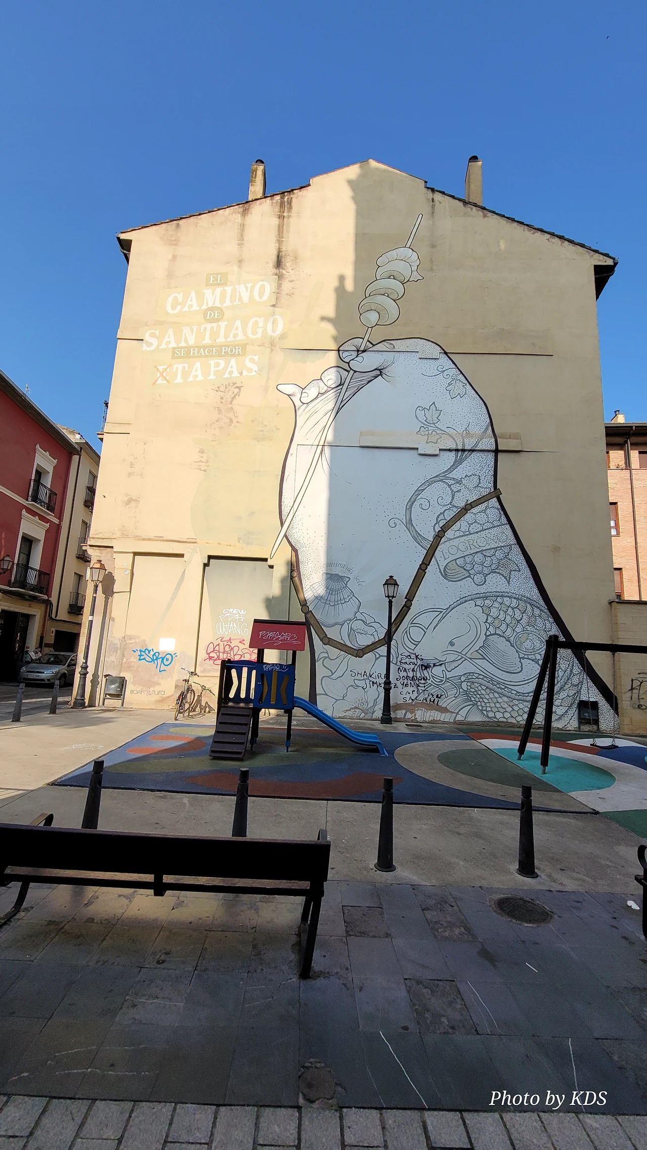 로그로뇨 시내로 들어가기 위해서 에브로 강 위에 놓인 비에드라 다리(Puente de Piedra)를 건너야 된다. 다리를 건너기 전에 도로의 로터리에 조형물이 서있다. 반원의 철근 조형물을 받치고 있는 3개의 기둥에는 여러 사람의 조각들이 부착되어 있다. 전하는 이야기에 따르면 산또 도밍고 데 라 깔사다의 제자인 산 후안 데 오르떼가가 12개의 아치와 세 개의 방어용 탑이 있는 석조 다리를 지었다고 한다. 이 다리는 이후 일곱 개의 아치와 원통형 기둥이 있는 다리로 개축되었다. 1917년 늘어나는 교통량 때문에 콘크리트를 사용하여 다리를 현대화했단다. 다리 건너편에는 산 후안 데 오르떼가에게 봉헌된 성당이 있다.