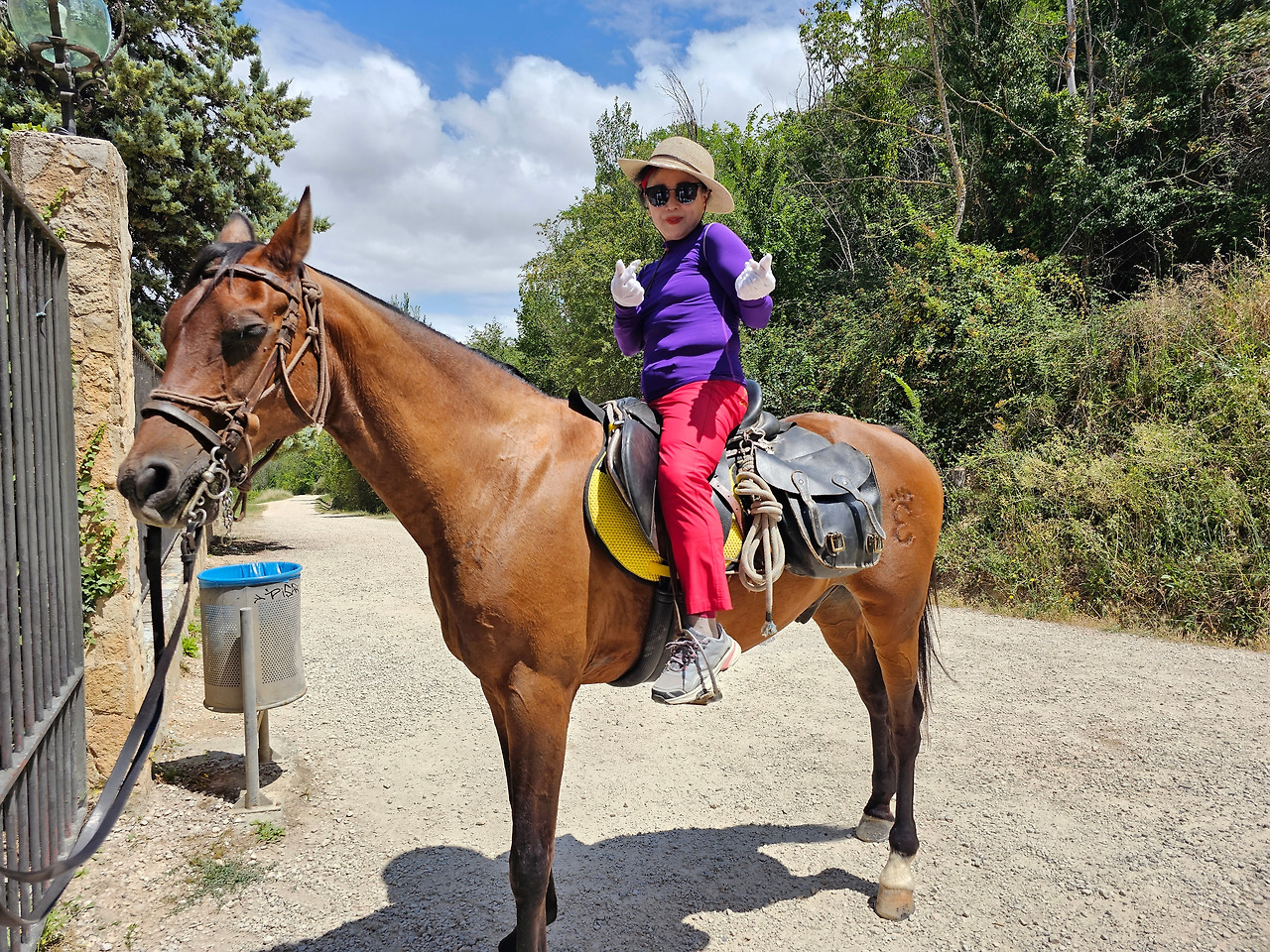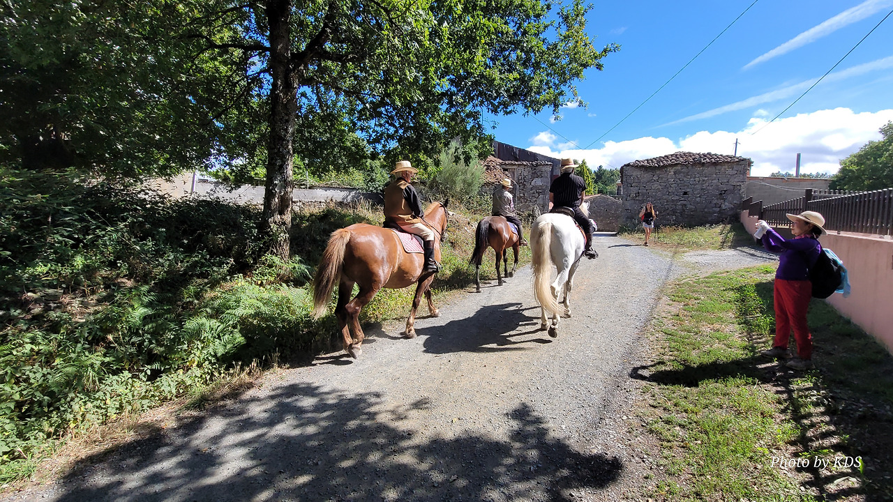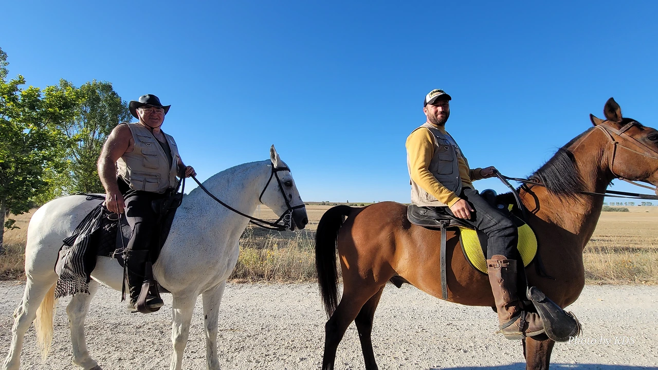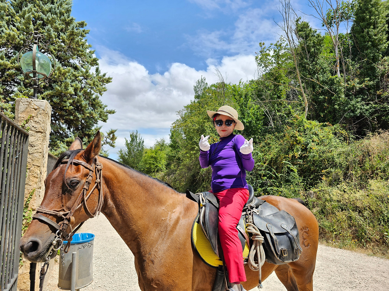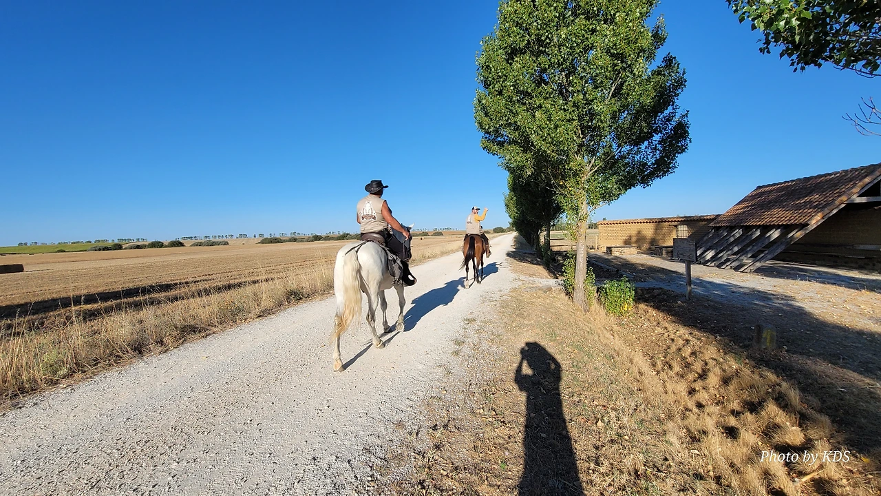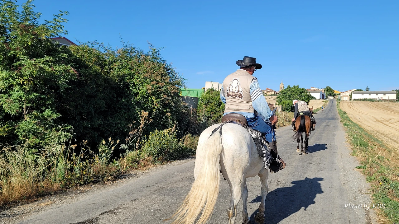 무슨 이유로 더 고행이냐고 물어보았다. 말은 타고 가면 물론 걸어가는 것보다는 다리도 발도 덜 아프고 힘도 덜 들지만 다른 모든 것이 더 불편하다고 했다. 첫째로 음식 문제와 숙소 문제가 제일 불편하단다. 도보 순례객은 자기가 먹고 마실 음식과 물을 준비해 걷거나, 그렇지 않으면 길 가다가 길옆의 음식점에서 간단하게 해결할 수 있지만, 승마 순례자는 그것이 아니란다. 본인 음식과 물뿐만 말의 먹이와 물을 따로 준비해야 한단다. 다행히 길옆에 말에게 먹일 풀들이 있으면 공짜로 말의 먹이를 먹일 수 있지만 대부분 농장이고, 아니면 황야라서 말의 먹이가 그리 흔하지 않다. 물 또한 먹일 장소가 제한되어 있단다. 그리고 쉼터도 말의 배설물 등의 폐해로 도보 순례객과 같이 쉬지 못하고 따로 저 멀리 격리해서 쉰단다. 어떨 때는 순례자 본인들의 음식을 배달의 민족 같은 배달업체에게 배달을 시켜서 해결해야 하는 불편함도 있단다. 더구나 숙소는 대부분 마을의 중심부에 있어서 말을 매어 놓을 장소가 없어서 외곽지역에 말을 유숙시키고 먹이를 충분히 사서 먹이고 본인들은 걸어서 숙소를 찾아다녀야 한단다. 그들과 몇 차례 만났다 헤어지길를 반복했지만 도보로 걷는 금삿갓 보다 빠를 때가 별로 없었다. 늘 우리가 쉬고 있을 때 뒤쪽에서 따라온 것이다. 아마 마을 중심부로 통과하지 못하고 멀리 외곽 우회로를 이용해서 그런가 보다. 그들 외에 승합차를 운전해서 그들에게 필요한 물건을 배달해 주고, 말의 먹이나 물도 제공해 주는 지원팀도 같이 움직이면서 800Km 전구간을 이동하고 있었다. 승마 순례객 두 사람이 한 사람의 자동차 지원을 받아 가면서 순례하는 모습이 좀 특이했다. 음주 승마는 허용되는지 몰라도, <와인옹달샘>에서도 같이 많이 마셨고, 중간에 세 번째 만났을 때도 자동차 운전 지원군을 시켜서 생맥주를 많이 배달시켜서 같이 마시기도 했다. 목축업이 주된 지역이 아닌 곳도 길을 걷다보면 이런 말들이 순례길에 커다란 배설물을 남겨 놓은 것이 가끔있는데, 한 눈 팔고 가다보면 금방 실례한 것을 밟아 미끌어져 낭패를 당할 수도 있으니 조심해야 한다.