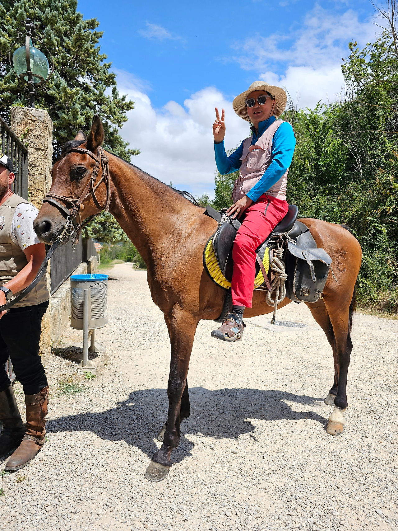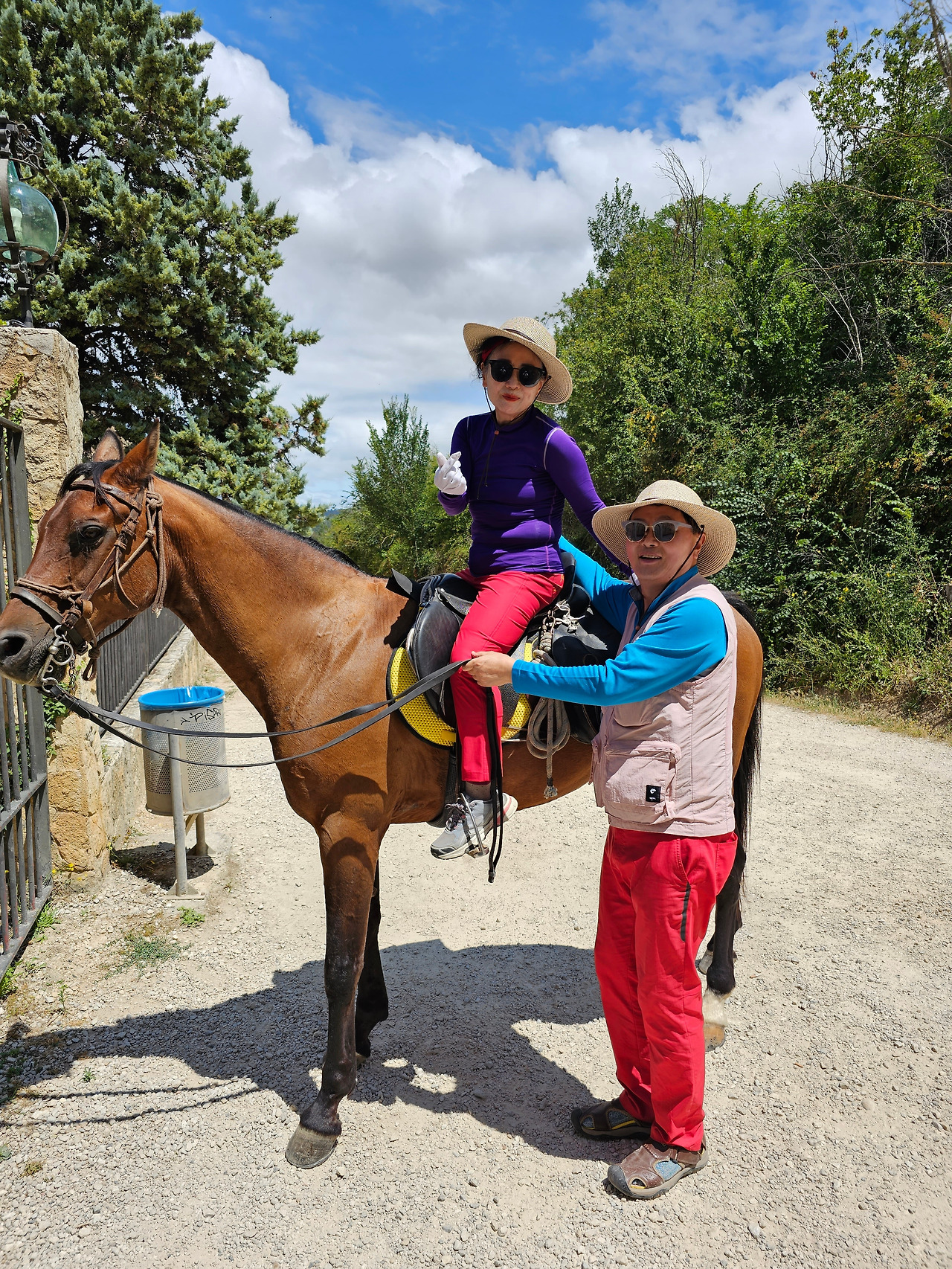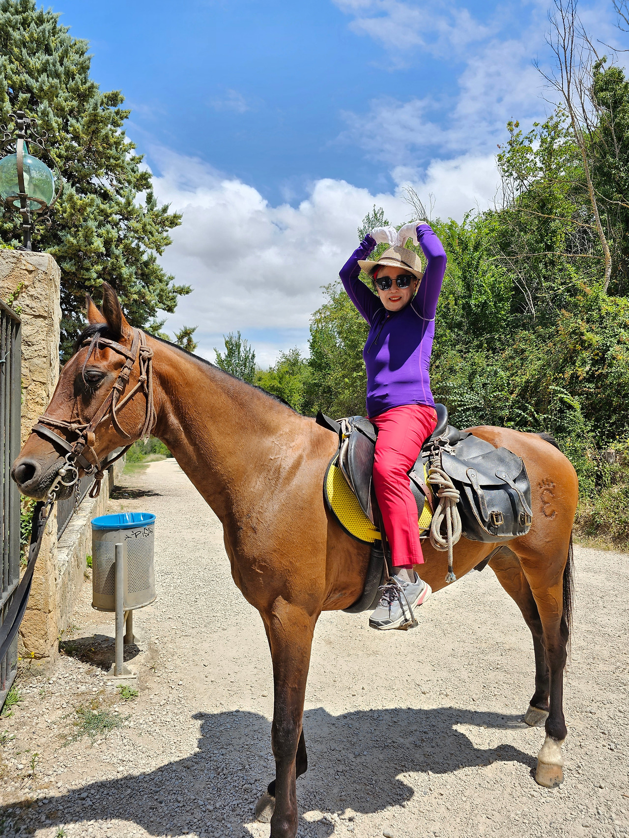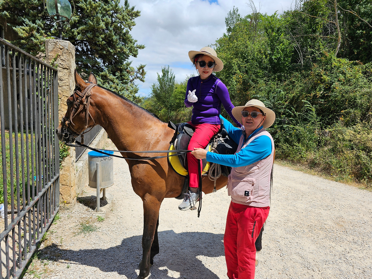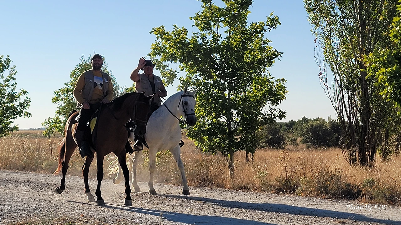 무슨 이유로 더 고행이냐고 물어보았다. 말은 타고 가면 물론 걸어가는 것보다는 다리도 발도 덜 아프고 힘도 덜 들지만 다른 모든 것이 더 불편하다고 했다. 첫째로 음식 문제와 숙소 문제가 제일 불편하단다. 도보 순례객은 자기가 먹고 마실 음식과 물을 준비해 걷거나, 그렇지 않으면 길 가다가 길옆의 음식점에서 간단하게 해결할 수 있지만, 승마 순례자는 그것이 아니란다. 본인 음식과 물뿐만 말의 먹이와 물을 따로 준비해야 한단다. 다행히 길옆에 말에게 먹일 풀들이 있으면 공짜로 말의 먹이를 먹일 수 있지만 대부분 농장이고, 아니면 황야라서 말의 먹이가 그리 흔하지 않다. 물 또한 먹일 장소가 제한되어 있단다. 그리고 쉼터도 말의 배설물 등의 폐해로 도보 순례객과 같이 쉬지 못하고 따로 저 멀리 격리해서 쉰단다. 어떨 때는 순례자 본인들의 음식을 배달의 민족 같은 배달업체에게 배달을 시켜서 해결해야 하는 불편함도 있단다. 더구나 숙소는 대부분 마을의 중심부에 있어서 말을 매어 놓을 장소가 없어서 외곽지역에 말을 유숙시키고 먹이를 충분히 사서 먹이고 본인들은 걸어서 숙소를 찾아다녀야 한단다. 그들과 몇 차례 만났다 헤어지길를 반복했지만 도보로 걷는 금삿갓 보다 빠를 때가 별로 없었다. 늘 우리가 쉬고 있을 때 뒤쪽에서 따라온 것이다. 아마 마을 중심부로 통과하지 못하고 멀리 외곽 우회로를 이용해서 그런가 보다. 그들 외에 승합차를 운전해서 그들에게 필요한 물건을 배달해 주고, 말의 먹이나 물도 제공해 주는 지원팀도 같이 움직이면서 800Km 전구간을 이동하고 있었다. 승마 순례객 두 사람이 한 사람의 자동차 지원을 받아 가면서 순례하는 모습이 좀 특이했다. 음주 승마는 허용되는지 몰라도, <와인옹달샘>에서도 같이 많이 마셨고, 중간에 세 번째 만났을 때도 자동차 운전 지원군을 시켜서 생맥주를 많이 배달시켜서 같이 마시기도 했다. 목축업이 주된 지역이 아닌 곳도 길을 걷다보면 이런 말들이 순례길에 커다란 배설물을 남겨 놓은 것이 가끔있는데, 한 눈 팔고 가다보면 금방 실례한 것을 밟아 미끌어져 낭패를 당할 수도 있으니 조심해야 한다.