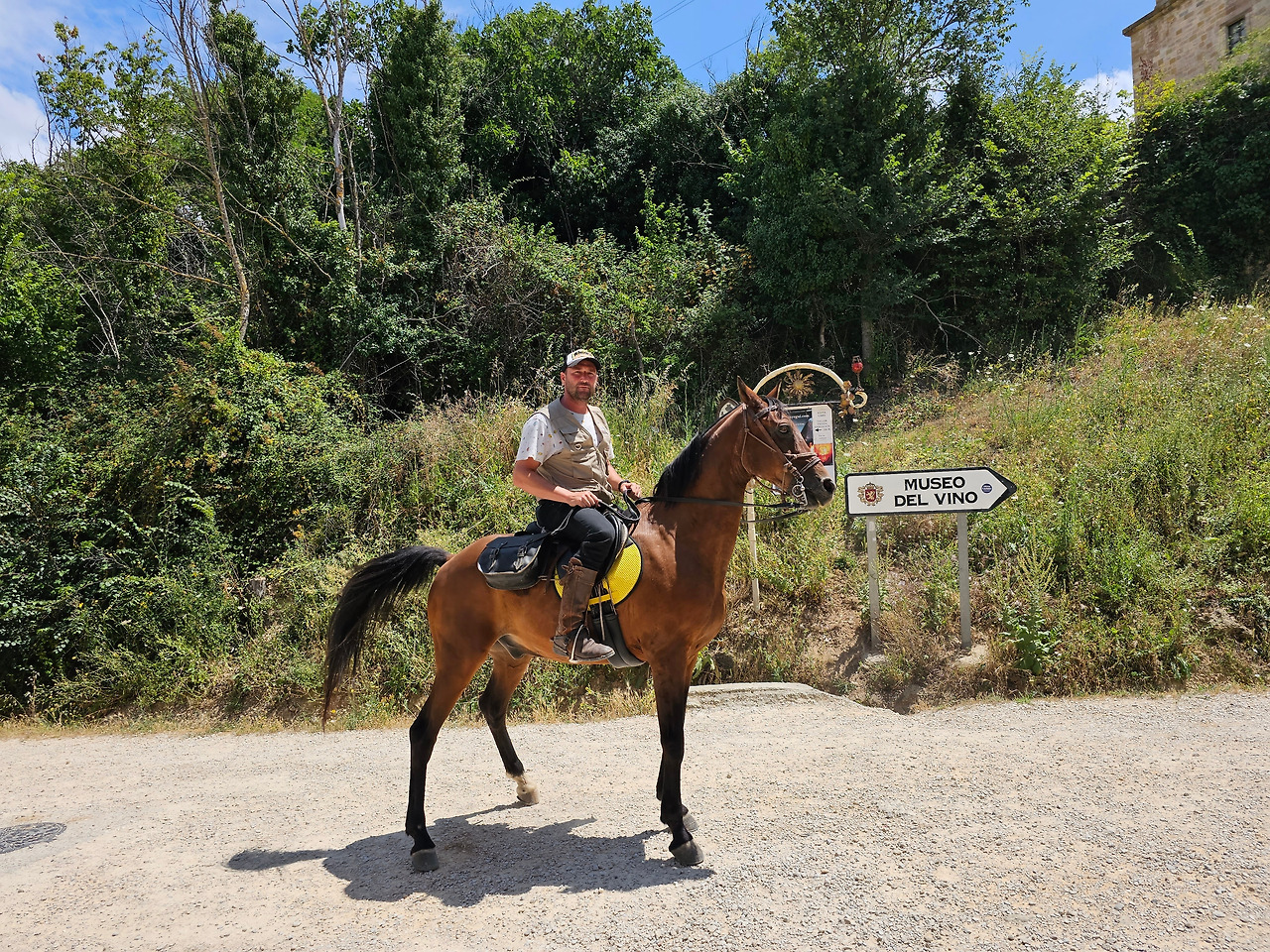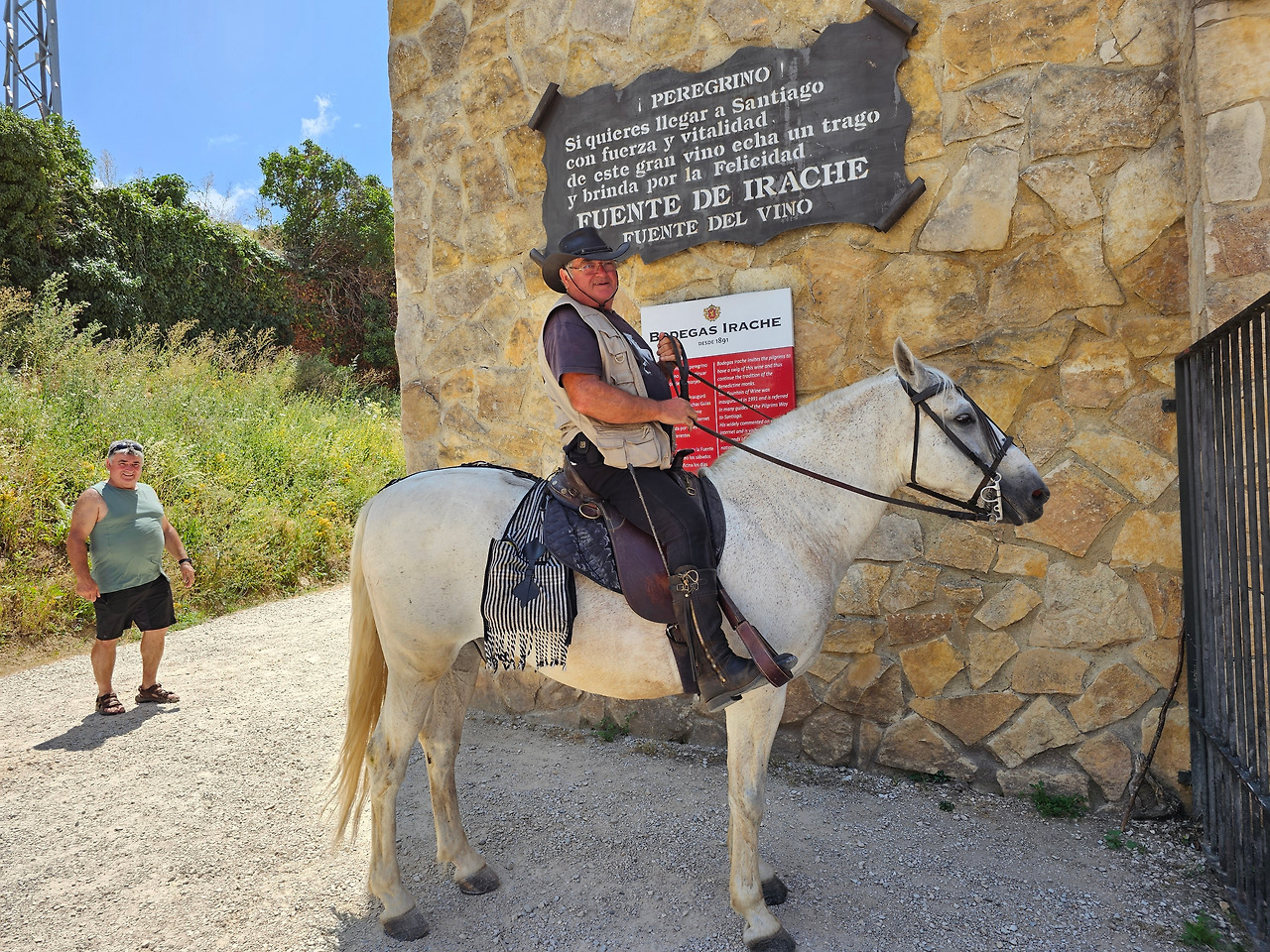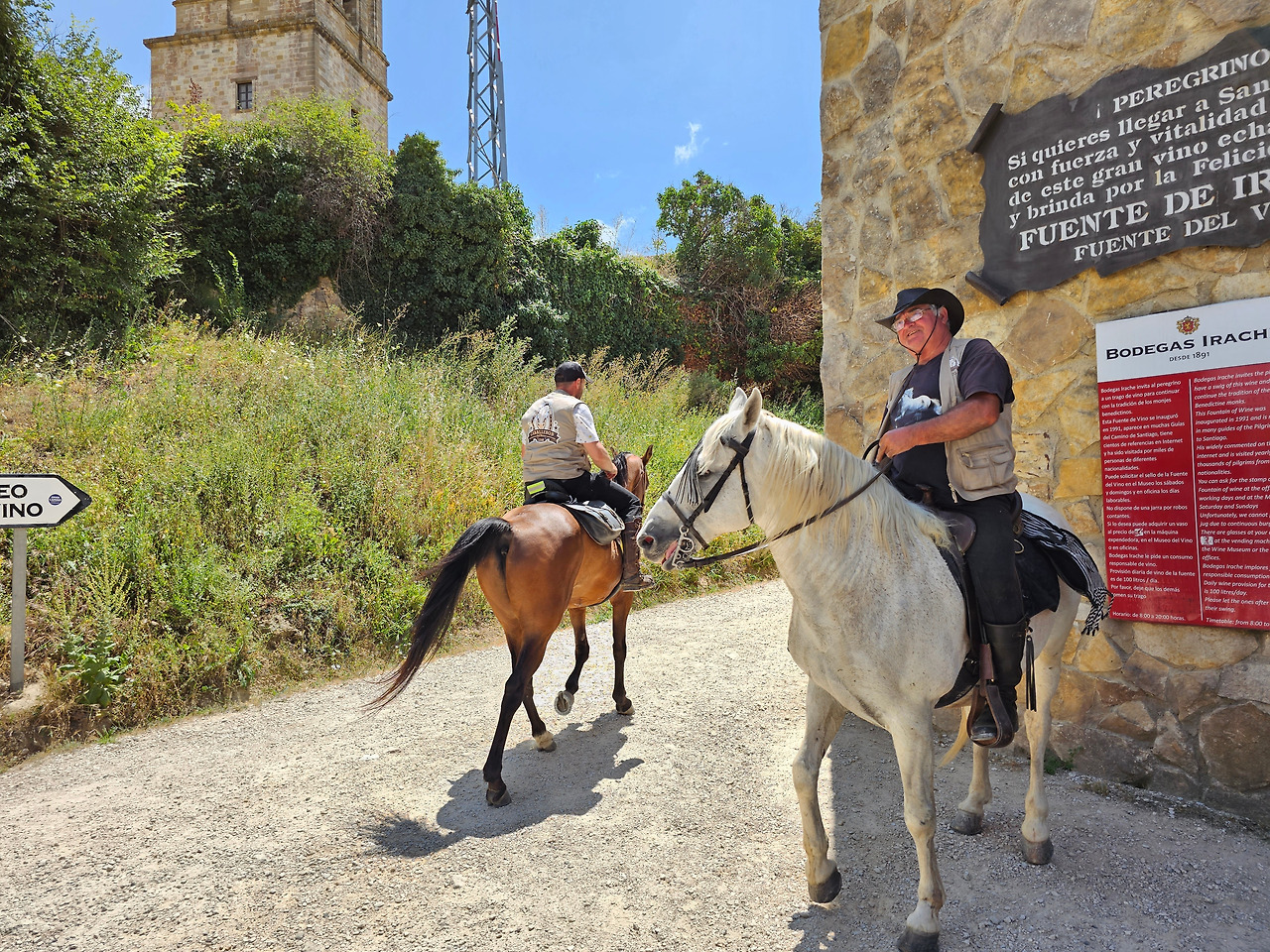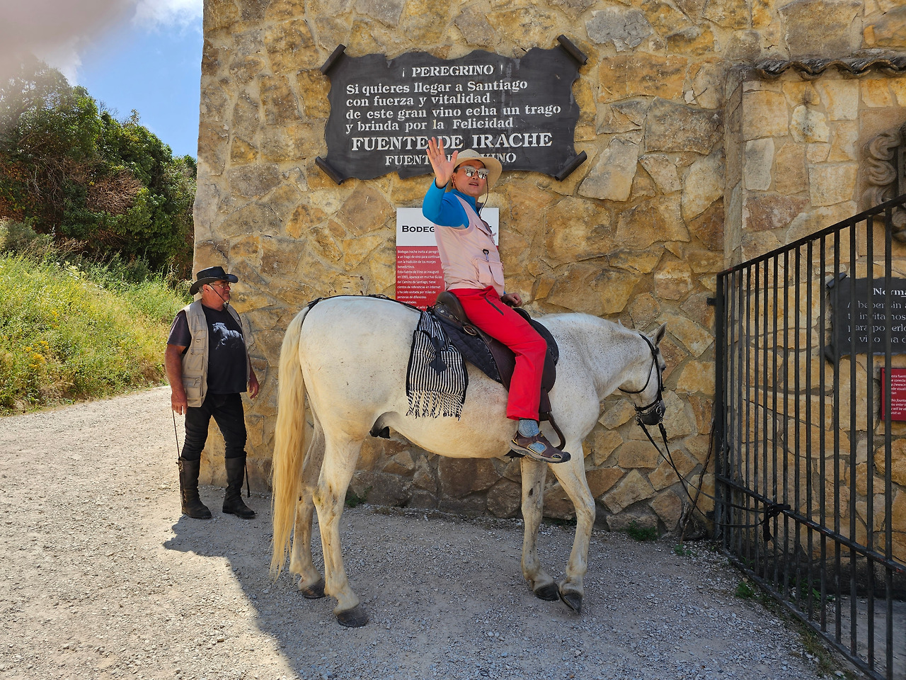 산티아고 순례길의 종착지인 산티아고 데 꼼뽀스뗄라(Santiago de Compostela)의 순례증명서를 발급해 주는 기준이 이동 수단에 따라 각각 다르다. 순수하게 도보로 이동하는 경우에는 최종 종착지에서 최소한 100Km 이상 떨어진 지점에서 순수하게 자기의 도보로 이동해 온 경우에만 인정을 받을 수 있다. 자전거를 타고 이동하는 경우는 200Km 이상이고, 말을 타고 이동하는 경우도 마찬가지다. 현대의 자전거와 말을 같은 교통수단으로 보는 모양이다. 이번에 순례길을 걸으면서 말을 타고 순례하는 스페인 친구들과 같이 걷거나 헤어졌다 만나기를 몇 번 계속했다. 이들은 세비야 근처의 농촌에서 농업을 하는 친구들인데, 조선과객 금삿갓이 순례길을 시작한 지 1주일쯤 되었을 때인 7월 21일에 처음 만났다. 이들을 만난 곳은 아예기(Ayegui) 마을과 아스께따(Azqueta) 마을 사이에 있는 이라체(Irache) 수도원 건물 주변에 있는 <와인옹달샘>이다. 여기서 공짜 와인에 흠뻑 취하고 있는데 이들이 건장한 말을 타고 등장한 것이다. 그래서 거기서 같이 와인을 마시고 이런저런 이야기도 하면서 그들의 말을 타고 사진도 찍고 했다. 말을 타고 순례길을 가니까 편하고 호사스러워 보인다고 했더니 꼭 그런 것이 아니란다. 옛날에는 말을 타고 다니던 게 어느 정도 통용이 되었으니 편리한 것이 많았지만 지금은 말을 타고 다니는 게 도리어 더 고행(苦行)에 가깝다고 했다.
