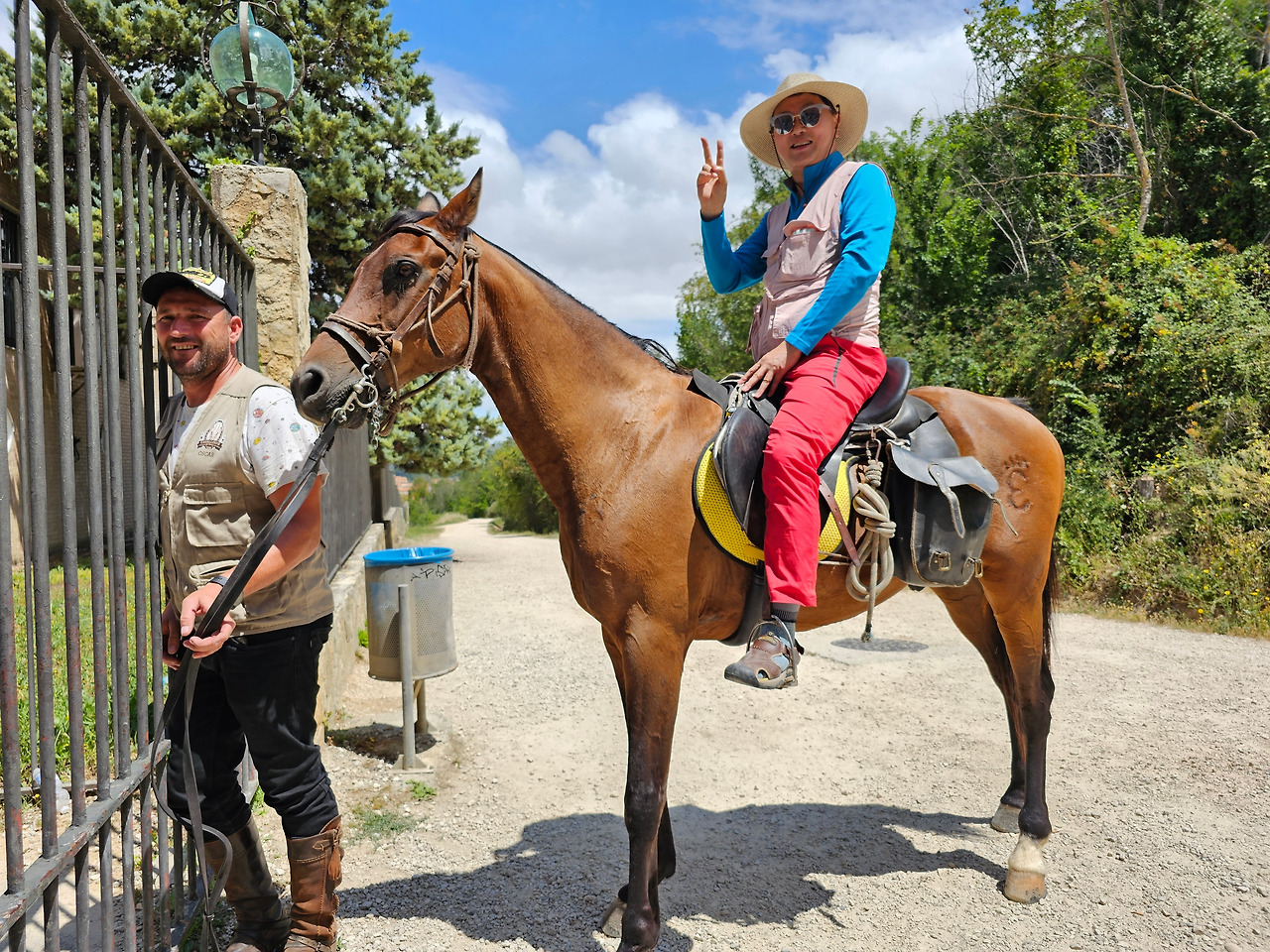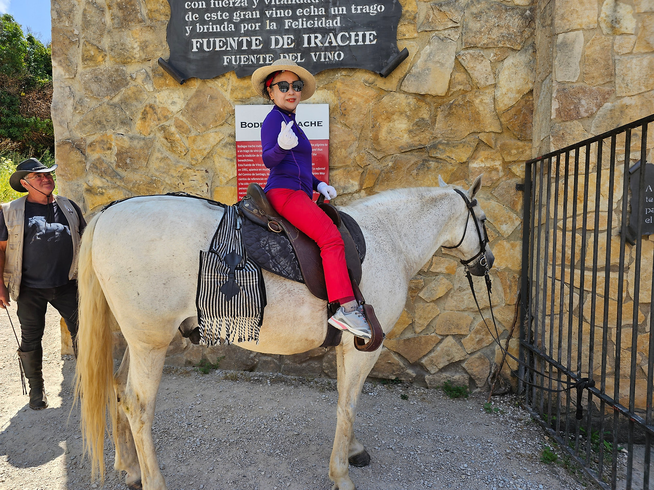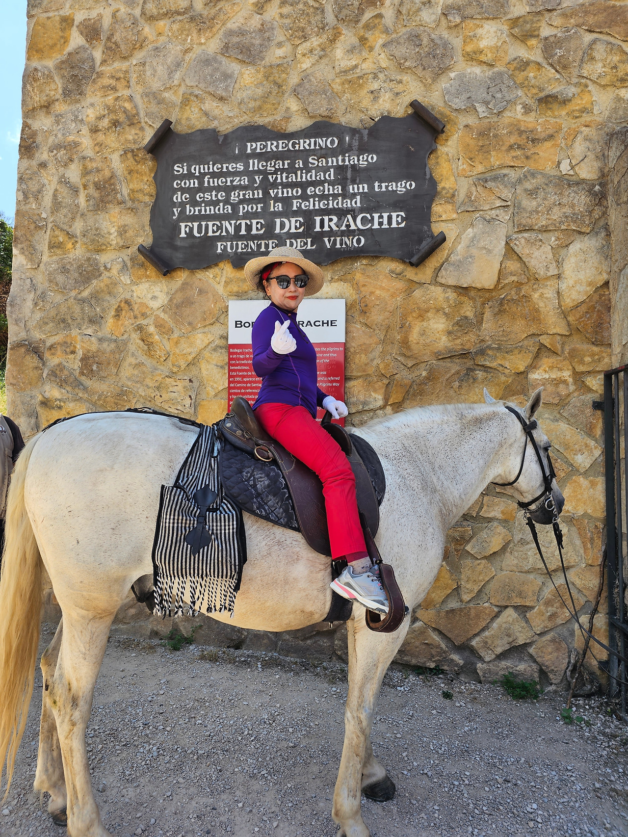 산티아고 순례길의 종착지인 산티아고 데 꼼뽀스뗄라(Santiago de Compostela)의 순례증명서를 발급해 주는 기준이 이동 수단에 따라 각각 다르다. 순수하게 도보로 이동하는 경우에는 최종 종착지에서 최소한 100Km 이상 떨어진 지점에서 순수하게 자기의 도보로 이동해 온 경우에만 인정을 받을 수 있다. 자전거를 타고 이동하는 경우는 200Km 이상이고, 말을 타고 이동하는 경우도 마찬가지다. 현대의 자전거와 말을 같은 교통수단으로 보는 모양이다. 이번에 순례길을 걸으면서 말을 타고 순례하는 스페인 친구들과 같이 걷거나 헤어졌다 만나기를 몇 번 계속했다. 이들은 세비야 근처의 농촌에서 농업을 하는 친구들인데, 조선과객 금삿갓이 순례길을 시작한 지 1주일쯤 되었을 때인 7월 21일에 처음 만났다. 이들을 만난 곳은 아예기(Ayegui) 마을과 아스께따(Azqueta) 마을 사이에 있는 이라체(Irache) 수도원 건물 주변에 있는 <와인옹달샘>이다. 여기서 공짜 와인에 흠뻑 취하고 있는데 이들이 건장한 말을 타고 등장한 것이다. 그래서 거기서 같이 와인을 마시고 이런저런 이야기도 하면서 그들의 말을 타고 사진도 찍고 했다. 말을 타고 순례길을 가니까 편하고 호사스러워 보인다고 했더니 꼭 그런 것이 아니란다. 옛날에는 말을 타고 다니던 게 어느 정도 통용이 되었으니 편리한 것이 많았지만 지금은 말을 타고 다니는 게 도리어 더 고행(苦行)에 가깝다고 했다.