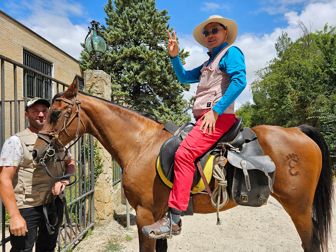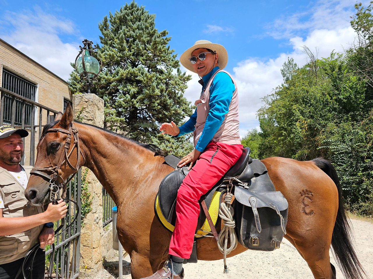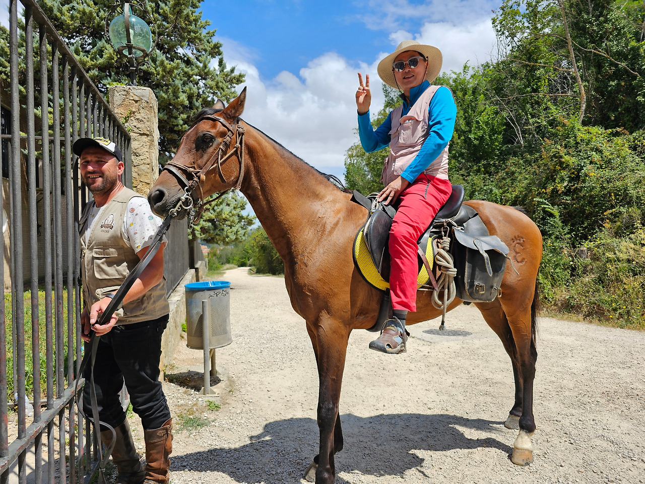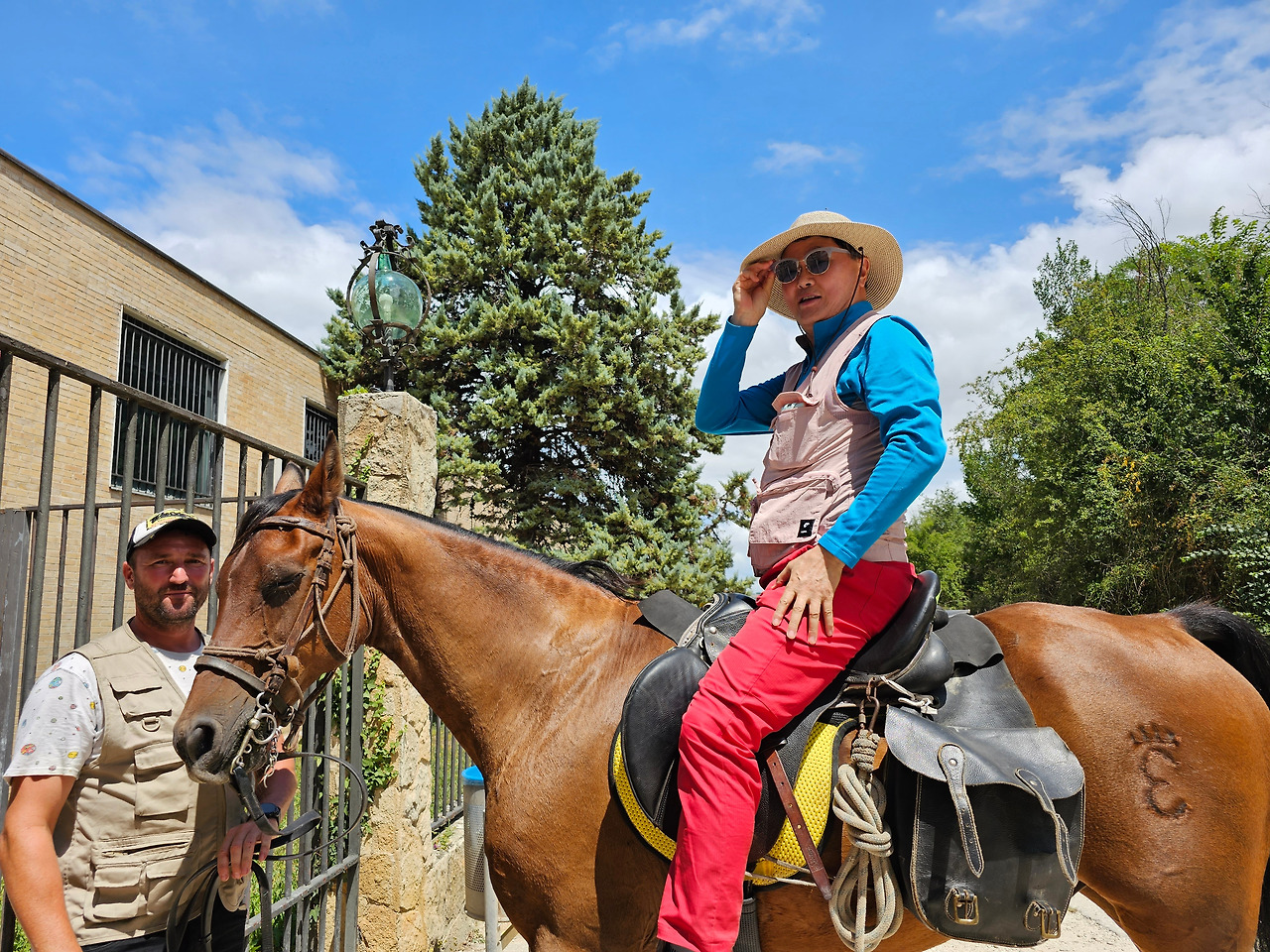 산티아고 순례길의 종착지인 산티아고 데 꼼뽀스뗄라(Santiago de Compostela)의 순례증명서를 발급해 주는 기준이 이동 수단에 따라 각각 다르다. 순수하게 도보로 이동하는 경우에는 최종 종착지에서 최소한 100Km 이상 떨어진 지점에서 순수하게 자기의 도보로 이동해 온 경우에만 인정을 받을 수 있다. 자전거를 타고 이동하는 경우는 200Km 이상이고, 말을 타고 이동하는 경우도 마찬가지다. 현대의 자전거와 말을 같은 교통수단으로 보는 모양이다. 이번에 순례길을 걸으면서 말을 타고 순례하는 스페인 친구들과 같이 걷거나 헤어졌다 만나기를 몇 번 계속했다. 이들은 세비야 근처의 농촌에서 농업을 하는 친구들인데, 조선과객 금삿갓이 순례길을 시작한 지 1주일쯤 되었을 때인 7월 21일에 처음 만났다. 이들을 만난 곳은 아예기(Ayegui) 마을과 아스께따(Azqueta) 마을 사이에 있는 이라체(Irache) 수도원 건물 주변에 있는 <와인옹달샘>이다. 여기서 공짜 와인에 흠뻑 취하고 있는데 이들이 건장한 말을 타고 등장한 것이다. 그래서 거기서 같이 와인을 마시고 이런저런 이야기도 하면서 그들의 말을 타고 사진도 찍고 했다. 말을 타고 순례길을 가니까 편하고 호사스러워 보인다고 했더니 꼭 그런 것이 아니란다. 옛날에는 말을 타고 다니던 게 어느 정도 통용이 되었으니 편리한 것이 많았지만 지금은 말을 타고 다니는 게 도리어 더 고행(苦行)에 가깝다고 했다.