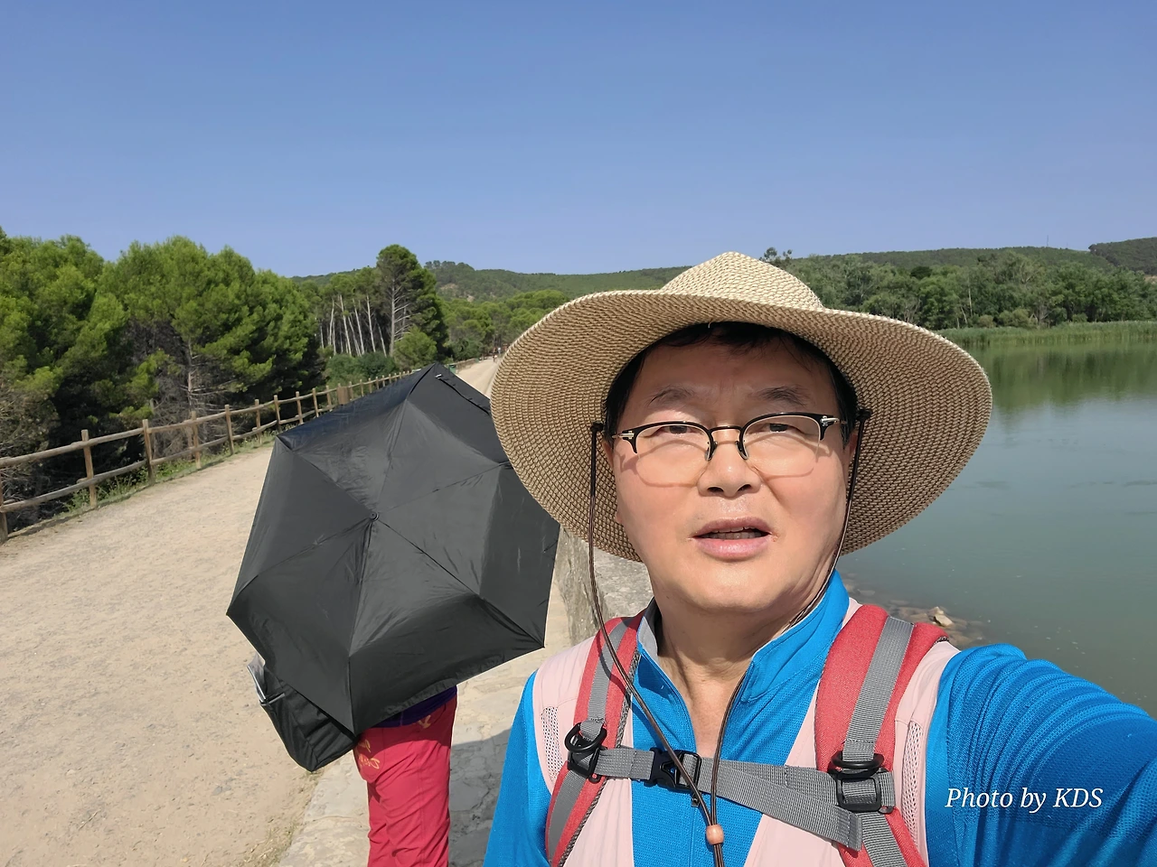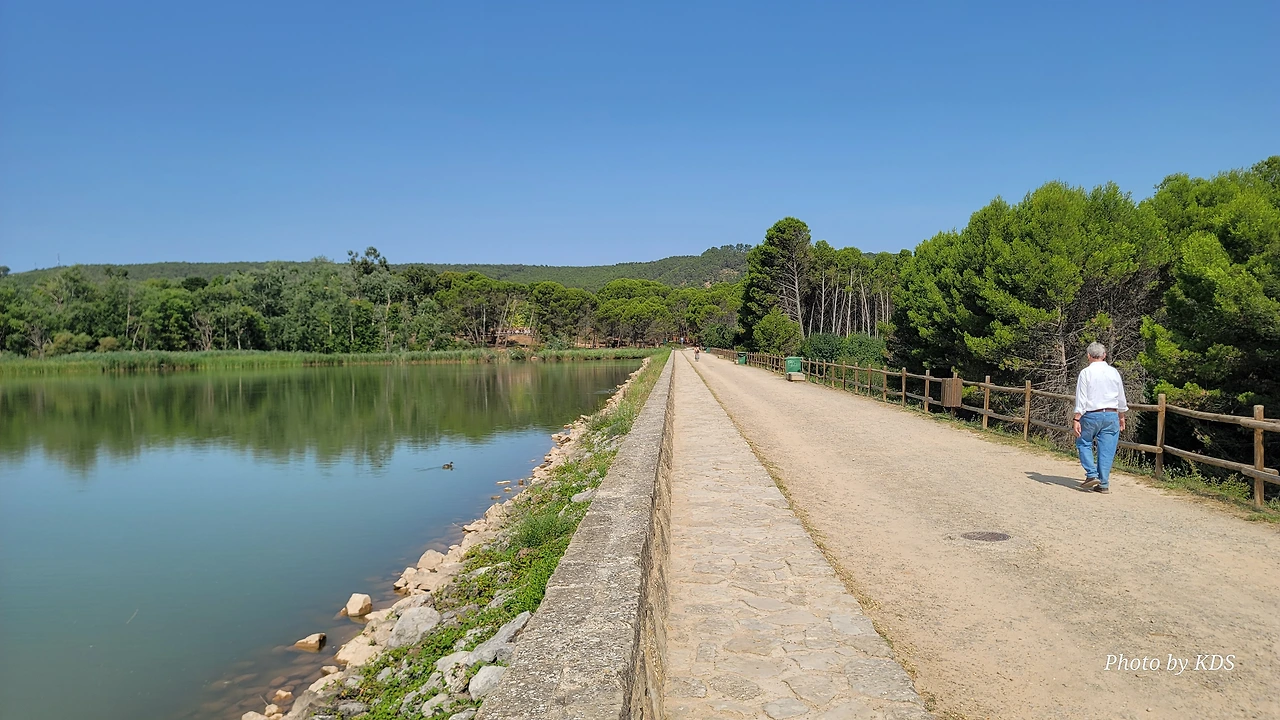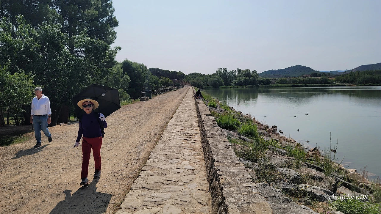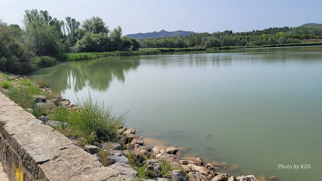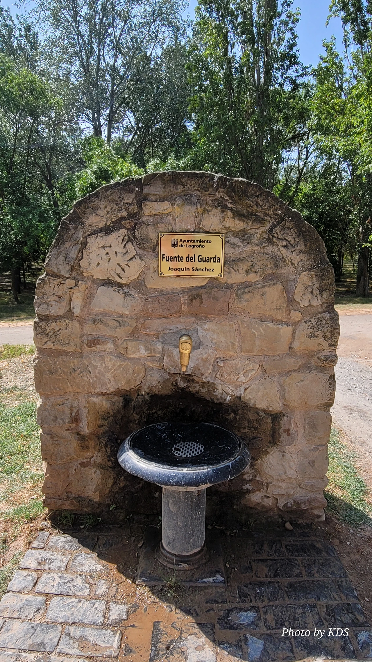 저수지가 끝나는 지점에는 조그마한 공원이 있고, 저수지 언저리를 건너게 해주는 나무다리가 설치되어 있다. 물 위에는 오리 떼들이 먹이를 찾느라 분주히 움직인다. 이곳에 음수대가 설치되어 있는데, 로그로뇨시에서 관리를 한다. 저수지가 끝나는 평지에는 높은 철탑이 보이는데 방송사 34년 경력의 조선 과객의 눈으로 보면 그것은 바로 방송 중계용 철탑이다. 그냥 철탑만 뾰족하게 서 있는 것은 보통 라디오 중계용 철탑이고, 철탑 옆에 여러 가지 기구가 붙어 있는 것은 TV 중계용 철탑이다.