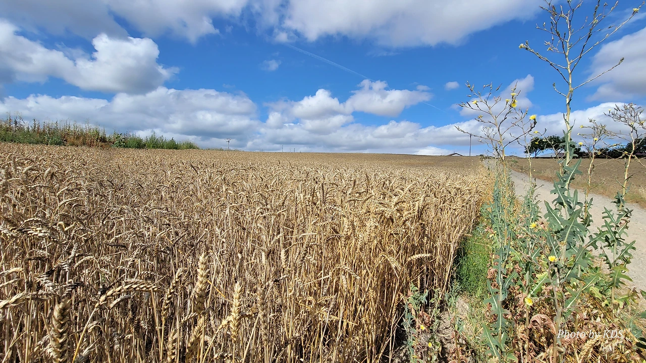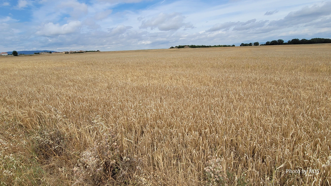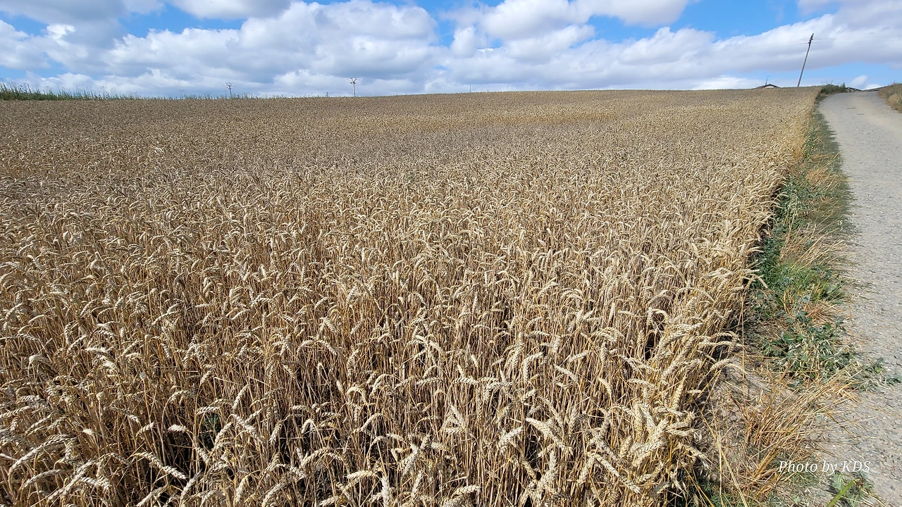 순례길을 걷다 보면 길 옆으로 밀 밭이 끝 간 데를 모르게 펼쳐져 있다. 그런데 길을 걷는 지금이 7월 말경에서 8월 초순인데도 밀의 수확을 하지 않고 있어서 밀 이삭이 꼬부라지고 건조해서 그냥 부서질 듯하다. 조선 과객이 어릴 때 시골에서 농사일을 도우며 자랐기 때문에 작물들의 경작에 대해서 약간 알고 있다. 밀과 보리는 늦가을에 파종을 하여 초겨울에 싹이 터서 그야말로 겨울에 논밭이 파랗게 물든다. 겨울이면 서리가 내리고 논밭의 흙이 서리로 인해 약간씩 들뜨기 때문에 이른 봄에 보리나 밀의 뿌리가 땅속으로 잘 안착하지 않을 수도 있다. 그래서 이른 봄에 보리싹이나 밀싹이 땅에 잘 착근하도록 보리밟기를 한다. 그리고 봄에 잘 자란 보리나 밀은 모내기를 하기 전인 5~6월 경에 수확을 하게 된다. 그리고 이모작으로 논에는 벼를 심어서 쌀을 생산하고, 밭에는 다른 작물을 심어서 가을에 추수를 하게 되는 것이다. 그런데 여기 밀들은 8월이 되었는데도 수확을 하지 않고 있다. 일손이 부족해서 그런지, 아니면 아예 밭에서 밀을 세워둔 채 바짝 건조한 뒤에 수확을 하기 위한 것인지는 모르겠다. 밭에 농부가 한 사람도 없어서 궁금해도 물어볼 수도 없는 노릇이다. 그렇다고 농기계가 움직이면서 수확하는 모습도 보이지 않는다.