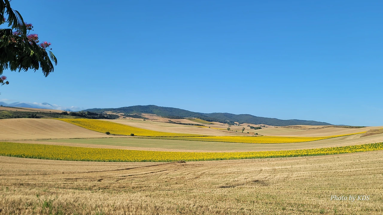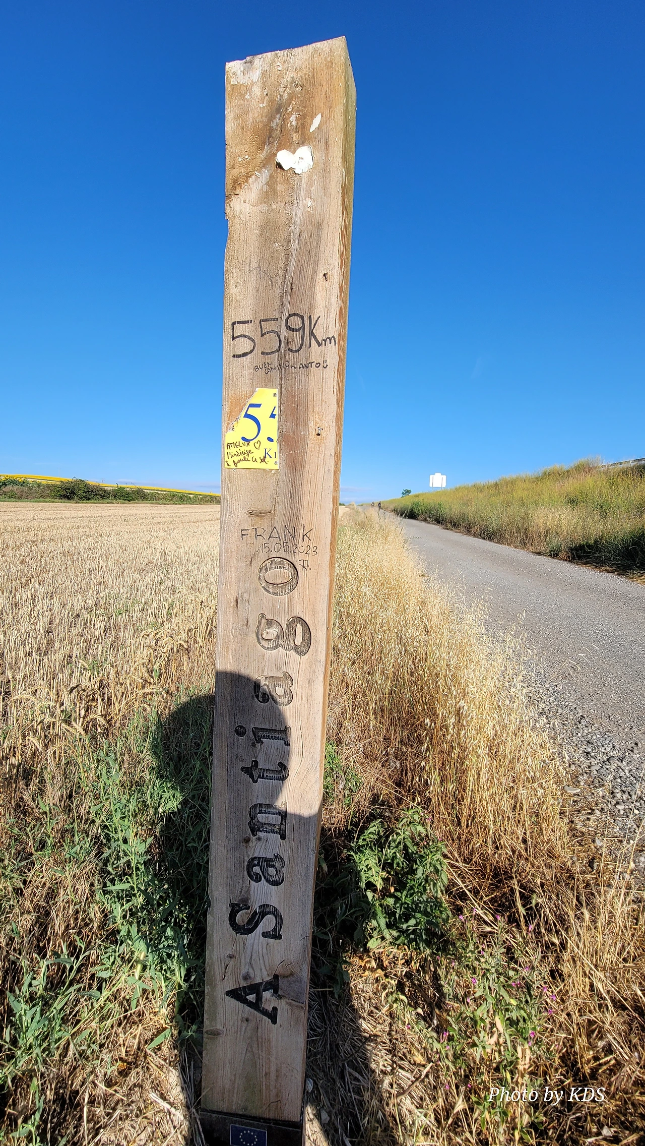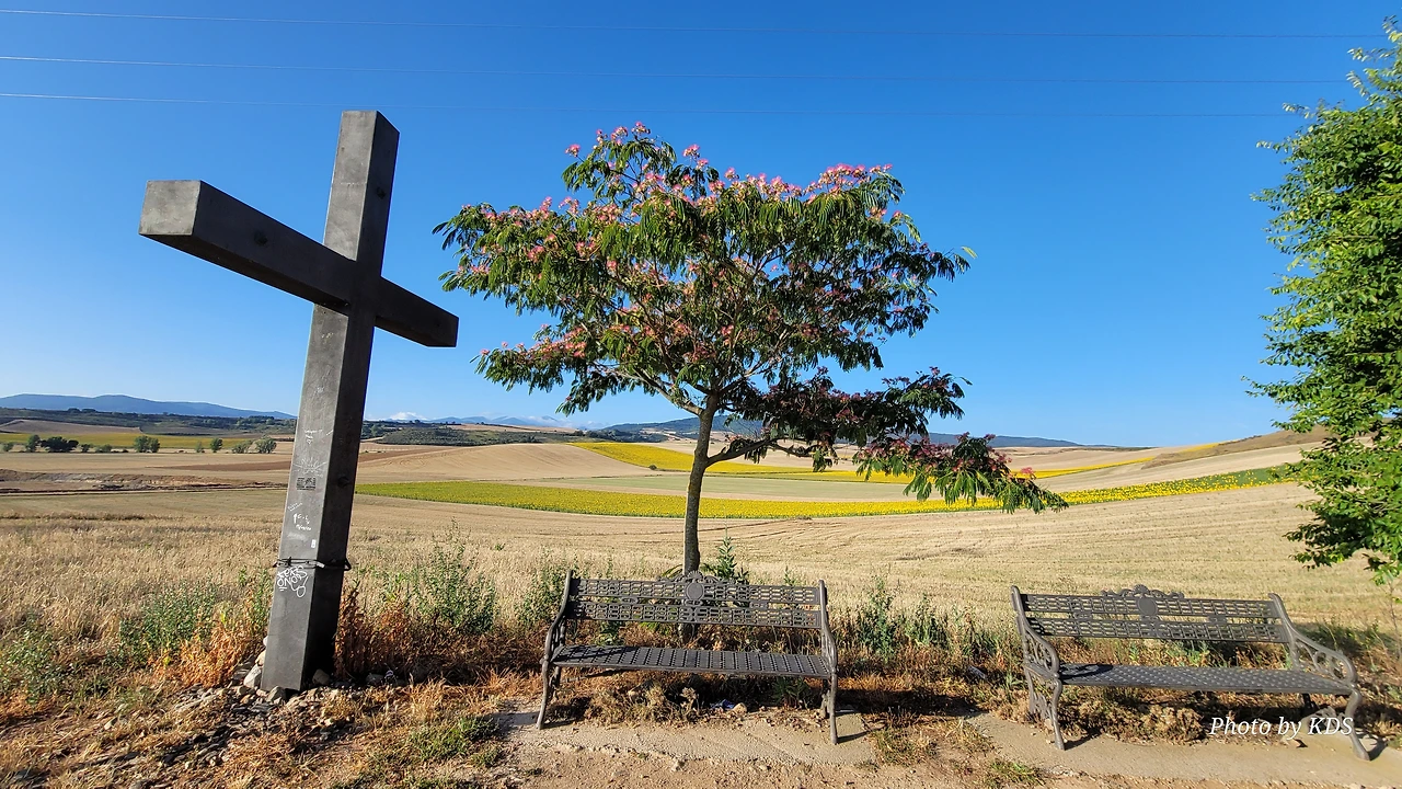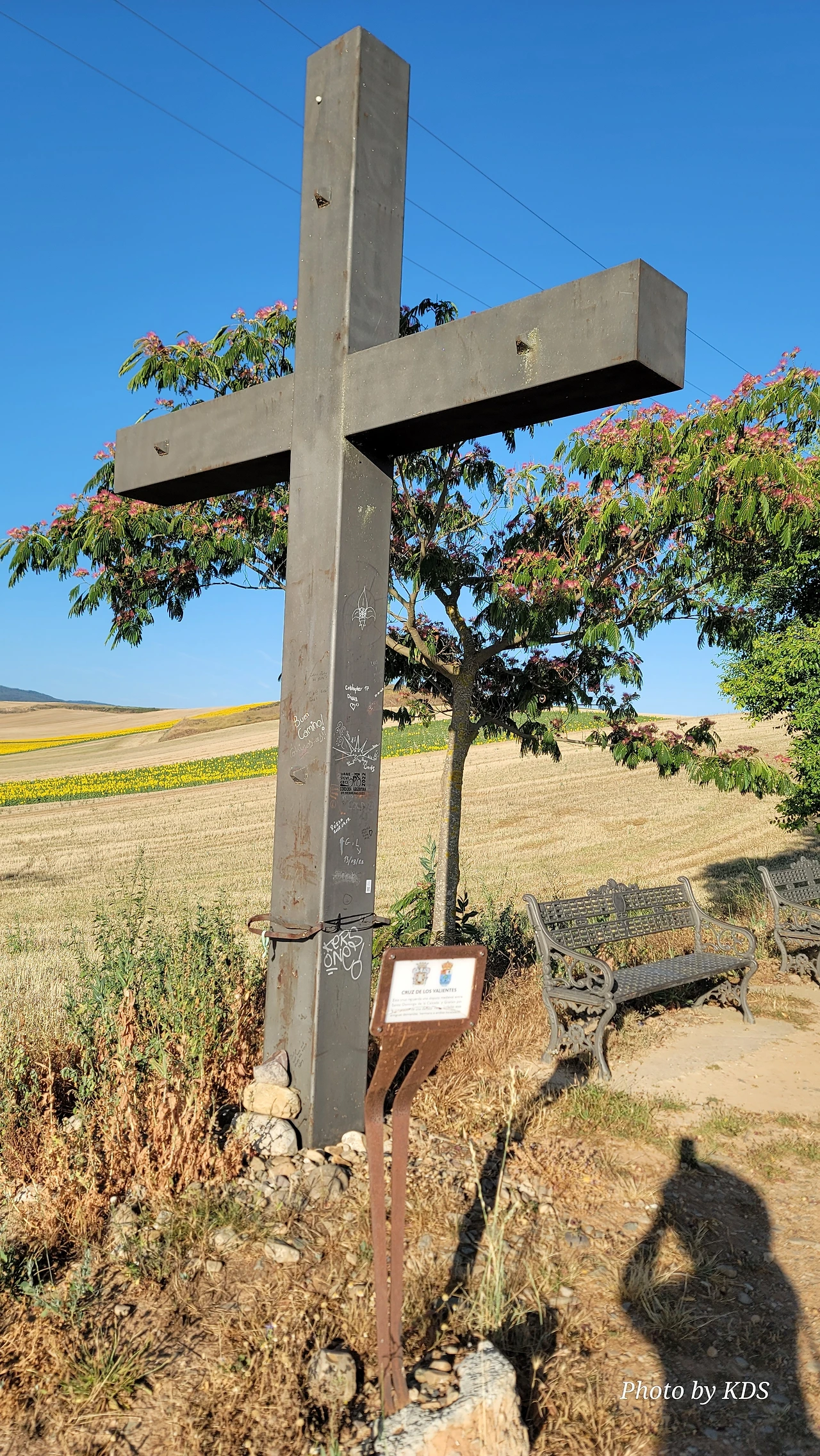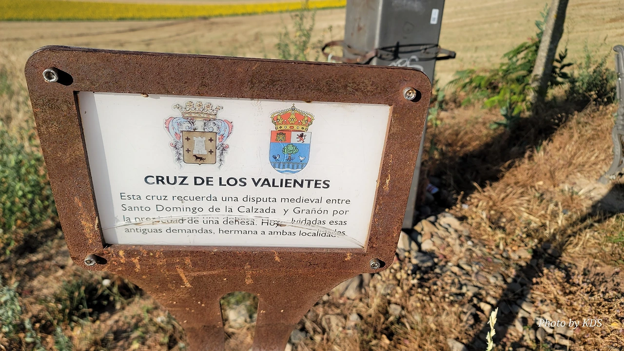 10여 일간의 강행군이 서서히 몸의 피로로 누적되었는지 오늘 아침에는 평소보다 늦게 일어났다. 거의 매일 새벽 5시에 기상하여 준비한 후 6시 정도는 순례길을 출발했는데, 오늘은 평소보다 한참 늦었다. 산토 도밍고 데 라 깔사다(Santo Domingo de la Calzada)에서 07:50에 알베르게를 출발했다. 일찍부터 서두는 부지런한 순례객들이 다 떠나고 난 다음이다. 오늘은 늦게 출발했으니 평소보다 짧게 걸을 예정이다. 해는 벌써 높이 떠올라 있고, 순례길은 평소보다 약간 더운 상태이다. 알베르게를 나와서 마을을 벗어나니 해바라기 밭들이 쭉 이어져 있다. 한참을 걸어가니 약간 언덕으로 길이 이어져 있고, 언덕 중간쯤에 아주 투박한 십자가 하나가 외롭게 서 있다. 십자가 옆에는 자귀꽃이 만발한 자귀나무 한 그루가 서 있다. 십자가 옆에 안내 표지판이 있기에 구글 번역기로 읽어보니 대충 "용맹한 자의 십자가"라고 쓰여 있었다. 밑에 설명에는 '이 십자가는 목초지를 둘러싼 산토 도밍고 데 라 깔사다와 그라뇽 사이에 일어난 중세 시대의 분쟁을 기억한다고 적혀 있다.