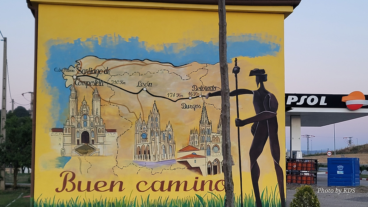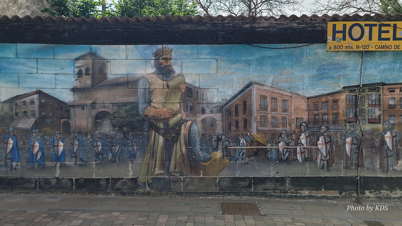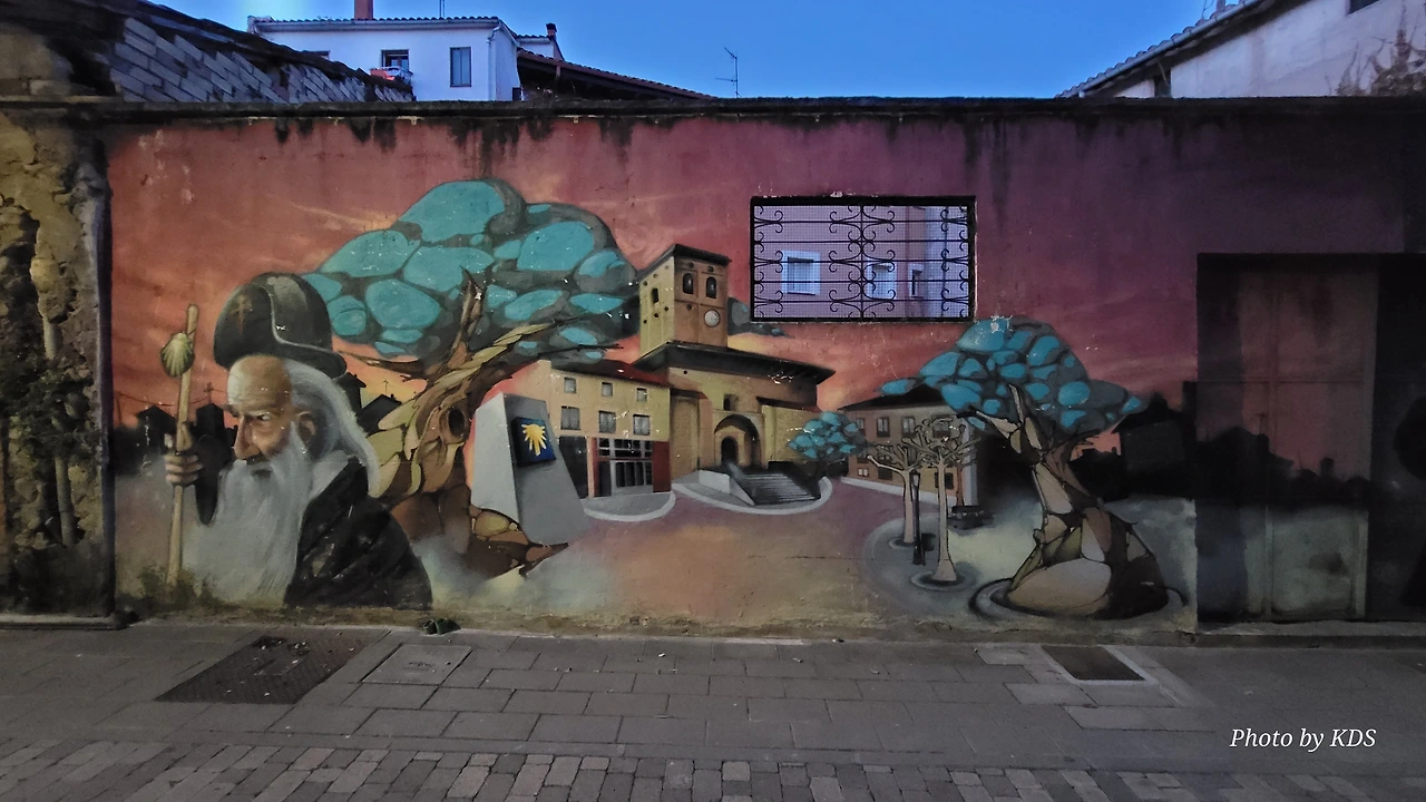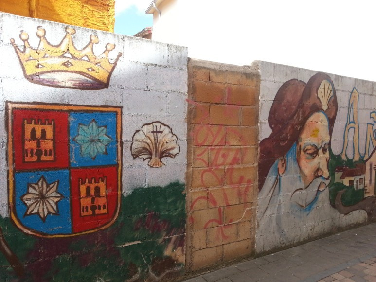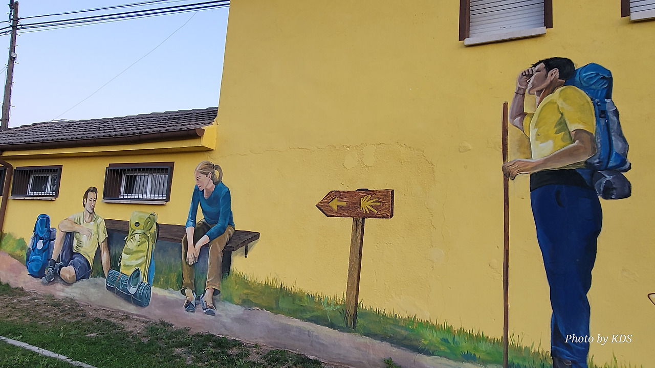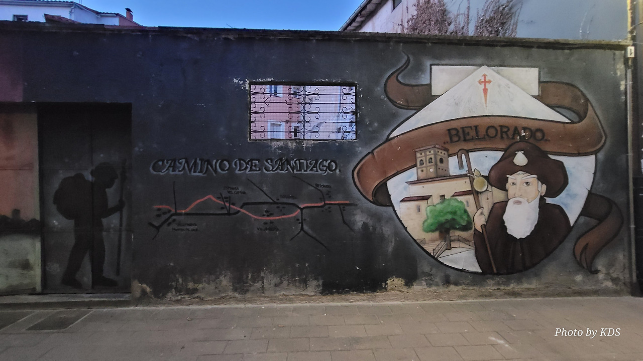 이곳 벨로라도에도 마을 건물의 벽이나 담장에 아주 규모가 큰 벽화를 장식해 놓아서 심신이 피곤한 순례객들의 눈을 즐겁게 해 주고 있었다. 조개껍질을 매 단 젊은 순례객의 모습도 있고, 건물의 창문 등을 활용한 노부부의 일상을 묘사한 그림도 보인다. 스페인 역사의 한 페이지가 될 수 있는 알폰소 7세가 무어인들을 정복하고 스페인의 영토를 탈환하는 전쟁을 승리한 모습도 보인다. 늙은 수도승이 순례길을 걷는 모습도 보인다. 다양한 벽화를 통해 그들의 생활상을 잠깐씩 엿볼 수 있다.