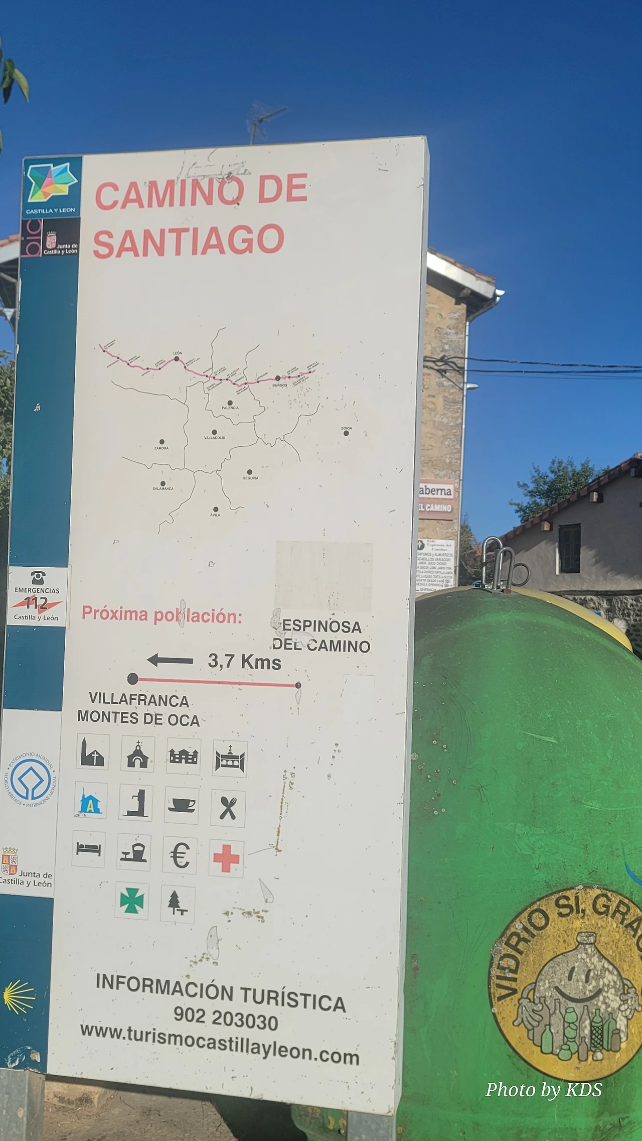 순례길은 초라하고 조그만 비얌비스따(Villambistia) 마을의 음수대를 지나 에스삐노사 델 까미노(Espinosa del Camino) 마을로 이어진다. 약 1Km 정도 지나고 공원을 오른쪽으로 끼고 고속도로를 건너가다 보면 왼쪽으로 마을이 보는데, 에스삐노사 델 까미노 마을이다. 특별히 내세울만한 유적은 보이지 않고, 전원풍의 오래된 목조건물들이 특색을 이루는 마을이다. 보기에 은퇴한 스페인 노인들이 여생을 보내기에 적합해 보이는 평화로운 모습이다. 마을의 출구는 성모승천 성당을 오른쪽으로 두고 이어져있으며, 왼쪽으로 바르셀로나의 은퇴한 사업가가 운영한다는 사설 알베르게가 있었다. 그래서 이 조그만 마을에 알베르게가 무려 3개나 있었다.