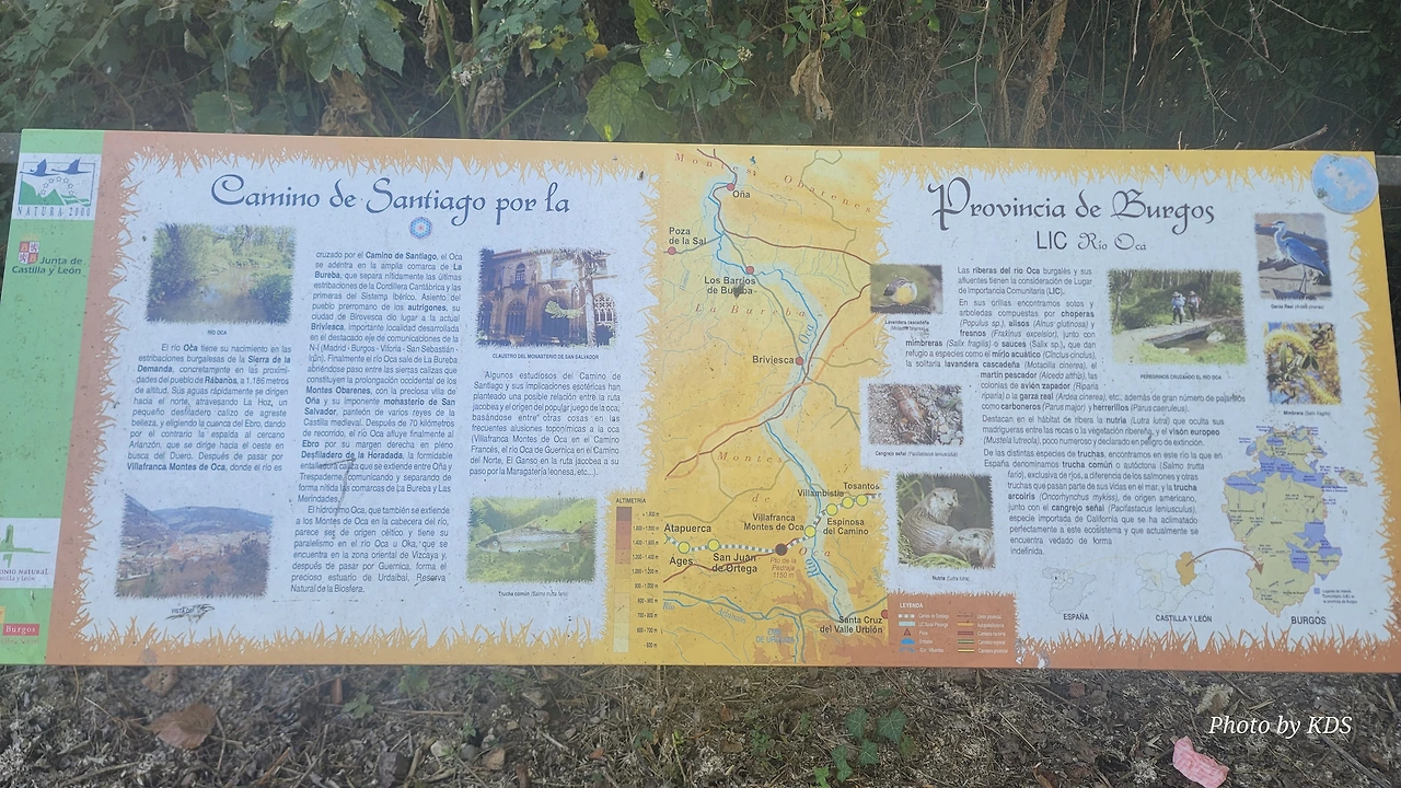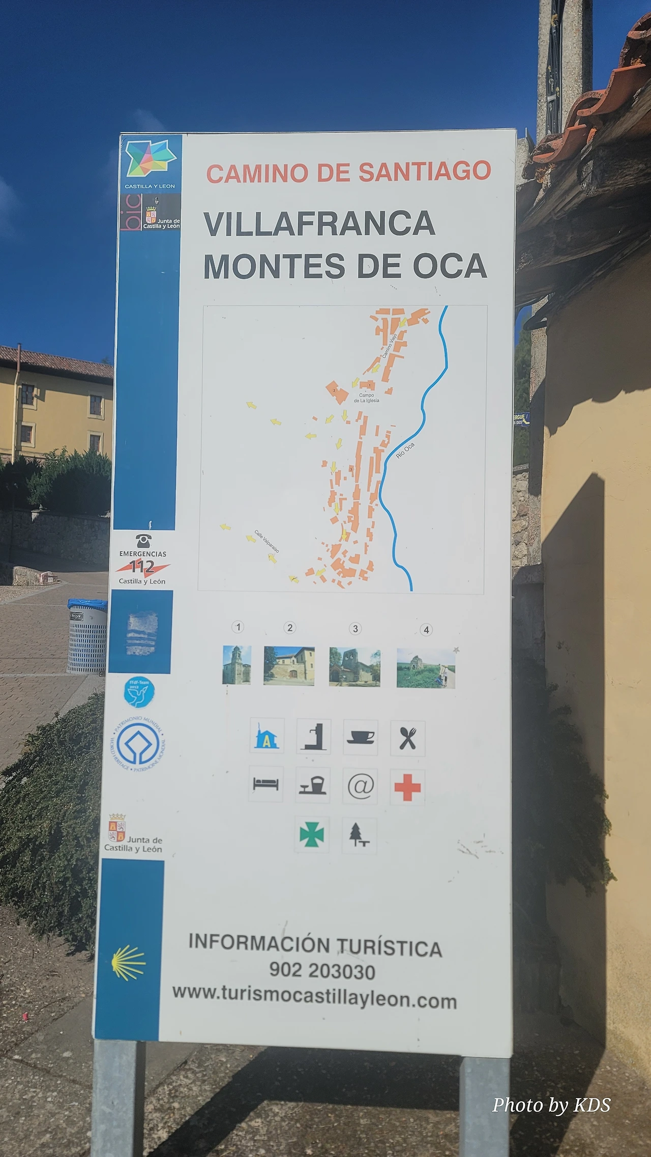 오늘 아침 출발한 벨로라도(Belorado)에서 12km 정도 걸어서 당도한 마을이 비야프랑카 몬테스 데 오카(Villafranca Montes de Oca) 마을이다. 이 마을은 로마시대 때부터 있었고, 그 당시에는 아우까라고 불리었단다. 과거부터 주교가 거주했던 주요한 도시였다고 한다. 산또 도밍고 데 라 깔사다(Santo Domigo de la Calzada)와 부르고스(Burgos)의 중간인 이 마을에는 신비로운 전설과 많은 전통이 남아 있다고 한다. 이 마을에서부터 오카산(Montes de Oca)을 오르게 되는데, 순례길은 1,162m의 발부에나 언덕(Alto de Valbuena) 정상을 넘어야 한다. 옛날에는 이 산에 산적들이 많아서 순례객들의 생명과 재산을 노리는 경우가 많았다고 한다. 전설에 따르면 이곳에서 한 순례자가 도둑에게 가지고 있던 돈을 모두 빼앗기고 죽임을 당했다고 한다. 슬픔에 잠긴 순례자의 부모가 간절하게 성 야고보에게 기도를 올리자 다시 살아났다고 한다. 실제로 도메니꼬 라피라는 이름의 순례자는 이곳 오까 산의 숲에서 길을 잃어 오랫동안 빠져나올 수 없었는데, 숲에서 나는 버섯을 따먹으면서 간신히 살아남았다고 한다.