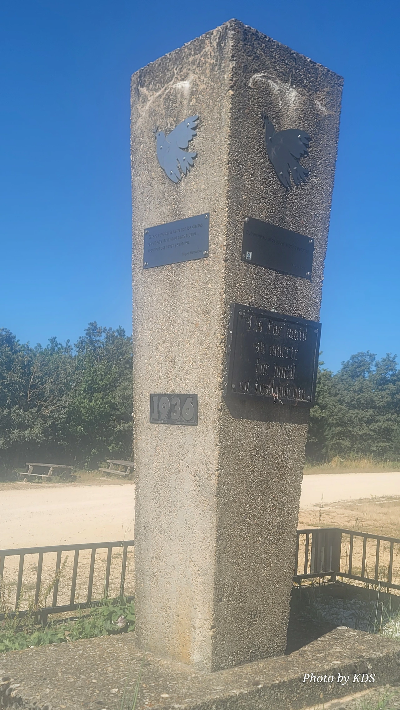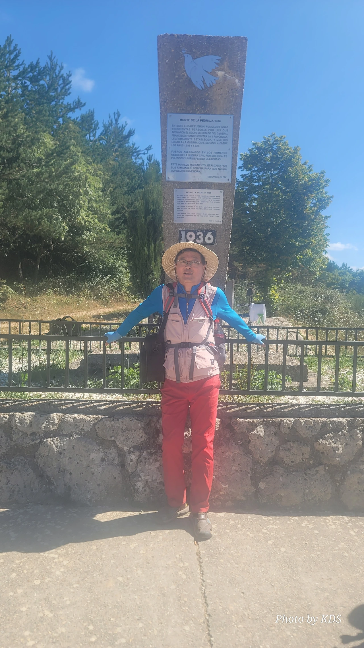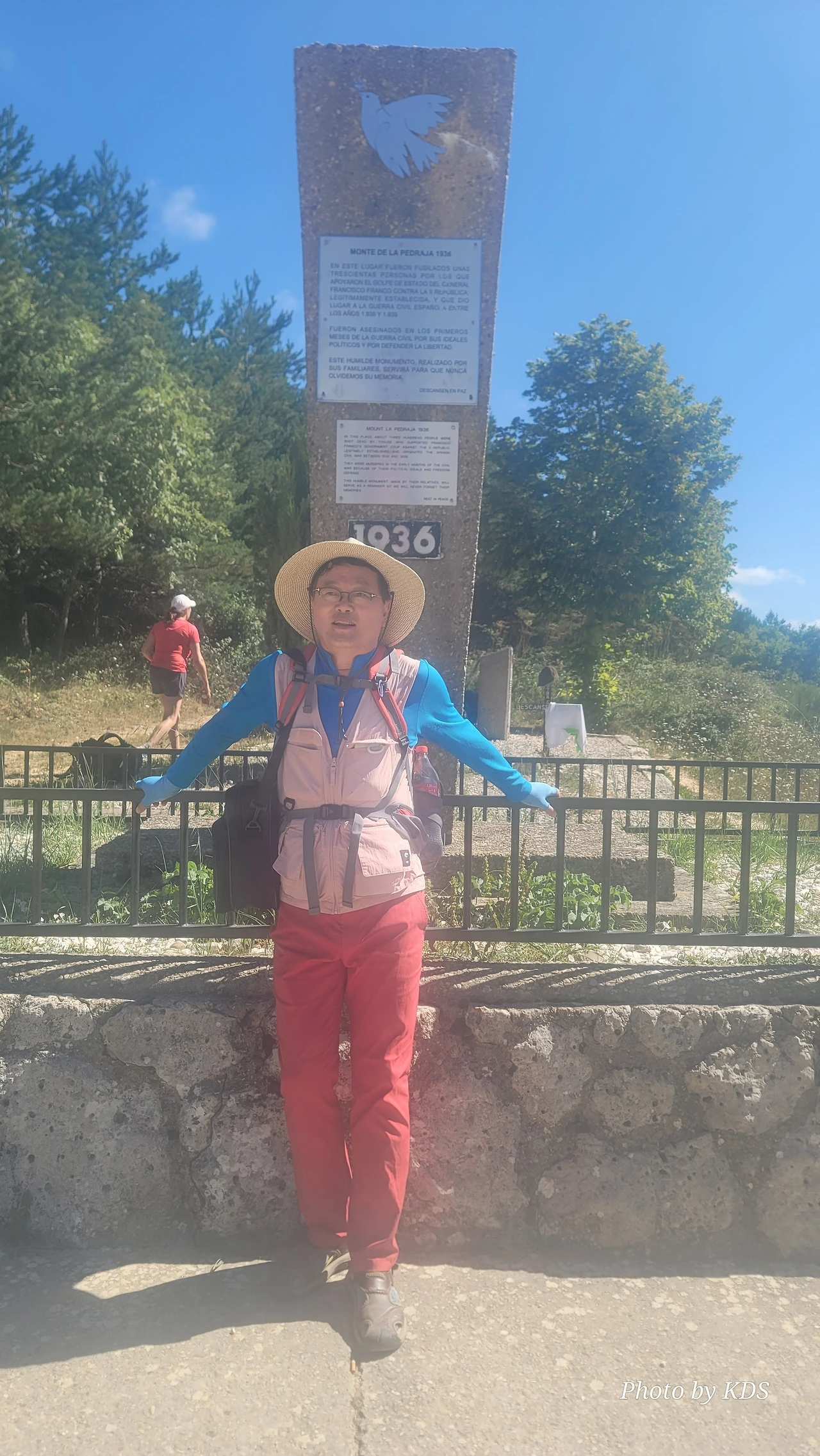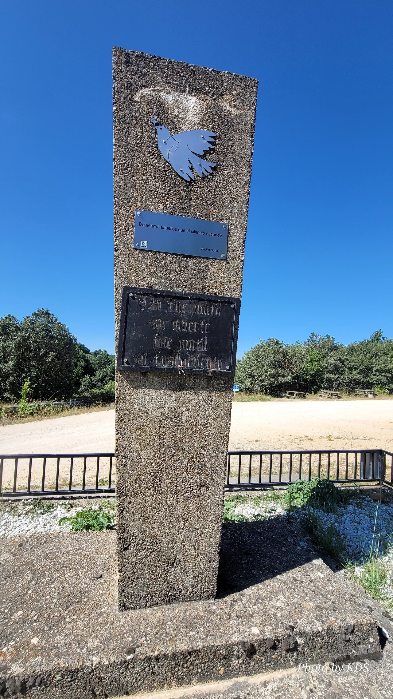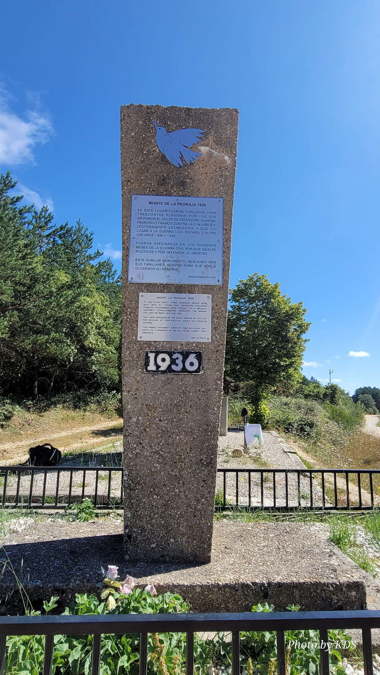 비야프랑카 몬테스 데 오카(Villafranca Motes de Oca) 마을도 지나 언덕길을 점차 오르다 보면 기념비가 하나 있다. 안내판에는 이 기념비는 1936년 스페인 내전의 초기 몇 달에 총살을 당한 300명의 가족들이 이것을 잊지 않기 위해 설치했다고 되어 있다. 당시 프란시스코 프랑코가 1936년 7월에 모로코인 용병을 포함한 자신의 직속 군대를 이끌고 공산주의 정부인 인민전선 정부에 반대해 군사 쿠데타를 일으키니 이것이 바로 스페인 내전이다. 이 내전이 1939년까지 이어졌으나 그가 마드리드를 함락시키고 승리하여 그 후 38년간 스페인을 독재체제로 통치하게 된 것이다. 한 마리의 비둘기가 평화의 상징으로 나뭇잎을 물고 하늘로 날아오르는 조형물이 인상적이었다. 독재에 대항하여 싸우는 연약한 민중의 모습을 보는 것 같아서 가슴이 아련해왔다.