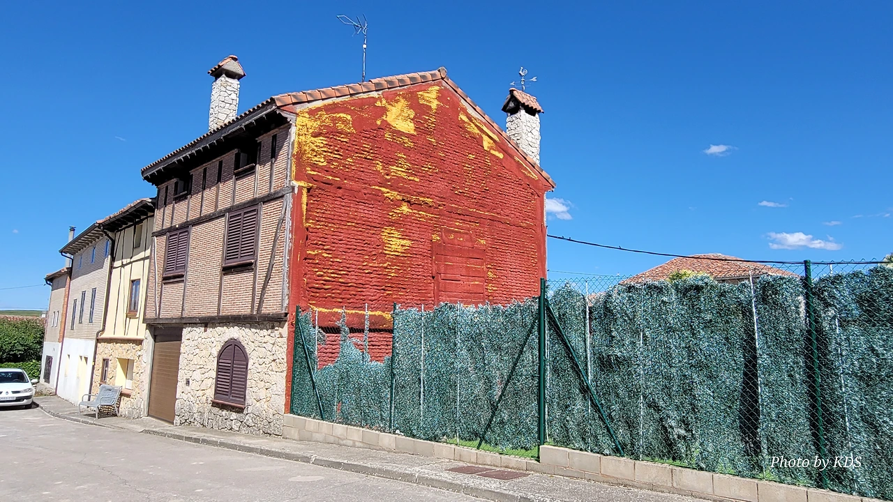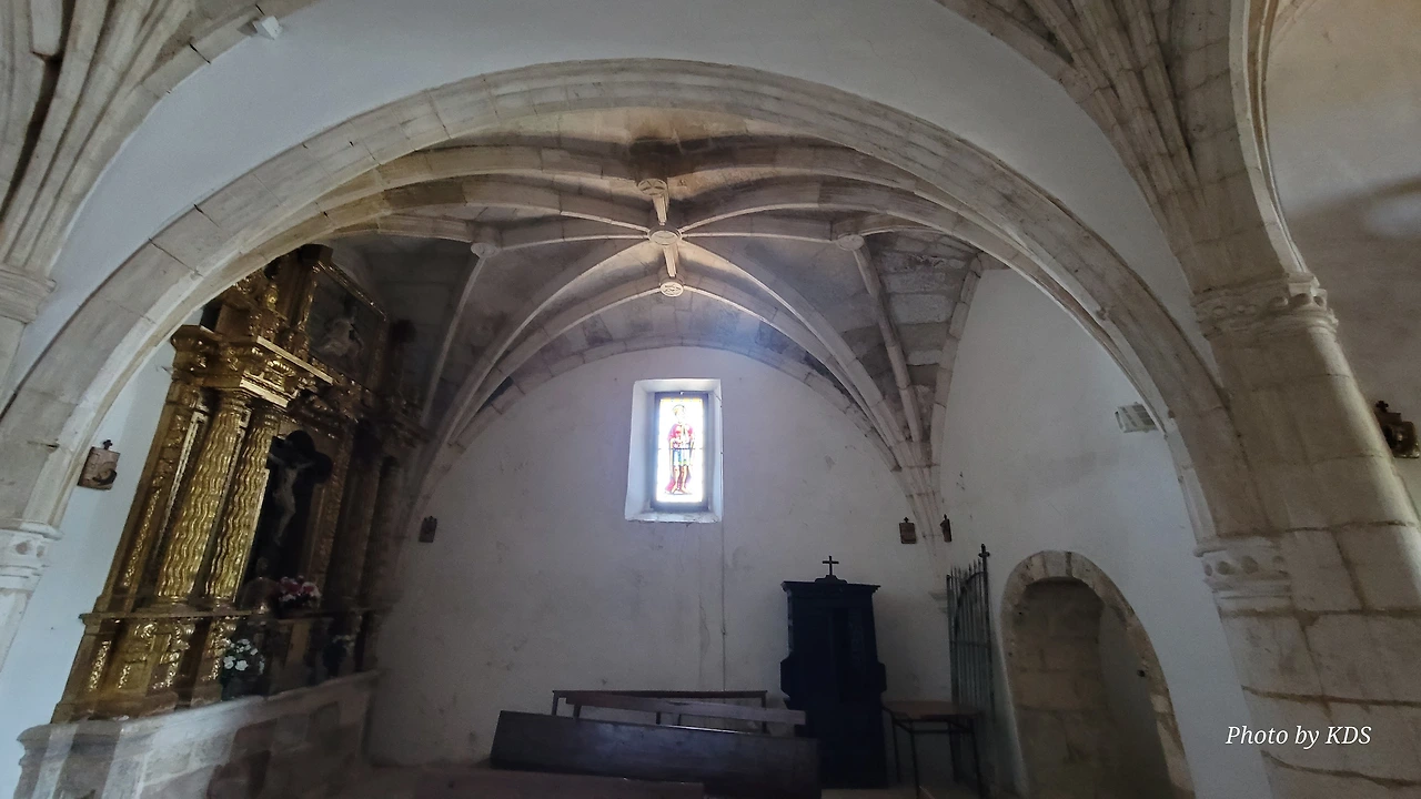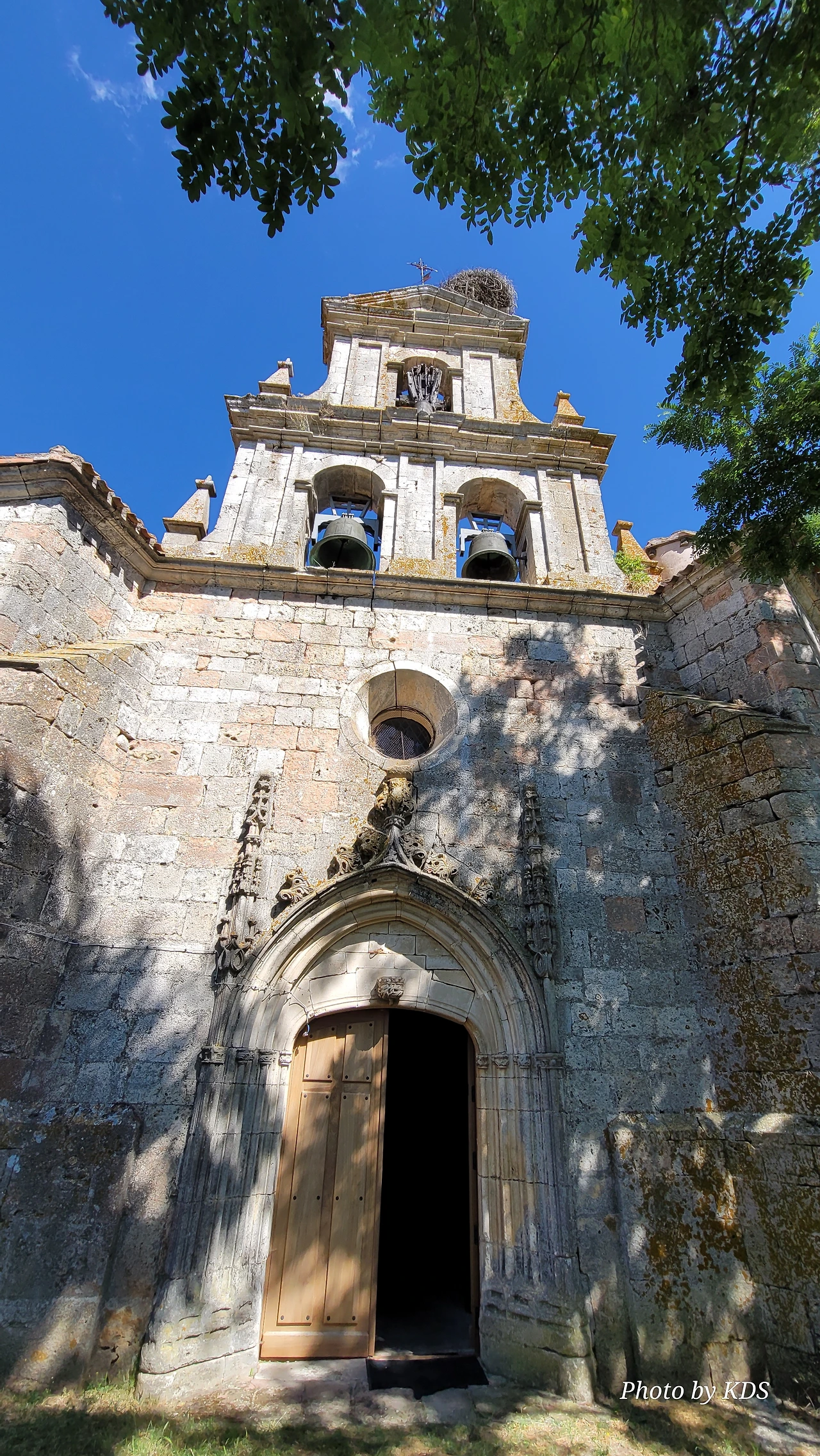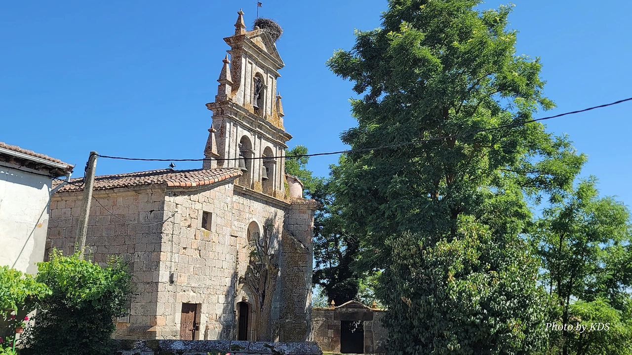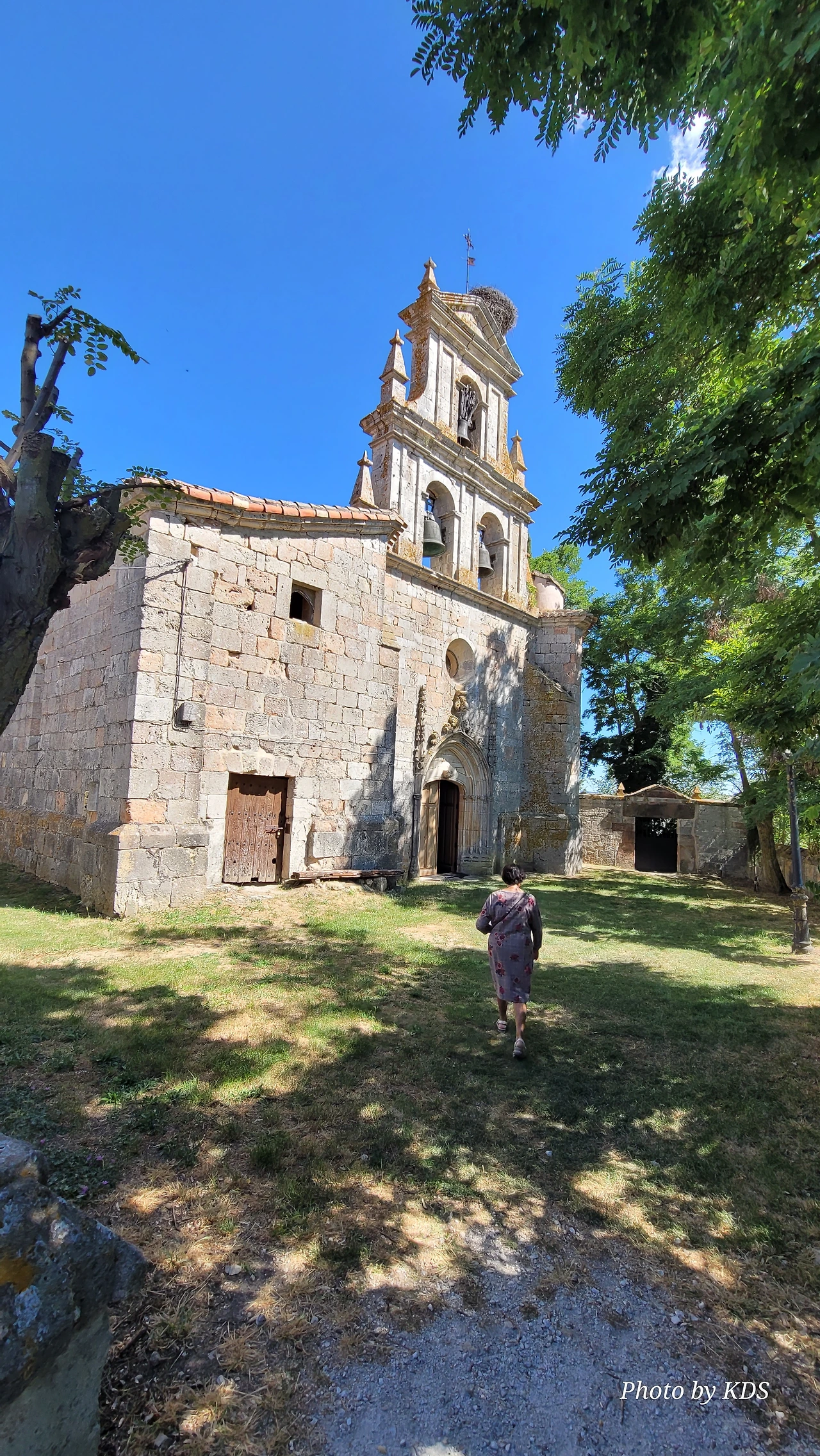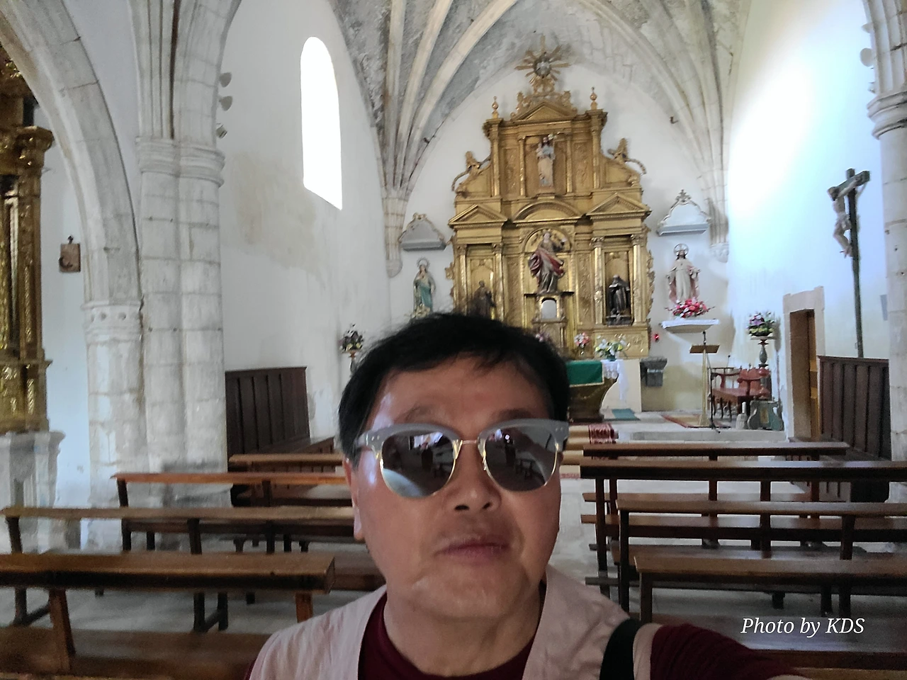 이 성당에 갔더니 이 마을의 할머니 한 분이 성당을 지키고 계셨다. 할머니는 영어를 못하고, 조선 과객 금삿갓은 스페인어를 모르니 의사소통이 제대로 될 리가 없다. 할머니는 할머니 대로 열심히 설명하는데 한 귀로 듣고 흘릴 수밖에 없어서 약간 미안했다. 하지만 기부금 모금 바구니를 들고는 기부금을 좀 내라는 대목은 둘 다 명확히 알 수 있었다. 약간의 기부금을 내고, 성당 내부의 사진도 찍고 할머니랑 같이 앉아서 사진을 찍었다. 성당의 종탑 위에는 새들이 보금자리를 만들어 놓은 게 보였다. 순례길의 높은 건축물에는 저렇게 새집을 지어 놓은 곳이 많았다.