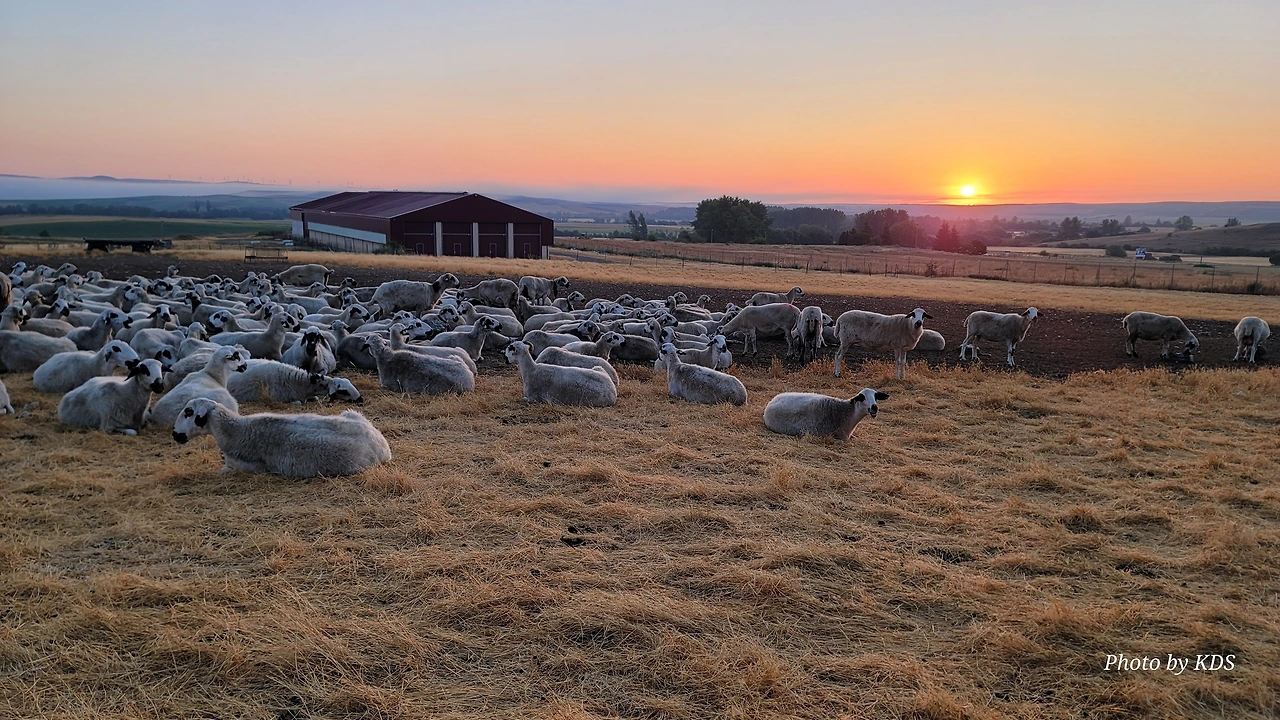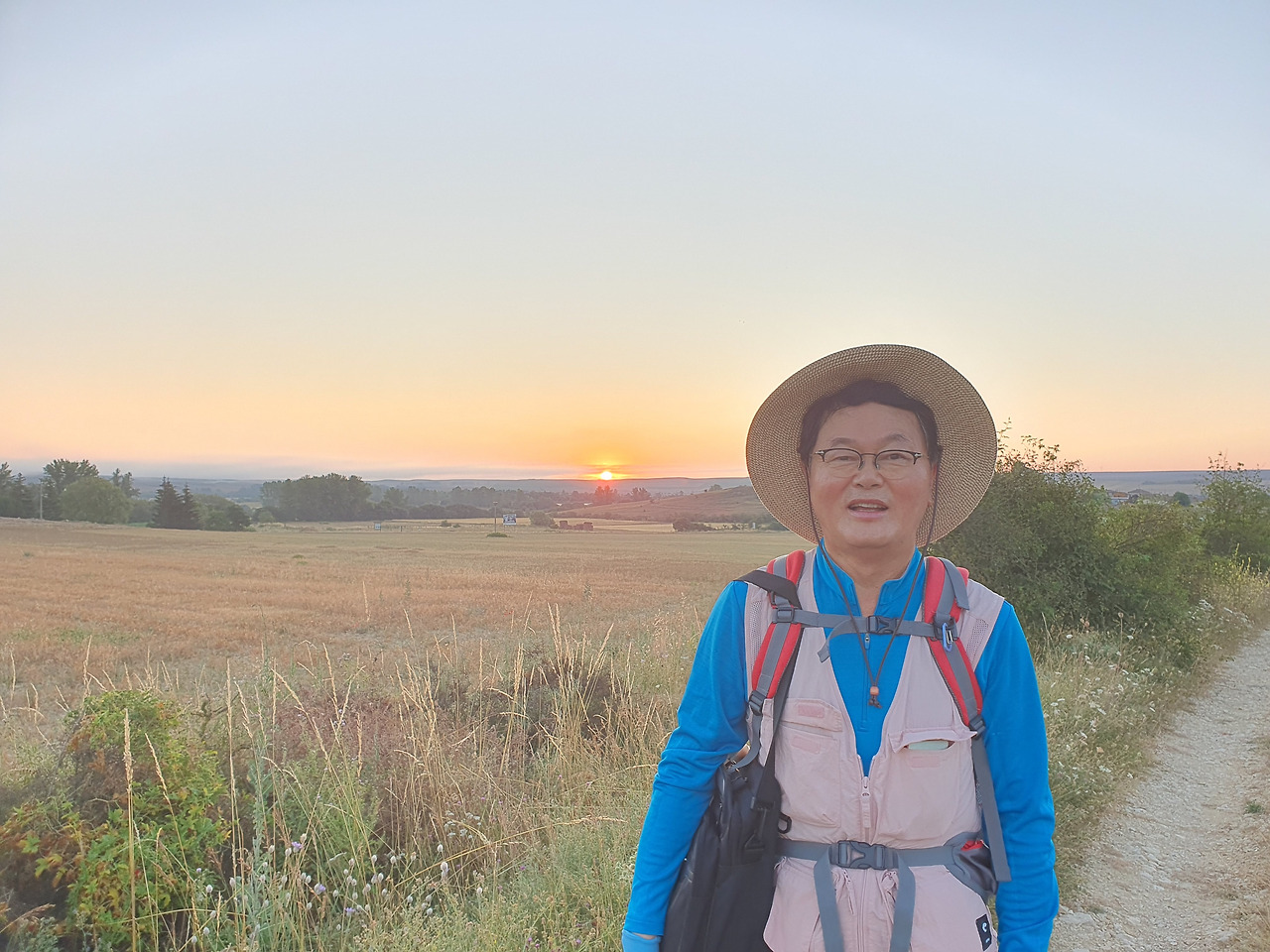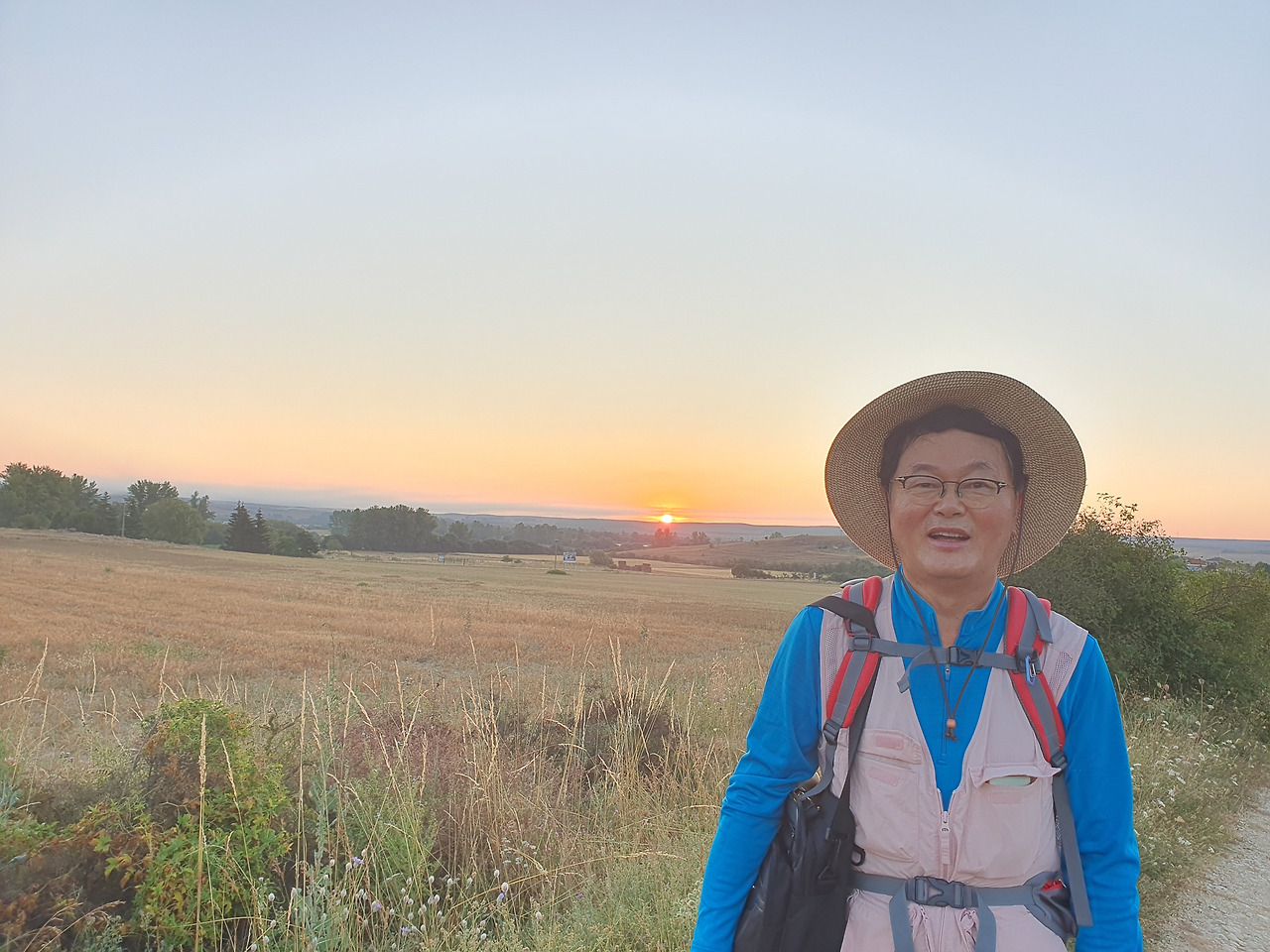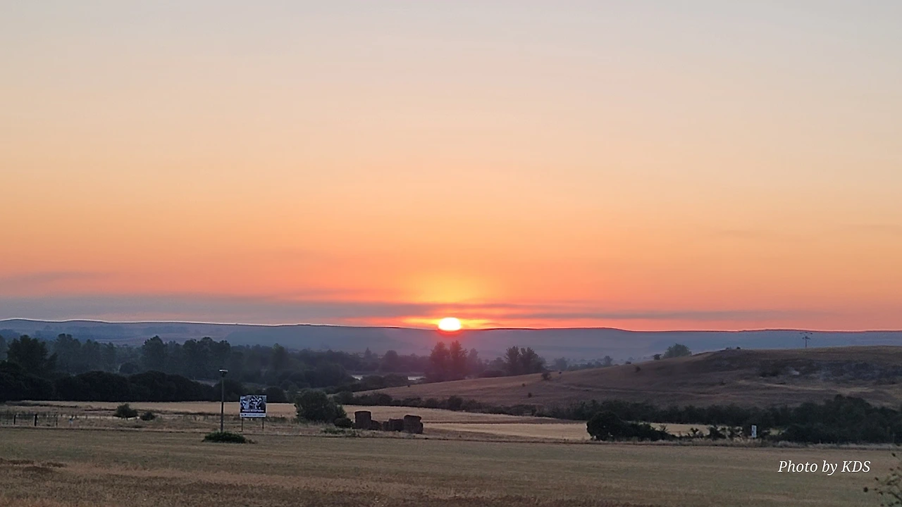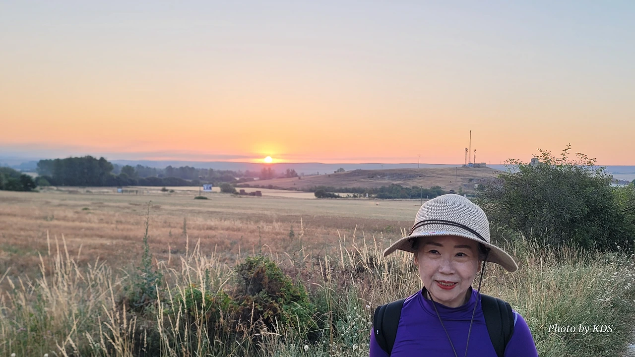 아따뿌에르까(Atapuerca) 마을을 지나면 순례길은 점점 고도를 올려서 해발 1,078m의 마따그란데(Matagrande)언덕을 넘게 된다. 그리 높은 언덕도 아니고 경사가 급한 길도 아니지만 주먹만 한 돌들이 길에 널려 있거나 박혀 있는 돌길이라서 순례객들의 발바닥을 마구 괴롭힌다. 아헤스(Ages)에서 마을을 빠져나오면서 길가에 만나는 양 떼들을 키우는 목장을 지나간다. 일찍 출발해서 그런지 목장에 방목되고 있는 양 떼들이 아직 새벽잠을 덜 깬 상태였다. 모두들 풀밭에 주저앉아 있거나 누워서 꾸벅꾸벅 졸고 있었다. 부지런한 한 두 마리만 자리에서 일어나 고개를 쳐들고 있었다. 언덕에서 내려다 보이는 저 멀리 평원에는 이제 아침해가 붉게 솟아오르고 있었다. 약간의 구름으로 태양의 둘레에 약간의 붉은 고리 같은 모양이 만들어져서 장관을 이룬다. 부르고스(Burgos) 쪽인 서쪽 방향으로는 낮은 지역에 안개인지 운무(雲霧)인지 솜이불을 깔아 놓은 것처럼 희게 펼쳐져 있다.