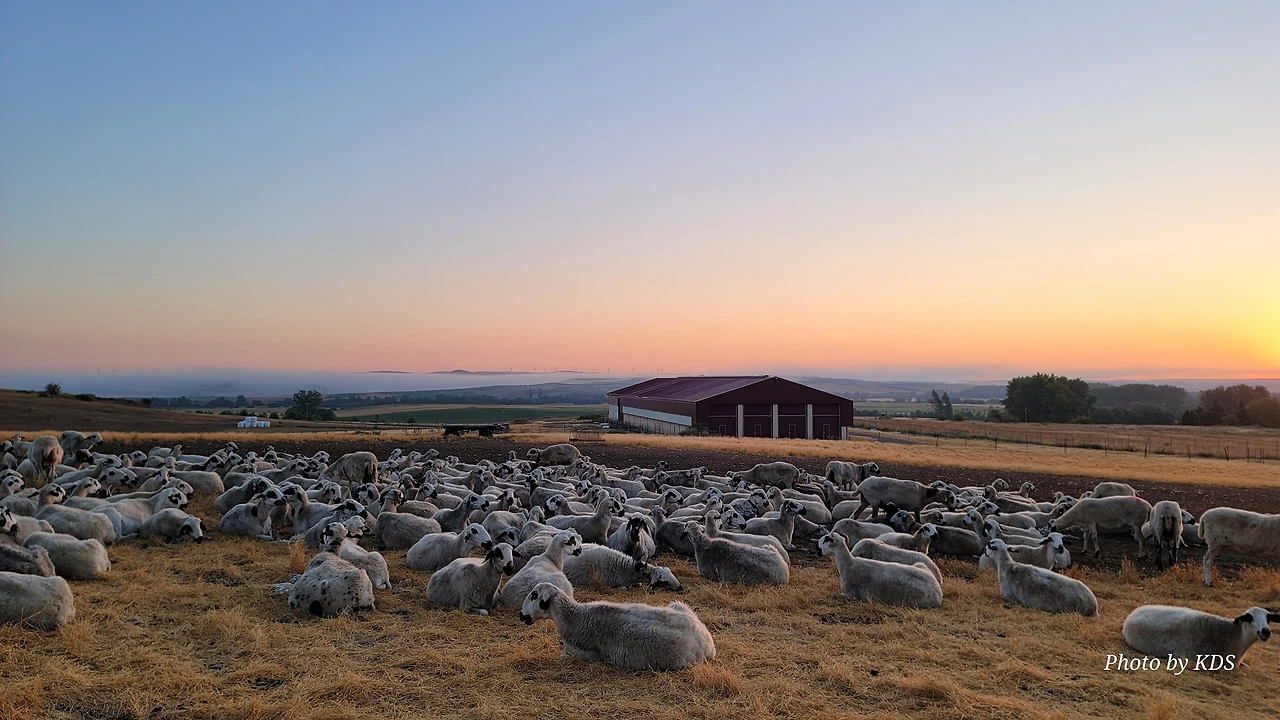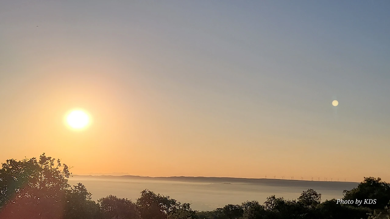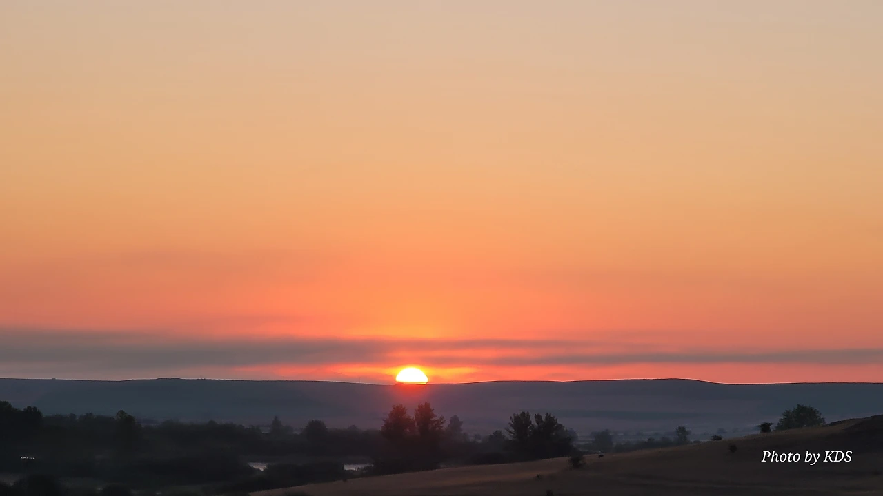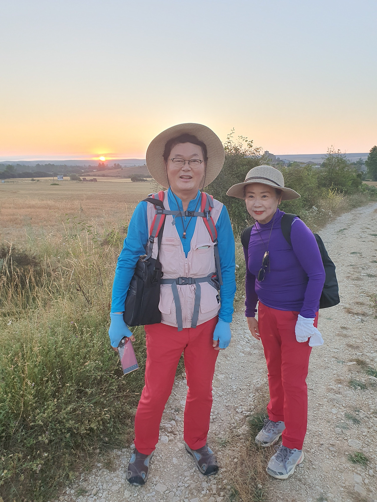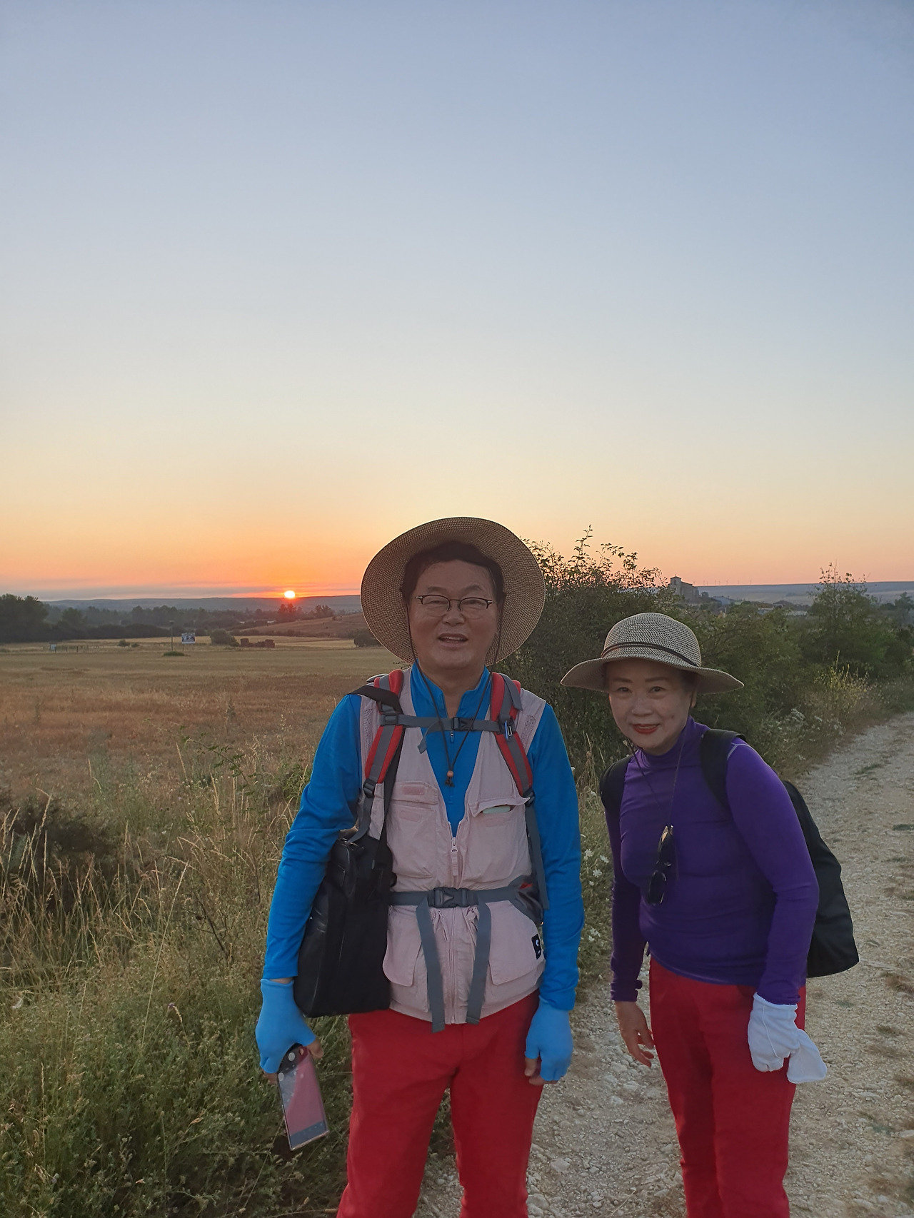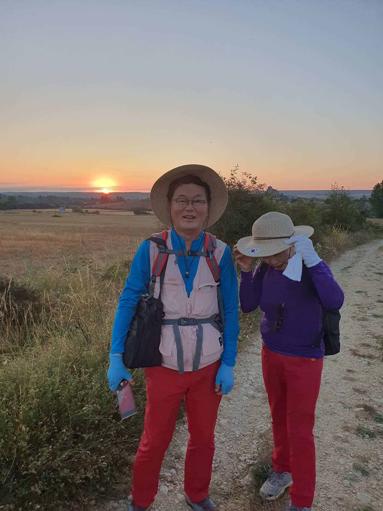 아따뿌에르까(Atapuerca) 마을을 지나면 순례길은 점점 고도를 올려서 해발 1,078m의 마따그란데(Matagrande)언덕을 넘게 된다. 그리 높은 언덕도 아니고 경사가 급한 길도 아니지만 주먹만 한 돌들이 길에 널려 있거나 박혀 있는 돌길이라서 순례객들의 발바닥을 마구 괴롭힌다. 아헤스(Ages)에서 마을을 빠져나오면서 길가에 만나는 양 떼들을 키우는 목장을 지나간다. 일찍 출발해서 그런지 목장에 방목되고 있는 양 떼들이 아직 새벽잠을 덜 깬 상태였다. 모두들 풀밭에 주저앉아 있거나 누워서 꾸벅꾸벅 졸고 있었다. 부지런한 한 두 마리만 자리에서 일어나 고개를 쳐들고 있었다. 언덕에서 내려다 보이는 저 멀리 평원에는 이제 아침해가 붉게 솟아오르고 있었다. 약간의 구름으로 태양의 둘레에 약간의 붉은 고리 같은 모양이 만들어져서 장관을 이룬다. 부르고스(Burgos) 쪽인 서쪽 방향으로는 낮은 지역에 안개인지 운무(雲霧)인지 솜이불을 깔아 놓은 것처럼 희게 펼쳐져 있다.