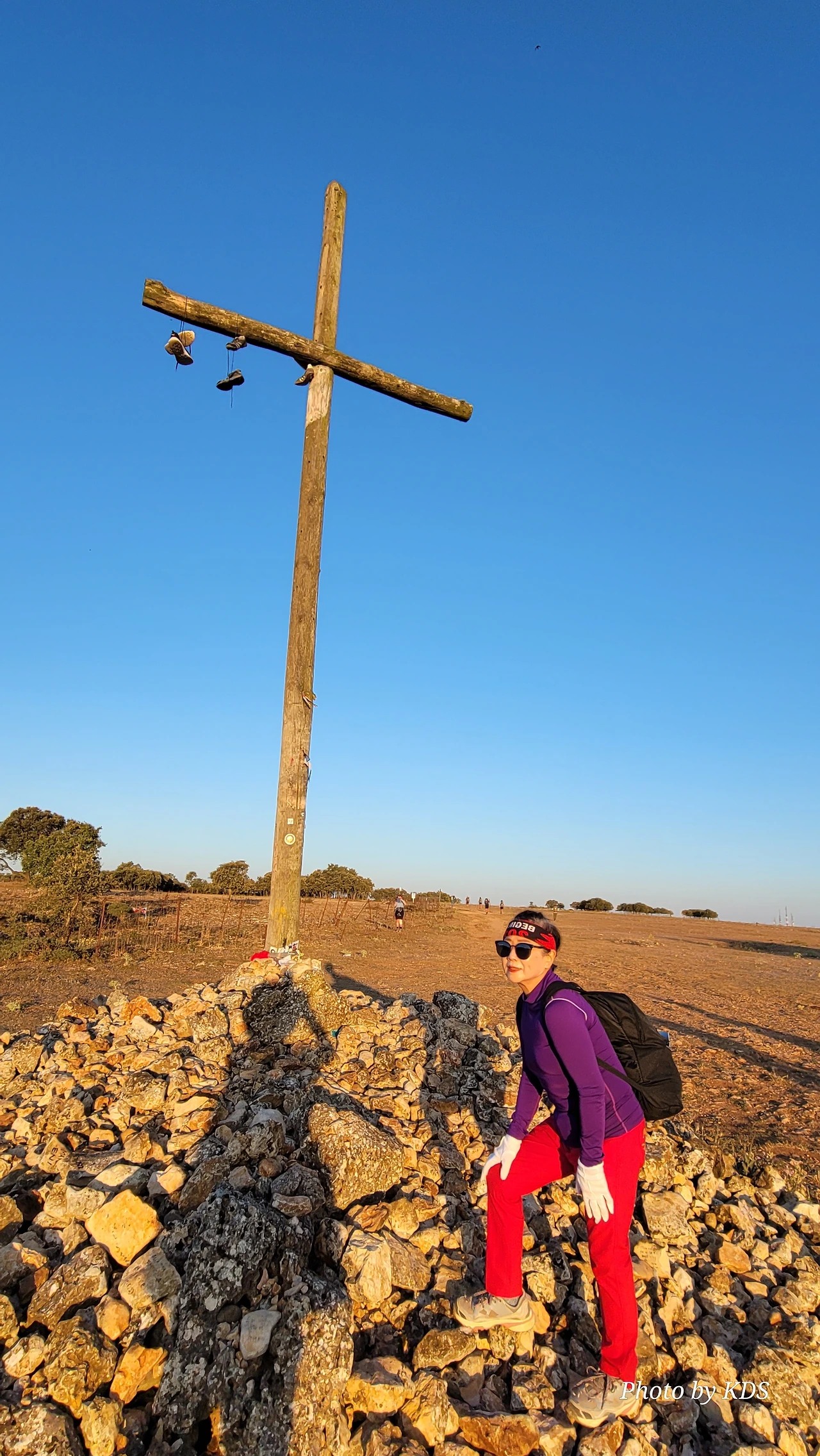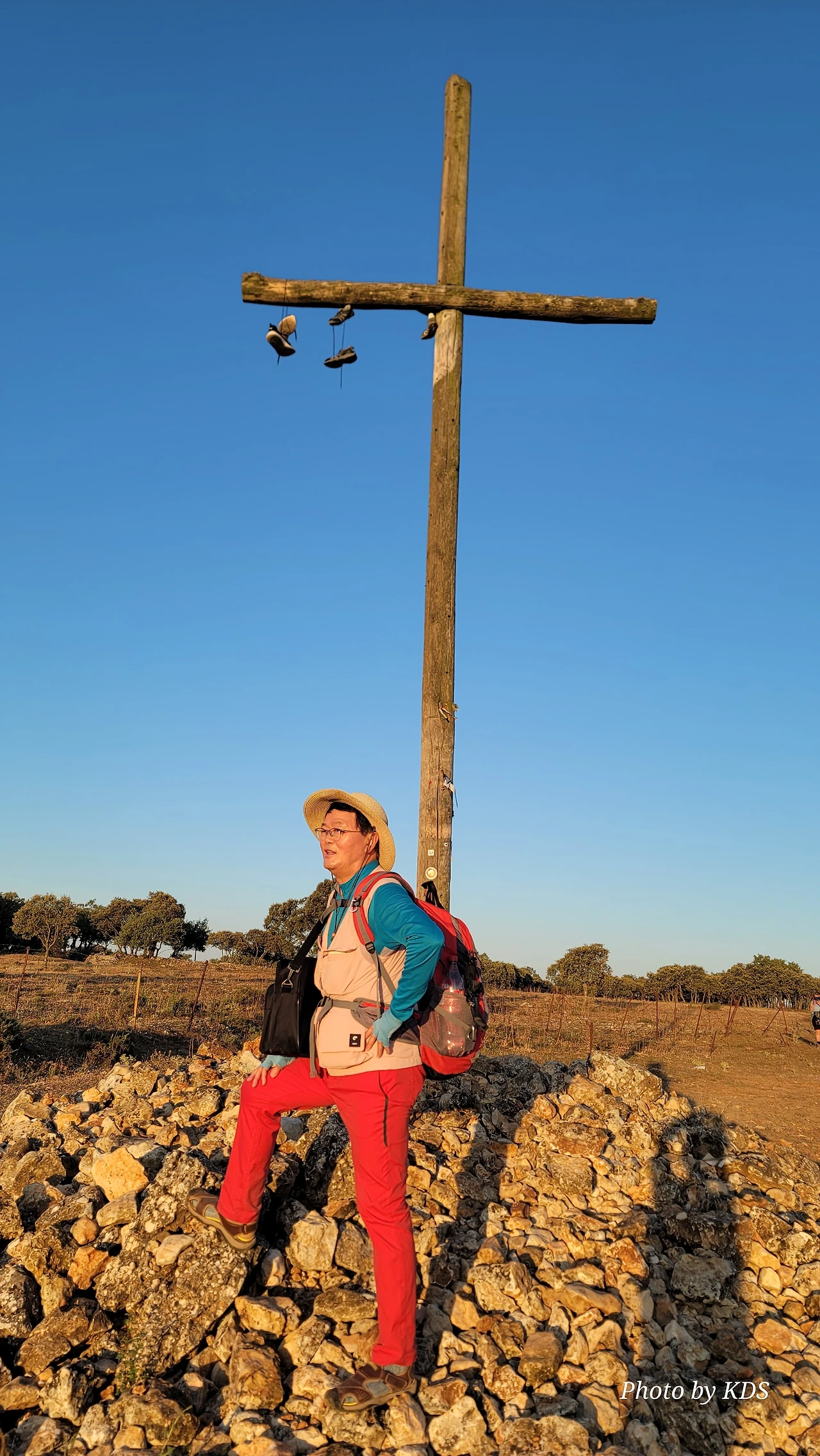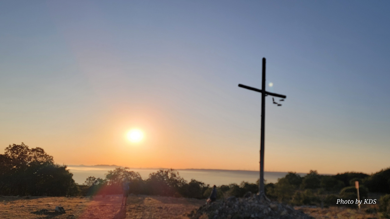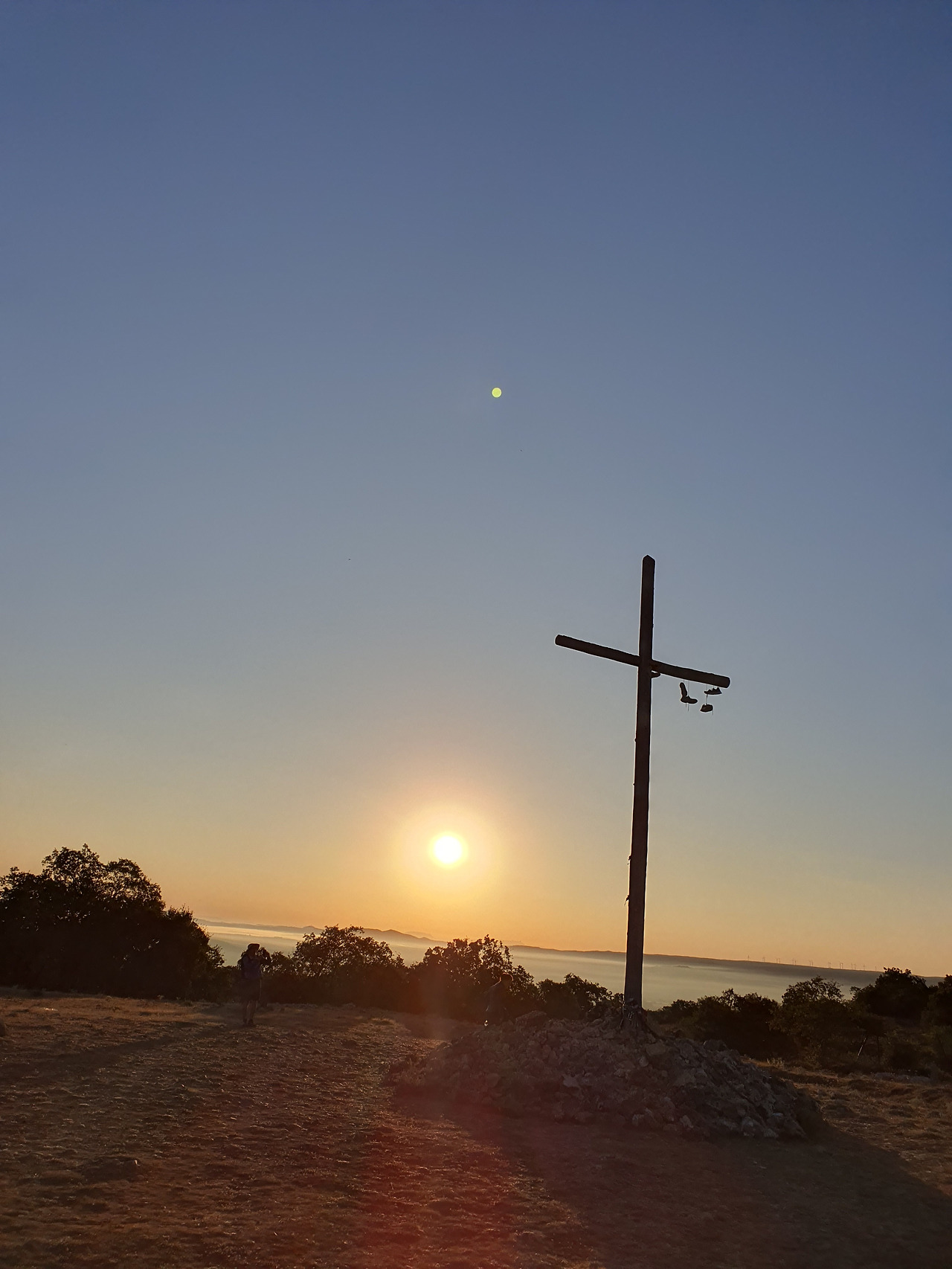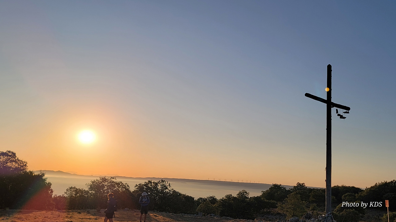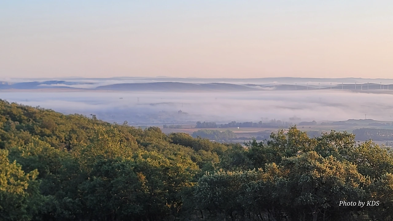 이 언덕은 떡갈나무와 여러 가지 나무 숲으로 이루어진 완만한 길이다. 돌길을 참으면 언덕을 올라 정상에 오르면 눈앞에 펼쳐져 있는 광활한 평원이 내려다보인다. 지금은 안개와 운무로 부르고스 쪽은 보이지 않고 그냥 운해(雲海)이다. 정상 부근에는 돌무더기에 나무로 만들어진 높다란 십자가상이 있었다. 먼저 온 순례객들이 돌무더기에 꿇어앉아서 간절히 기도하는 모습도 보였다. 고개를 숙이고 기도하는 사람도 있고 마음속으로 기도를 하는 사람도 있다. 동쪽으로 붉게 떠오르는 태양을 바라보며 소원을 빌기도 한다. 높다란 십자가에 누군가 등산화 두 켤레를 걸어 놓았다. 저렇게 높은 곳에 어떻게 등산화를 걸었을까? 저 멀리 우리가 가야 할 방향으로 또 다른 언덕이 보이고 그 언덕 위에 풍력발전기의 바람개비가 아스라이 보인다.