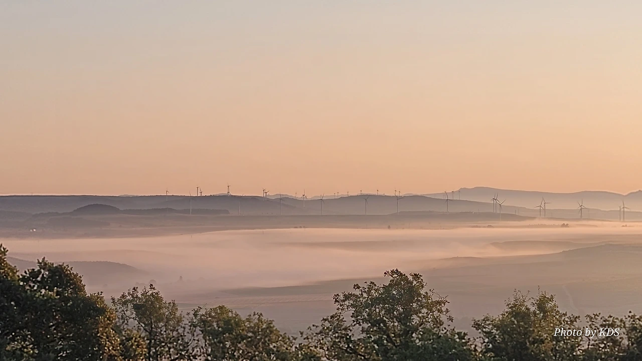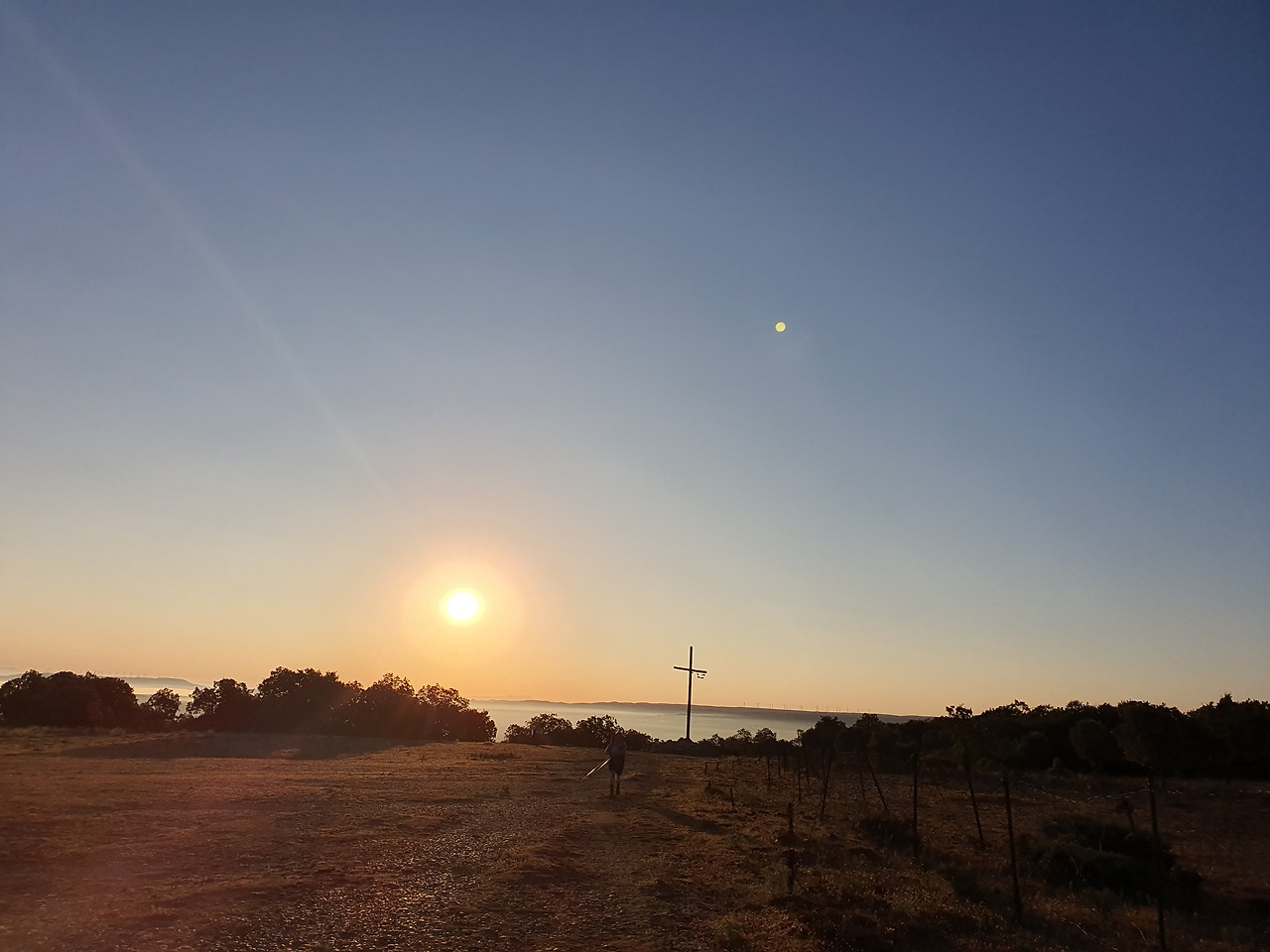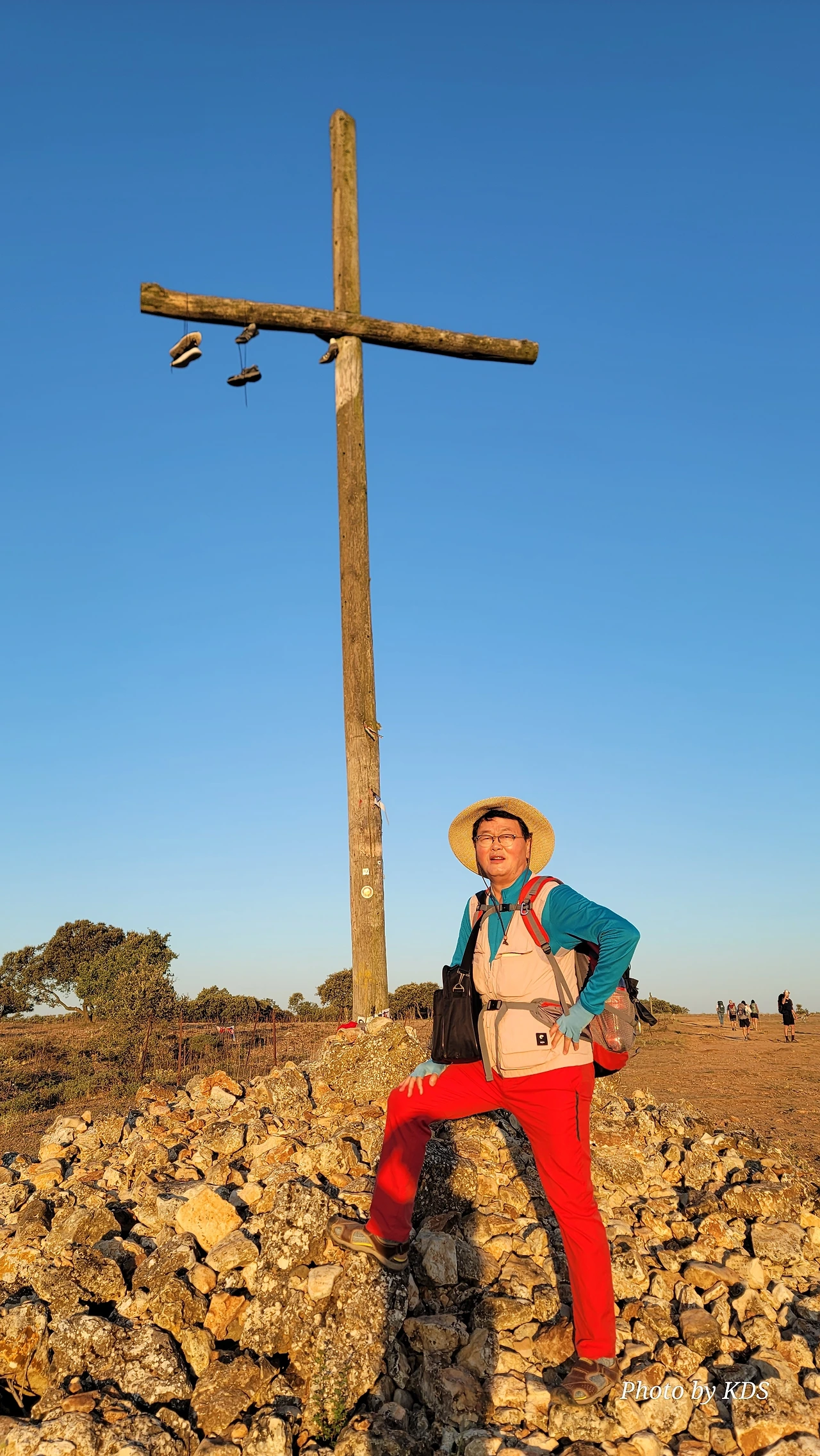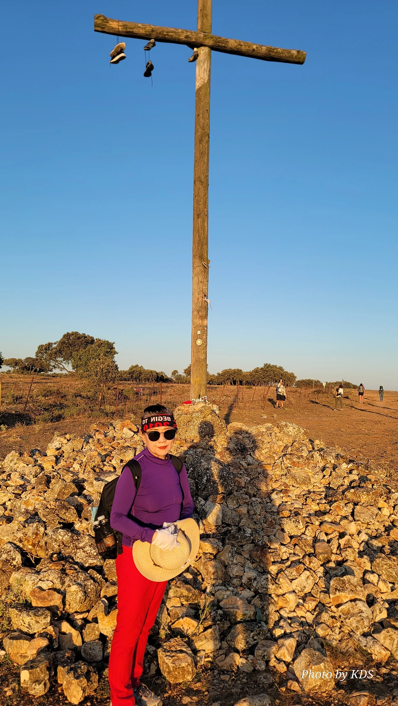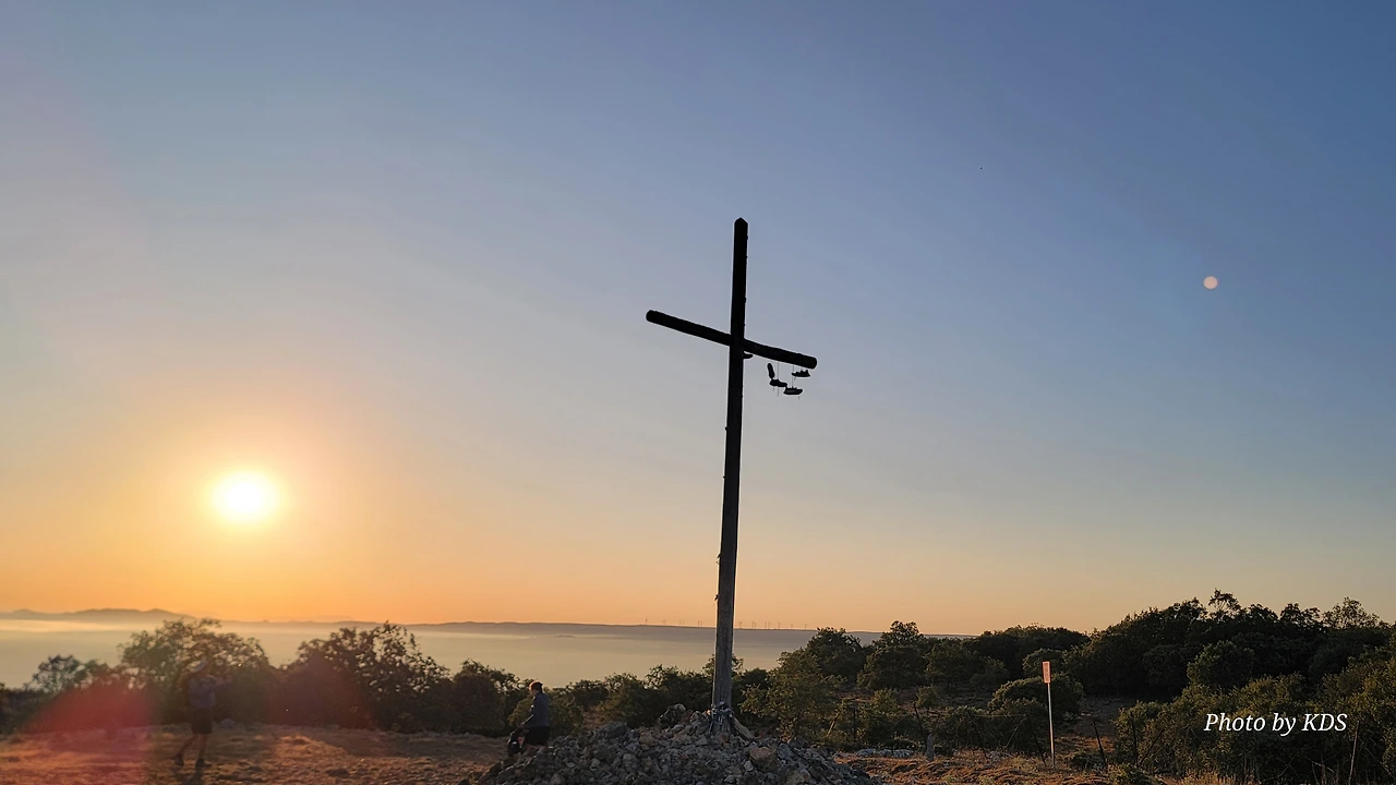 이 언덕은 떡갈나무와 여러 가지 나무 숲으로 이루어진 완만한 길이다. 돌길을 참으면 언덕을 올라 정상에 오르면 눈앞에 펼쳐져 있는 광활한 평원이 내려다보인다. 지금은 안개와 운무로 부르고스 쪽은 보이지 않고 그냥 운해(雲海)이다. 정상 부근에는 돌무더기에 나무로 만들어진 높다란 십자가상이 있었다. 먼저 온 순례객들이 돌무더기에 꿇어앉아서 간절히 기도하는 모습도 보였다. 고개를 숙이고 기도하는 사람도 있고 마음속으로 기도를 하는 사람도 있다. 동쪽으로 붉게 떠오르는 태양을 바라보며 소원을 빌기도 한다. 높다란 십자가에 누군가 등산화 두 켤레를 걸어 놓았다. 저렇게 높은 곳에 어떻게 등산화를 걸었을까? 저 멀리 우리가 가야 할 방향으로 또 다른 언덕이 보이고 그 언덕 위에 풍력발전기의 바람개비가 아스라이 보인다.