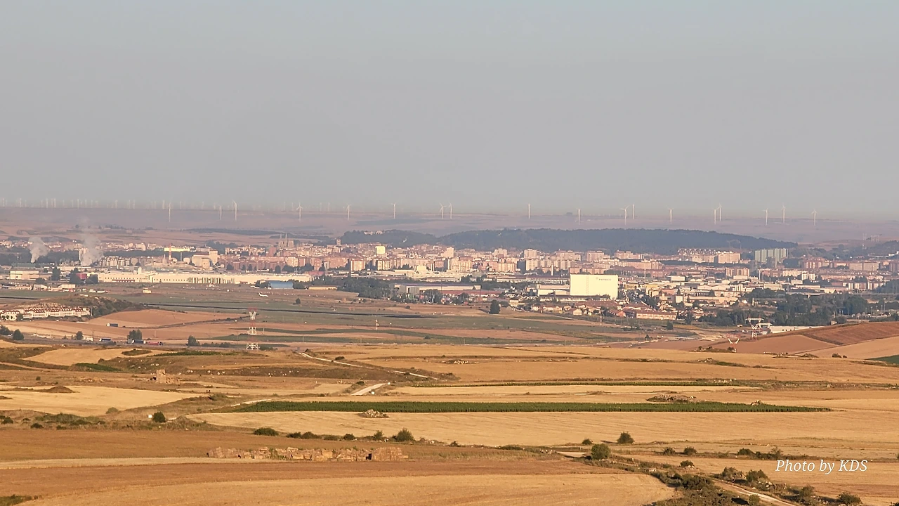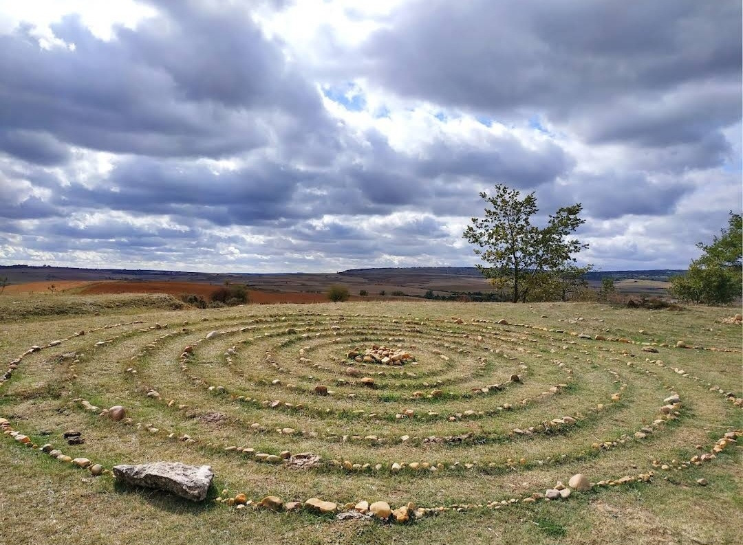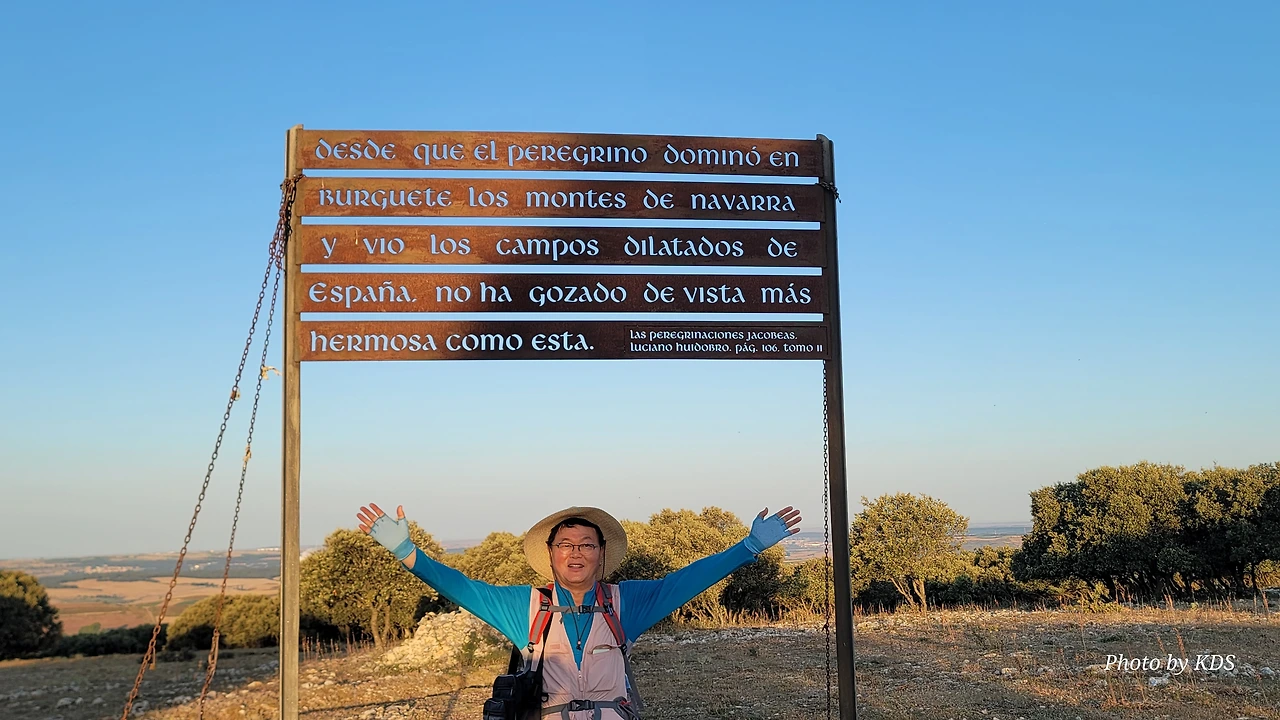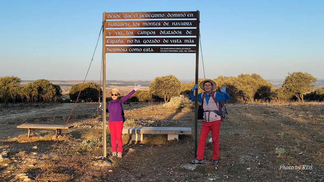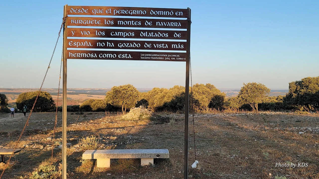 정상의 나무 십자가를 조금 지나서 걸음을 옮기면 전망대 겸 휴게소 지역(Mirador y Area de Descanso)이 나온다. 저 멀리 부르고스(Burgos)가 아스라이 보이는 언덕지대이다. 철제 간판에 스페인어로 긴 문장이 새겨져 있다. 스페인어를 잘 모르는데, 대충 순례자들이 나바라의 부르게테에서부터 여기까지 아름다운 평원을 본 적이 없을 것이란 뜻인가 보다. 하지만 오늘은 안개와 운무로 평원을 잘 보지는 못한다. 정상의 나무 십자가 옆으로 누군가 돌을 이용하여 동심원 같이 생긴 조형물을 만들어 놓은 것도 있다.