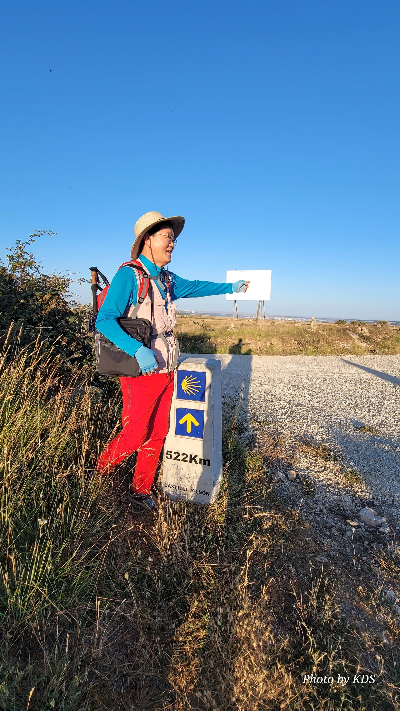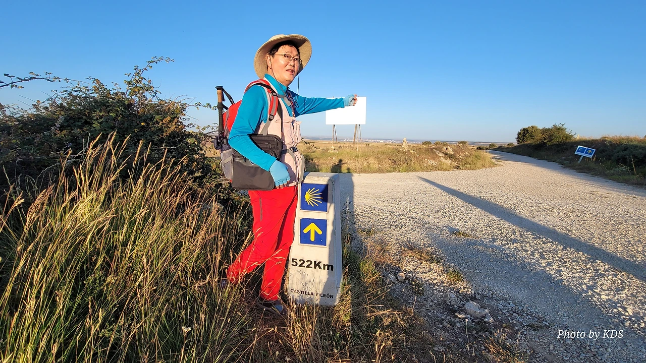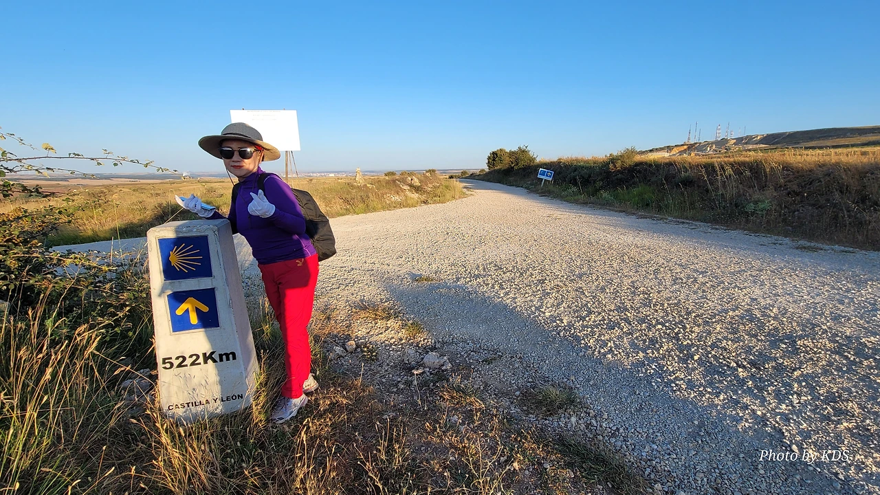 산티아고가 드디어 522Km 남았다는 이정표가 조선 과객을 반긴다. 저 멀리 보이는 부르고스는 잡힐 듯 보이지만 거기까지는 자그마치 20Km가 남았다. 평원의 길이 정말 사람을 미치게 하는 것이 바로 보이는데 가도 가도 끝이 없는 게 그것이다. 여기서부터는 내리막 길이고 돌들도 오르막을 올라올 때보다는 덜하다. 그런데 이런 길이 미끄럽기 때문에 다리가 약한 사람은 등산용 지팡이를 사용하면 좋다. 독일에서 온 부부가 십자가에서 같이 사진을 찍어주곤 했는데 내리막길은 자신이 없는지 엉금거리면서 먼저 가란다. 그들을 뒤로하고 내리막을 내려오는데 지도상으로는 비얄발(Villalval) 마을이 있는데, 눈에 띄지 않고 그냥 지나친 모양이다. 아따부에르까(Atapuerca) 마을에서 4Km 정도의 거리지만 중간에 언덕이 있어서 시간이 좀 더 지체되었다.