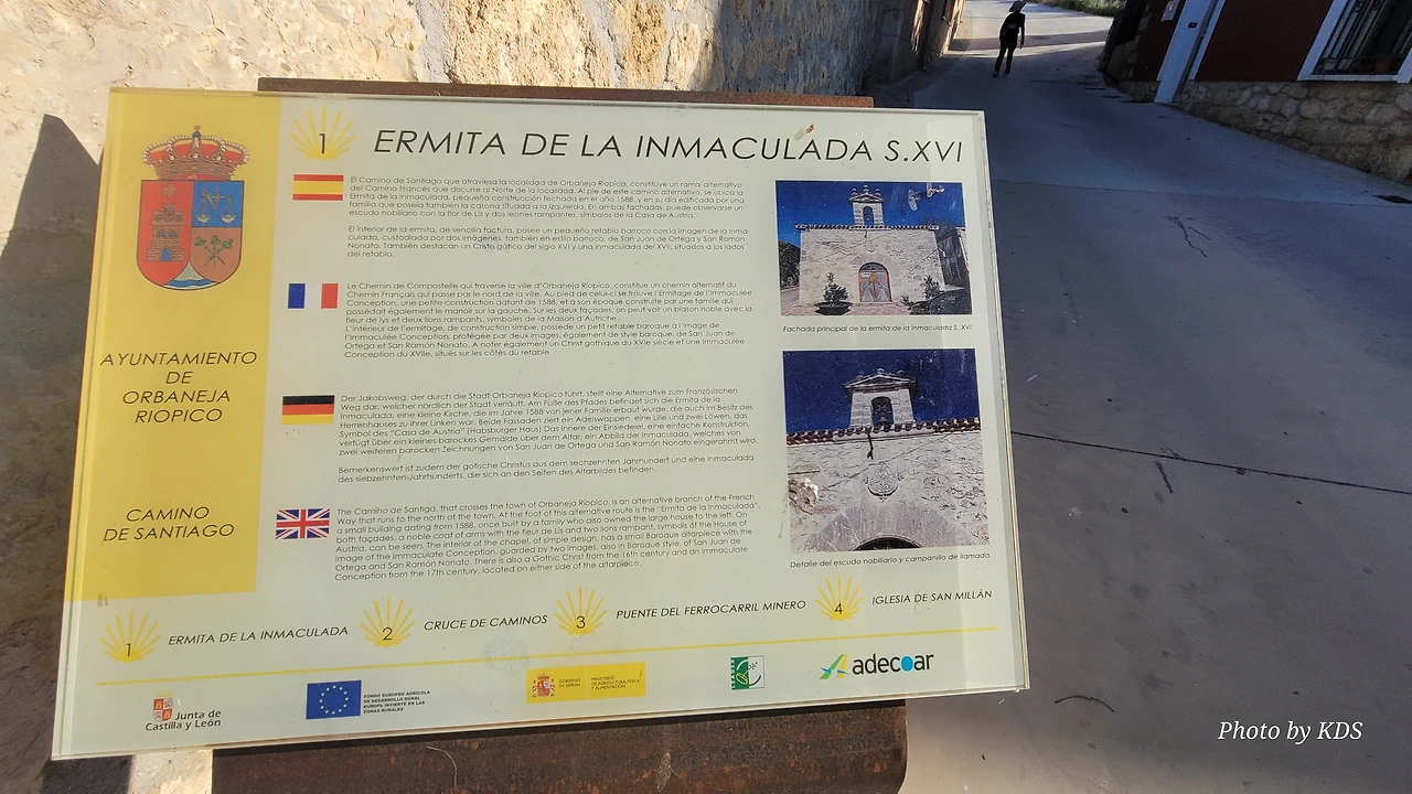 오르바네하 리오삐코(Orbaneja Riopico)는 오늘 아침에 아헤스(Ages)를 출발하여 네 번째 들리는 마을이다. 걸은 거리는 11Km 조금 더 되는 거리다. 아주 작고 조용한 마을이다. 마을과 농경지가 붙어있어서 완전 농촌 마을인데, 마을 중앙으로 난 순례길을 따라 걸으니 인적이 없다. 조용한 마을의 집집마다 담장 위에 각종 동물 모양의 조형물을 만들어서 올려 두었다. 지나가는 순례객의 위안이 되라고 한 것인가 보다. 이 마을은 규모가 작아서 순례객을 위한 알베르게도 침상 18개의 숙소 하나밖에 없다. 특별히 둘러볼 게 없어서 그냥 지나가기로 한다.