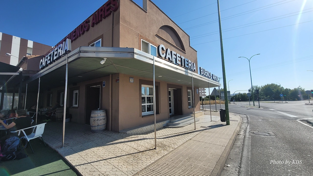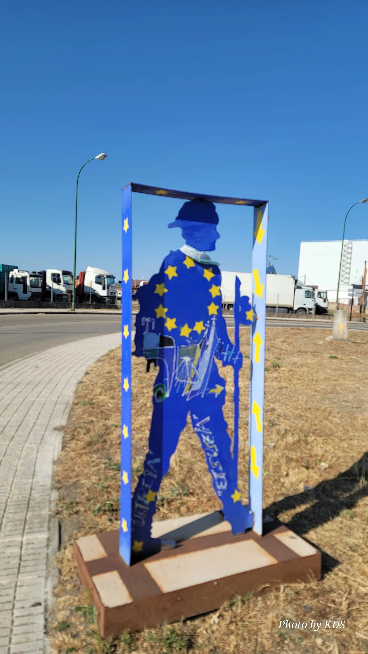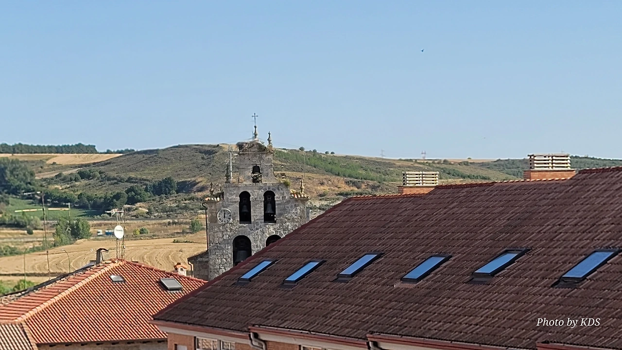 완만한 내리막길은 주변에 밀밭으로 이어져 있다. 군데군데 민가들이 가끔 보이고, 계속되는 벌판이다. 14km 정도를 걸어오니 부르고스(Burgos)를 약 10Km 정도 남겨두고 제법 현대화된 마을이 나타난다. 비야프리아(Villafria) 마을이다. 아스팔트 길이라서 걷는데 별로 어려움이 없다. 아스팔트 길은 정말 비단길을 걷는 것 같다. 마을 어귀에 부에노스 아이레스(Buenos Aires)라는 제법 큰 호텔과 카페티리아가 우리를 반긴다. 목도 마르고 배도 고픈 시간이다. 여기서 점심 요기를 하고 가야겠다. 음식점에 들어가 음료를 시키고 간단한 요기를 한다. 화장실 문제도 해결한다. 여기서부터 부르고스까지 가는 길은 여러 갈래가 있다. 원래의 시골길인 순례길이 있고, 차량들이 다니는 시끄러운 도로가 있다. 시골길은 걷기도 불편하고 거리가 2-3Km 정도 더 멀다. 아스팔트 길은 거리도 가깝고 걷기도 편안하다. 그러나 옆으로 차량이 소음을 내면서 쌩쌩 달리기 때문에 위험하다. 어느 길을 택할 것인가 고민을 하다가 한 시간이라도 부르고스에 빨리 도착하여 깨진 스마트폰 액정을 수리하는 것이 좋겠다는 결론이다. 급한 마음에 마을의 성당에도 들리지 않고 아스팔트 포장도로를 따라 무작정 부르고스 방향으로 걸었다. 길에서 멀리 보이는 수도원 건물 지붕과 성당의 종탑을 카메라에 담아본다.